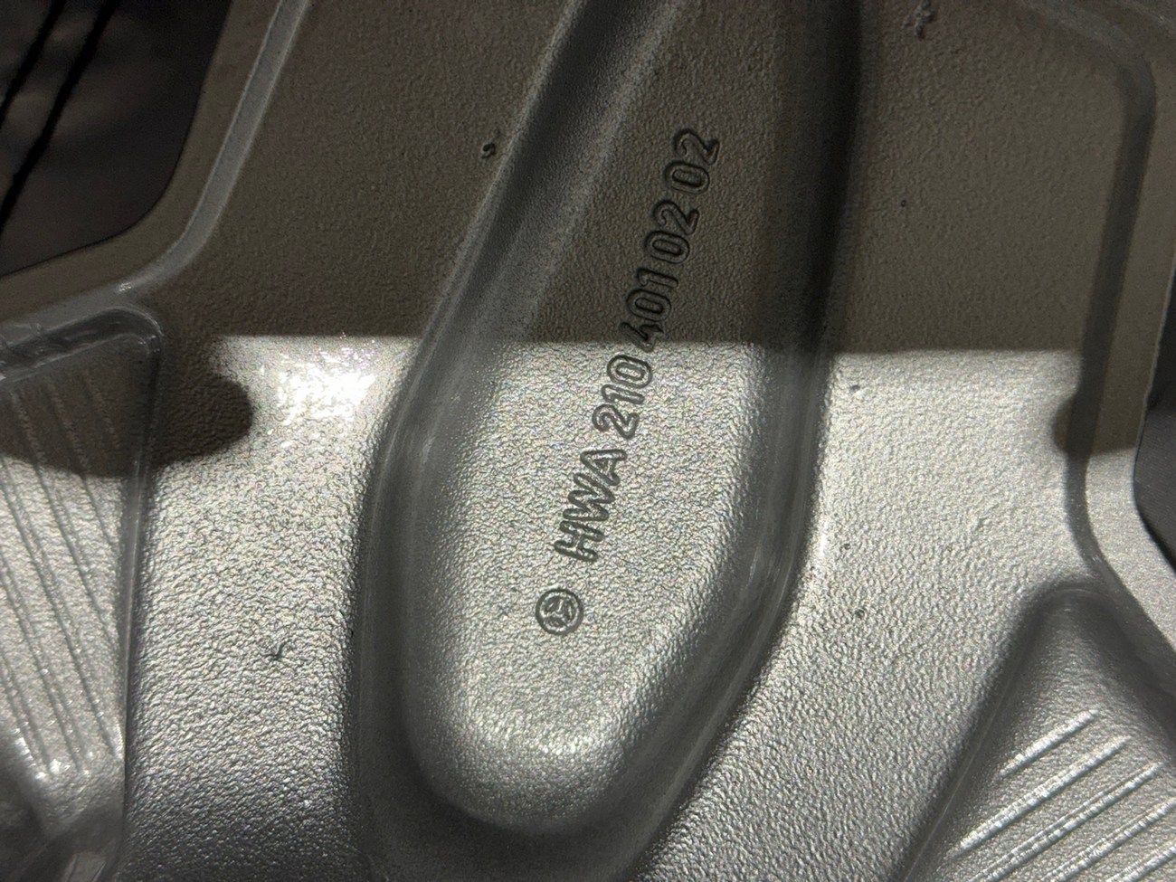 The front wheels measure 8" wide with an offset of +31 showing part number HWA129 401 01 02. The rear wheels measure 9" wide with an offset of +35 with part number HWA210 401 02 02. These are the factory part numbers used for both the W210 E55 and R129 chassis.