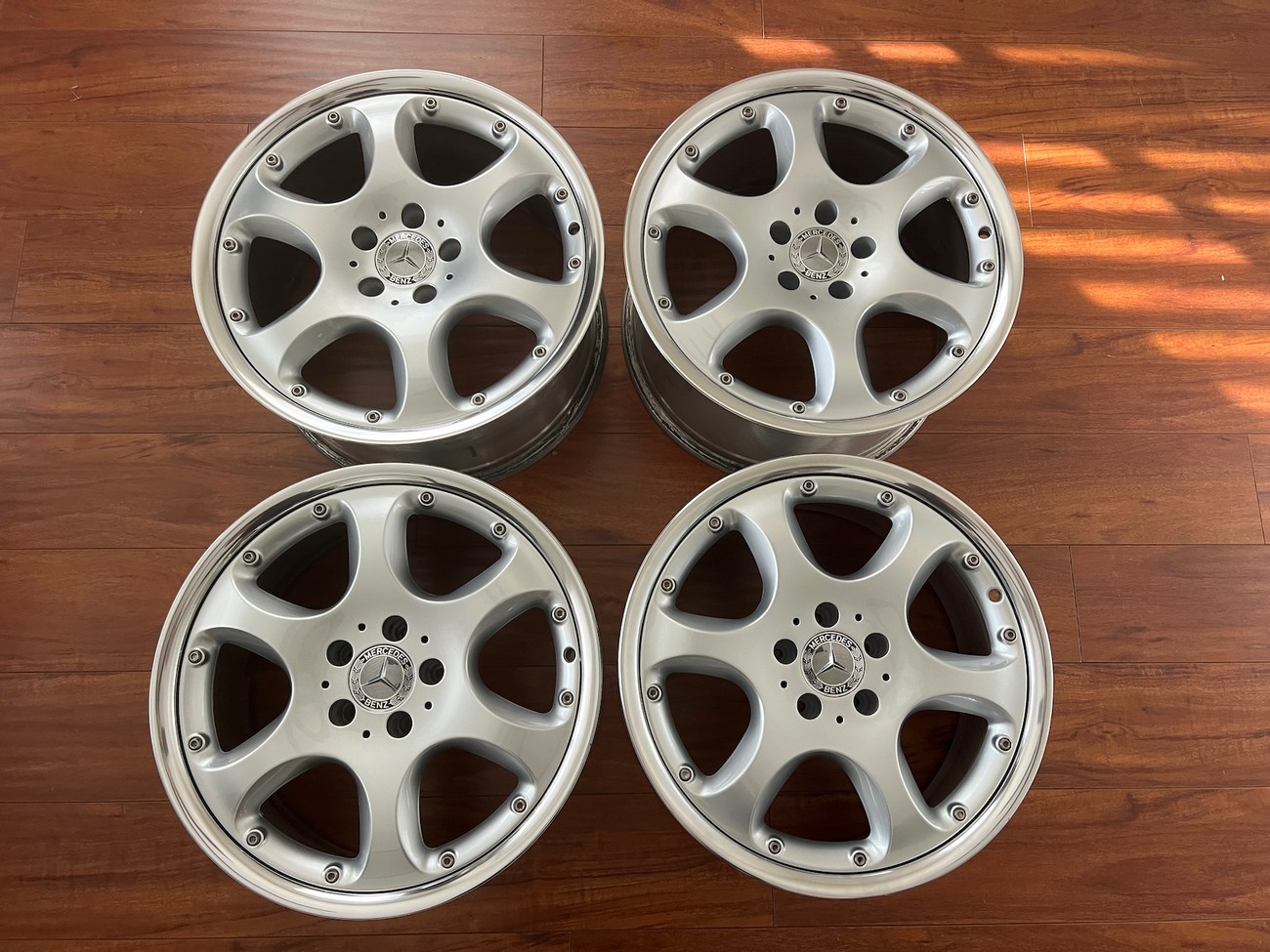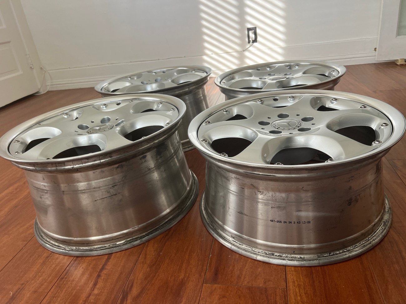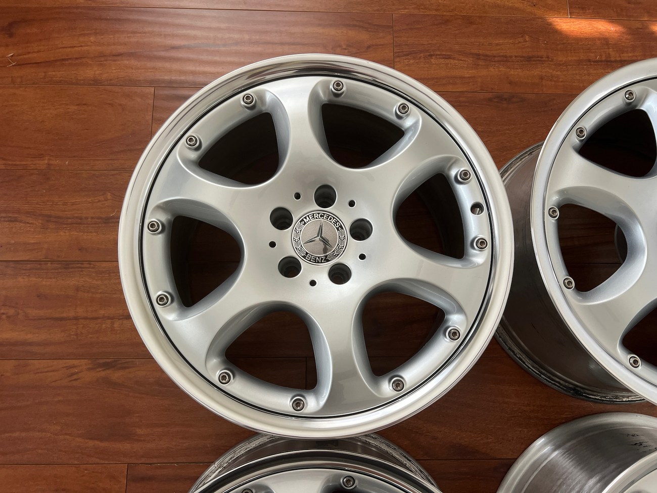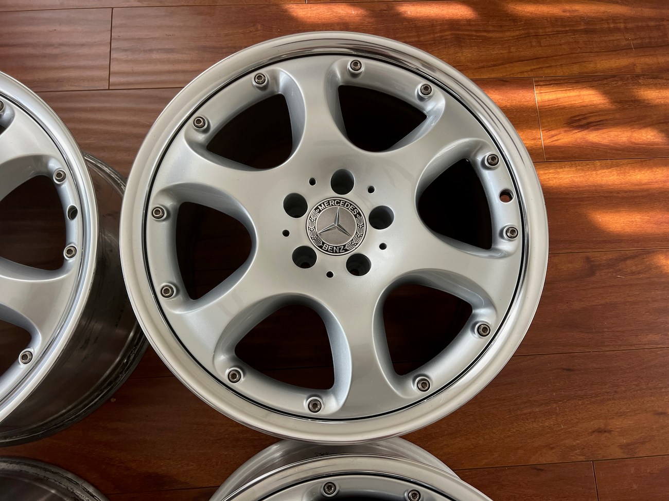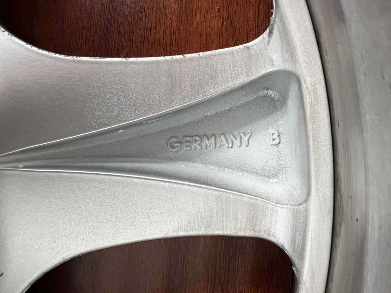 These staggered 18″ Silver Arrow wheels measure 8.5″ wide up front and 9.5" in the rear and were manufactured in Germany by BBS for use on Mercedes-Benz R129 Silver Arrow SL's. The faces are finished in Silver and show BBS as the manufacturer along with stamped part numbers on the back. Dimensions, offsets, and other manufacturer casting marks are present on each wheel and four OEM Mercedes-Benz center caps are included. Each wheel has been professionally refinished in preparation for the sale and show in excellent condition. These Mercedes-Benz wheels are now offered by the seller in Los Angeles, California.