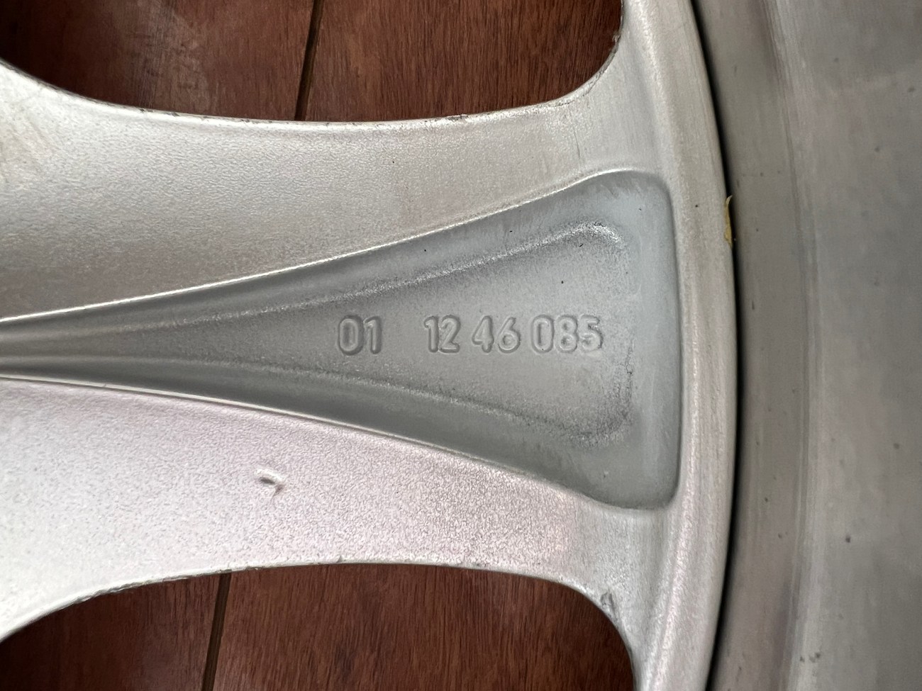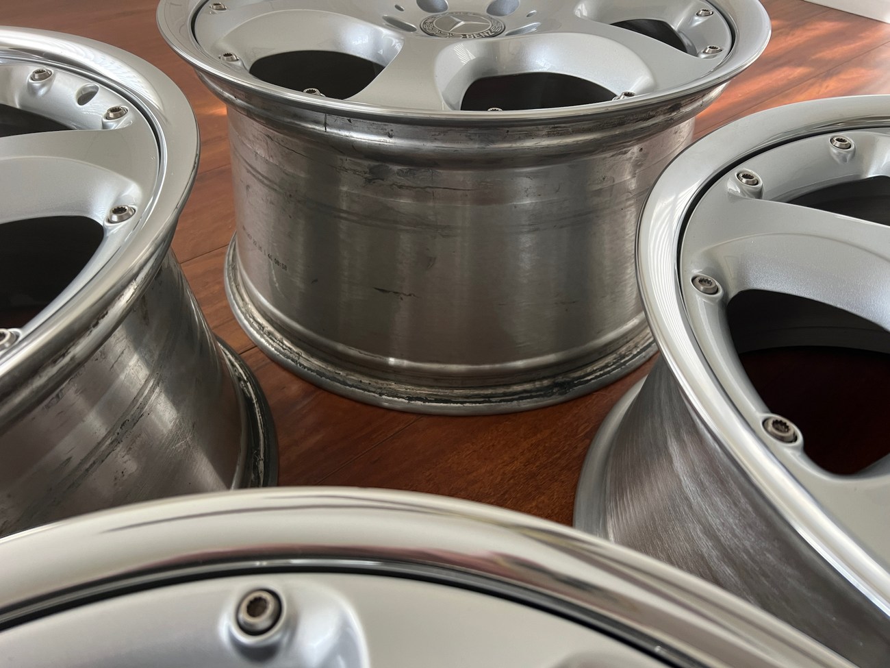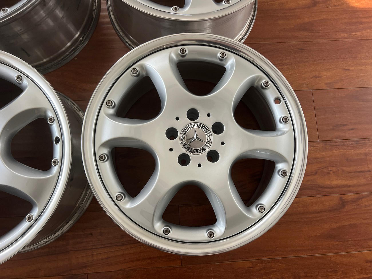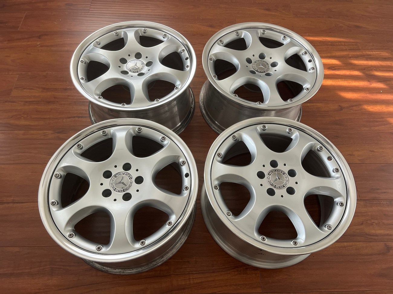 These staggered 18″ Silver Arrow wheels measure 8.5″ wide up front and 9.5" in the rear and were manufactured in Germany by BBS for use on Mercedes-Benz R129 Silver Arrow SL's. The faces are finished in Silver and show BBS as the manufacturer along with stamped part numbers on the back. Dimensions, offsets, and other manufacturer casting marks are present on each wheel and four OEM Mercedes-Benz center caps are included. Each wheel has been professionally refinished in preparation for the sale and show in excellent condition. These Mercedes-Benz wheels are now offered by the seller in Los Angeles, California.