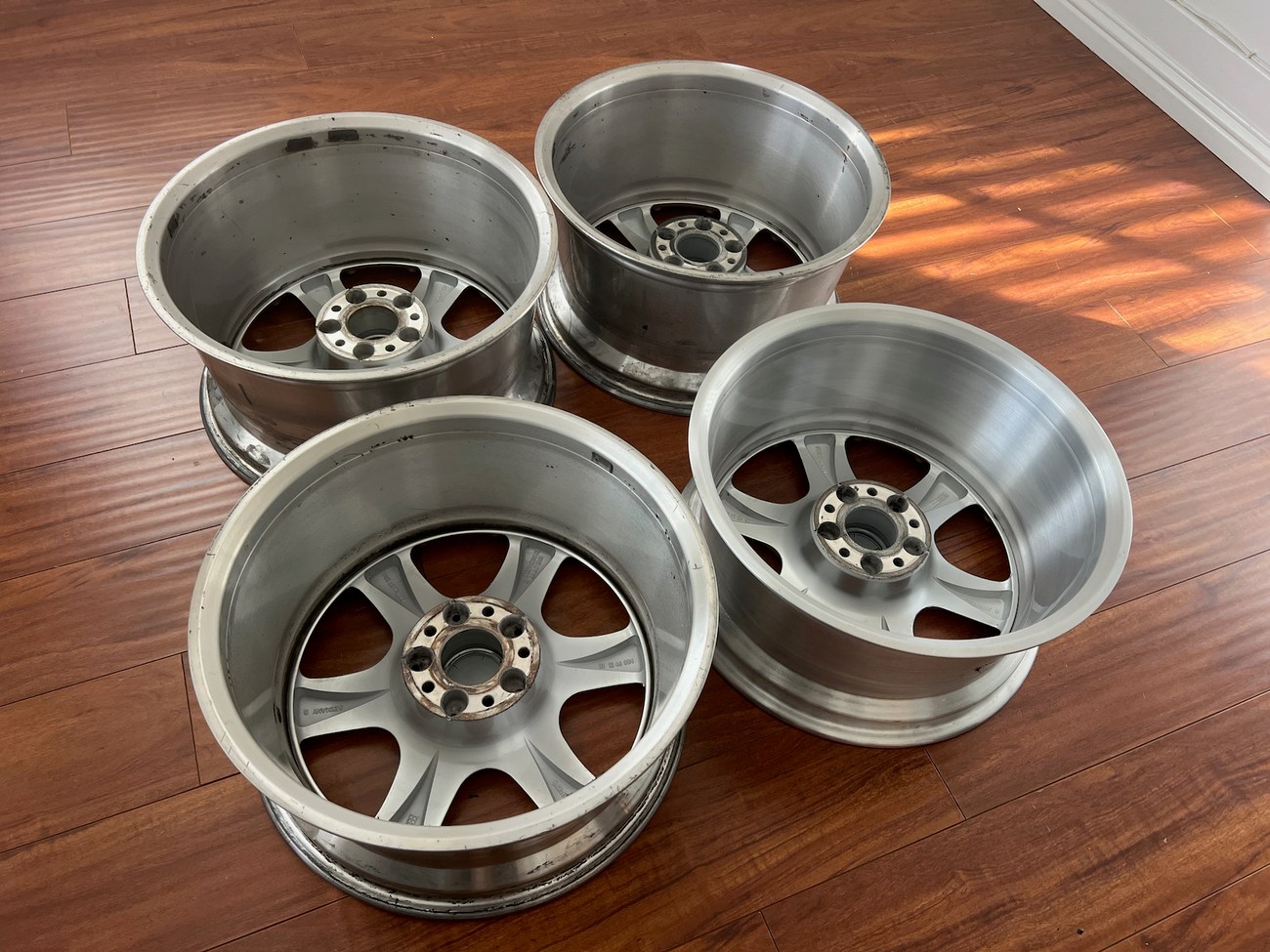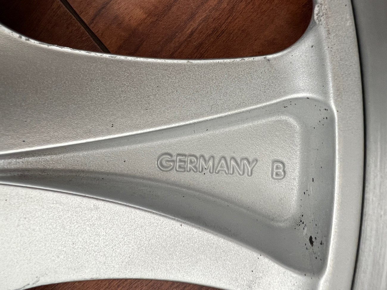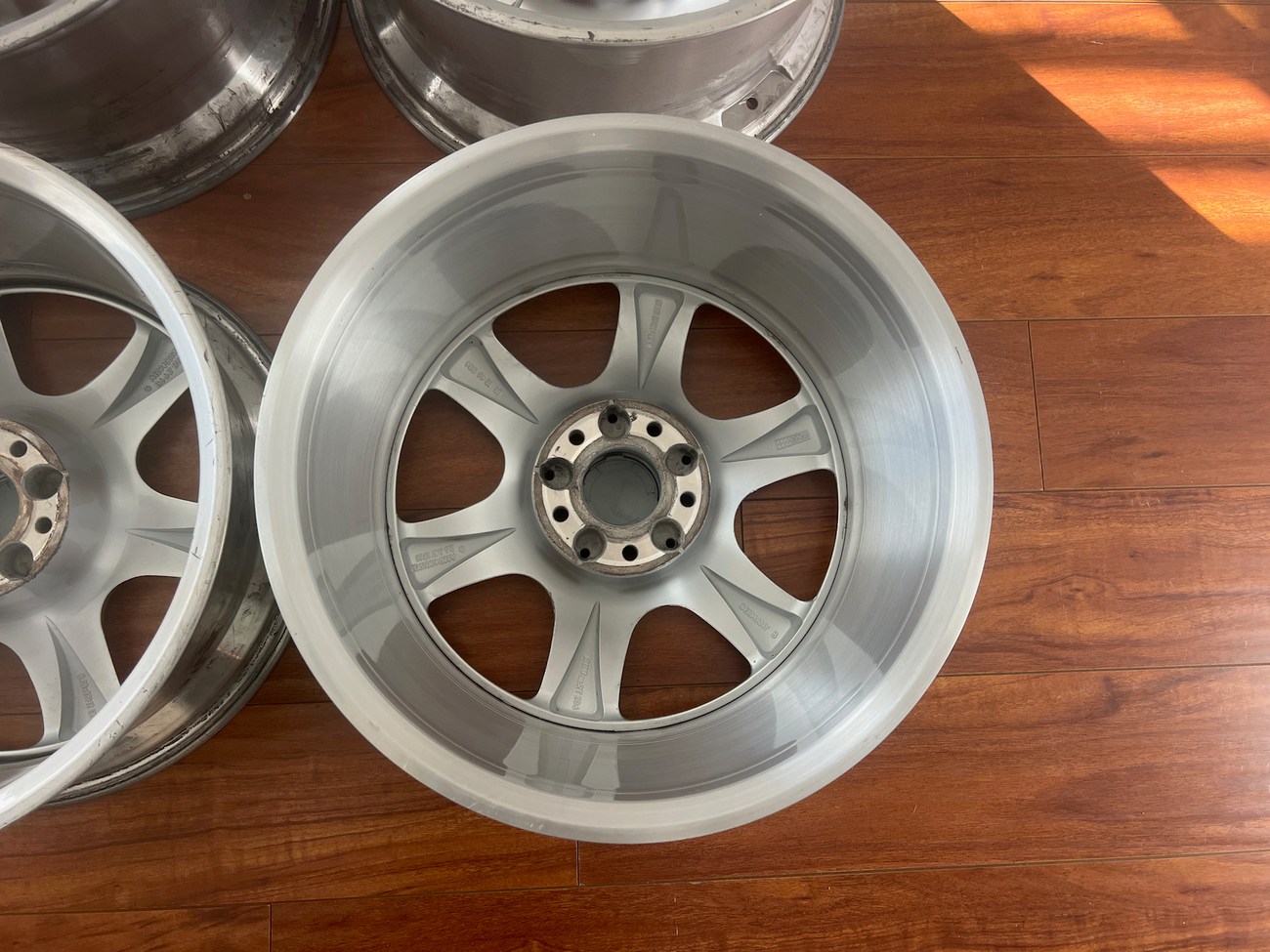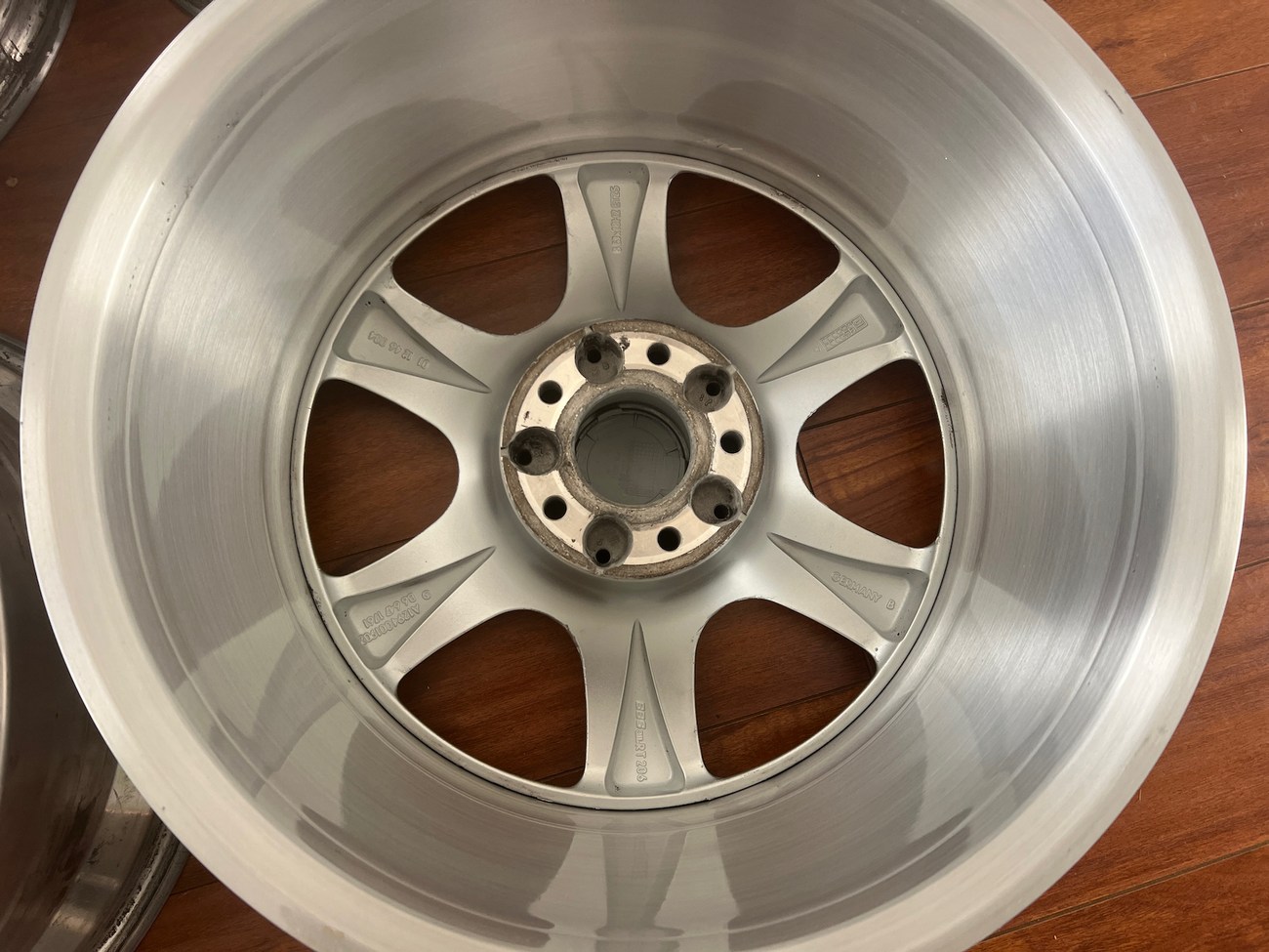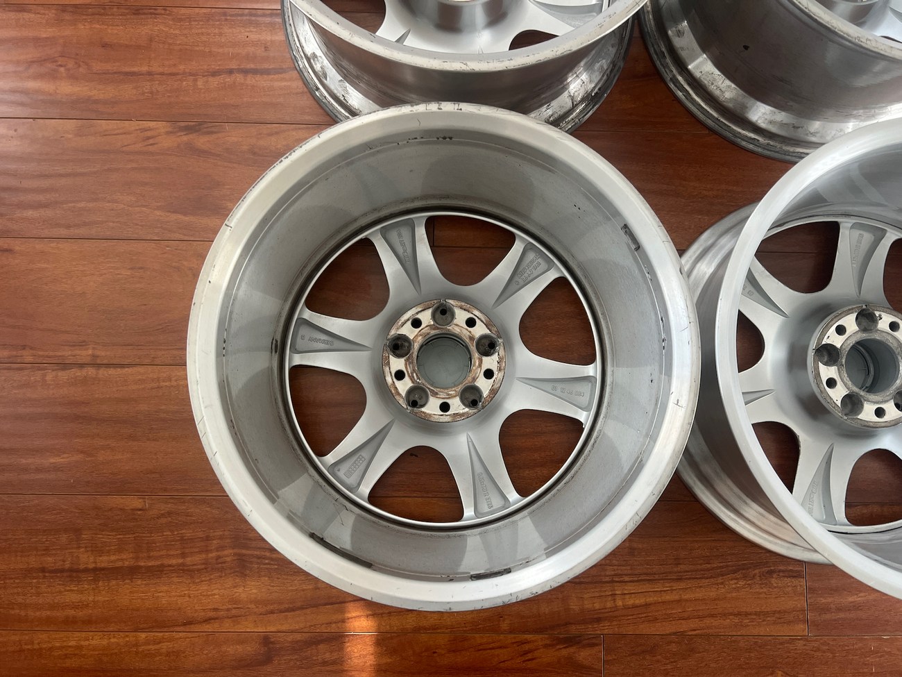 These staggered 18″ Silver Arrow wheels measure 8.5″ wide up front and 9.5" in the rear and were manufactured in Germany by BBS for use on Mercedes-Benz R129 Silver Arrow SL's. The faces are finished in Silver and show BBS as the manufacturer along with stamped part numbers on the back. Dimensions, offsets, and other manufacturer casting marks are present on each wheel and four OEM Mercedes-Benz center caps are included. Each wheel has been professionally refinished in preparation for the sale and show in excellent condition. These Mercedes-Benz wheels are now offered by the seller in Los Angeles, California.