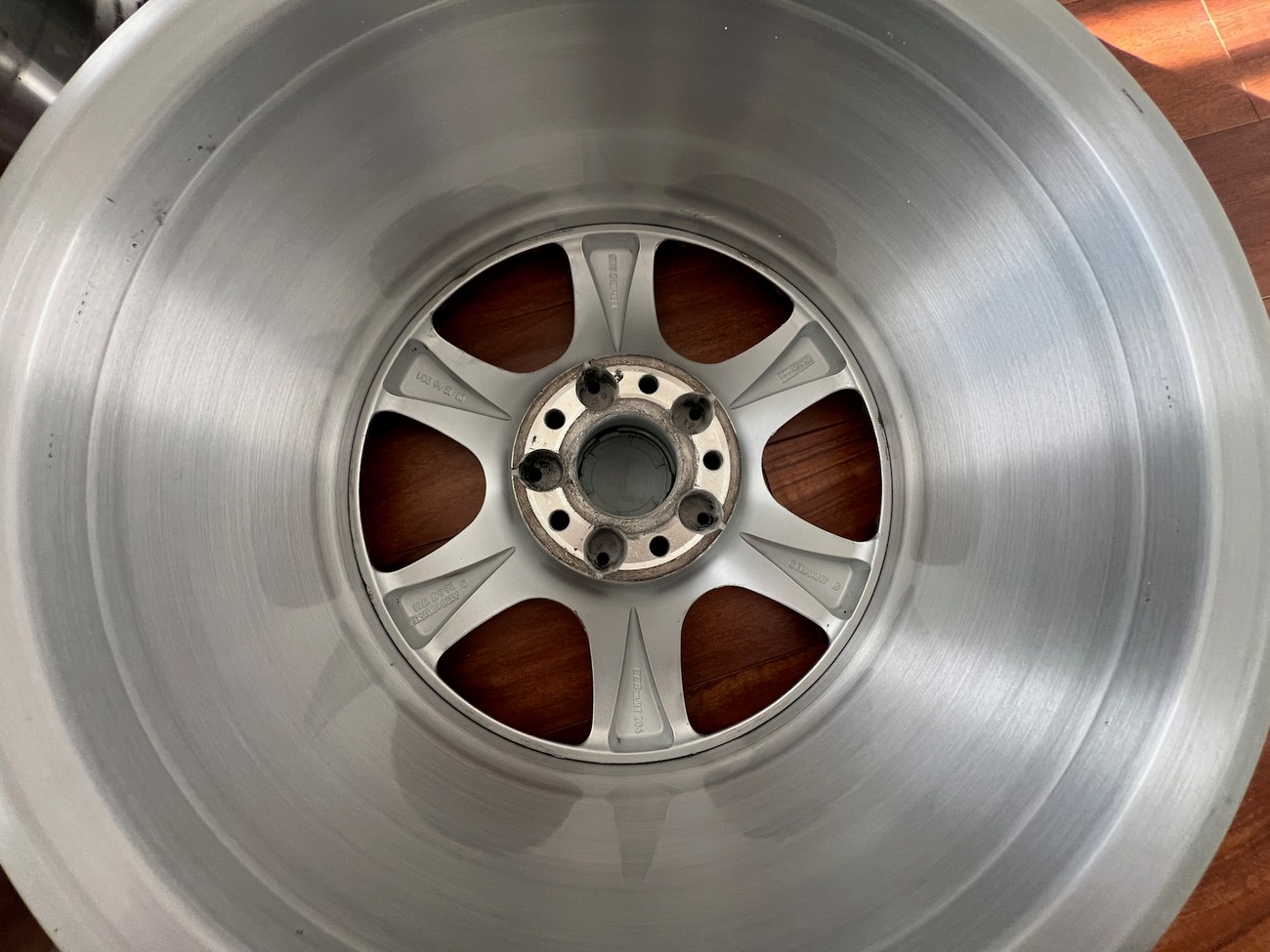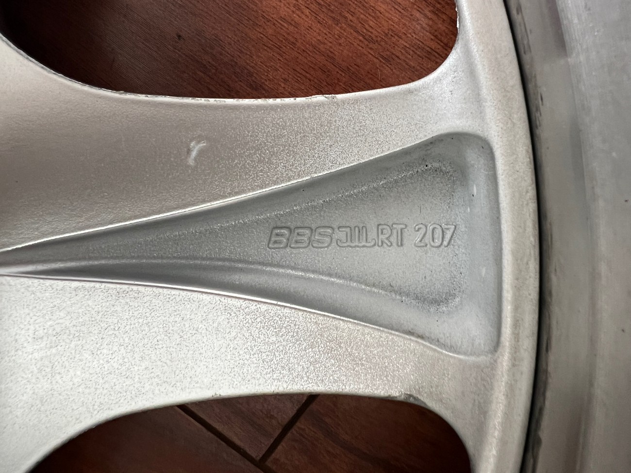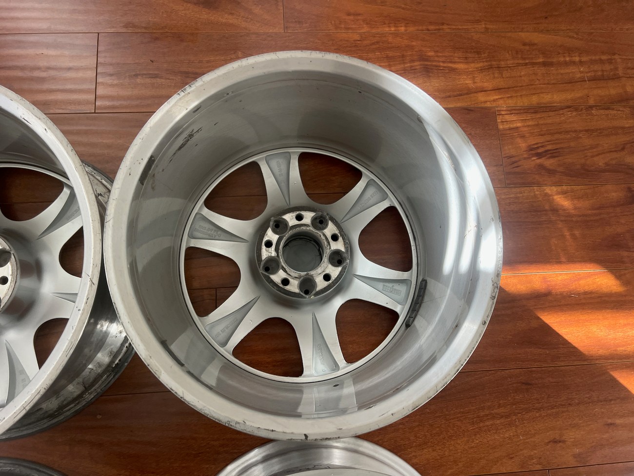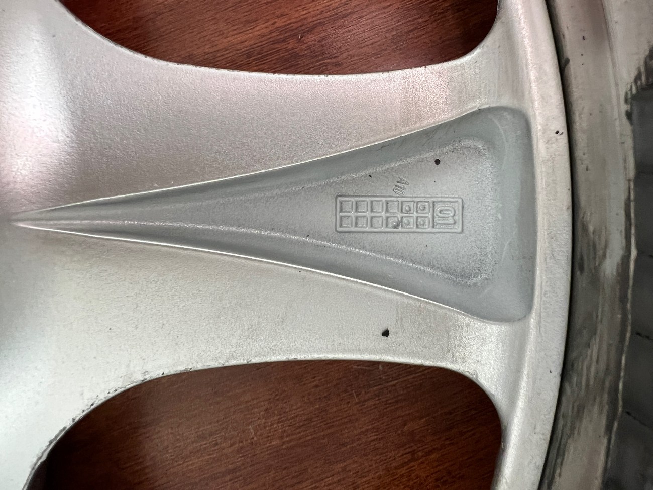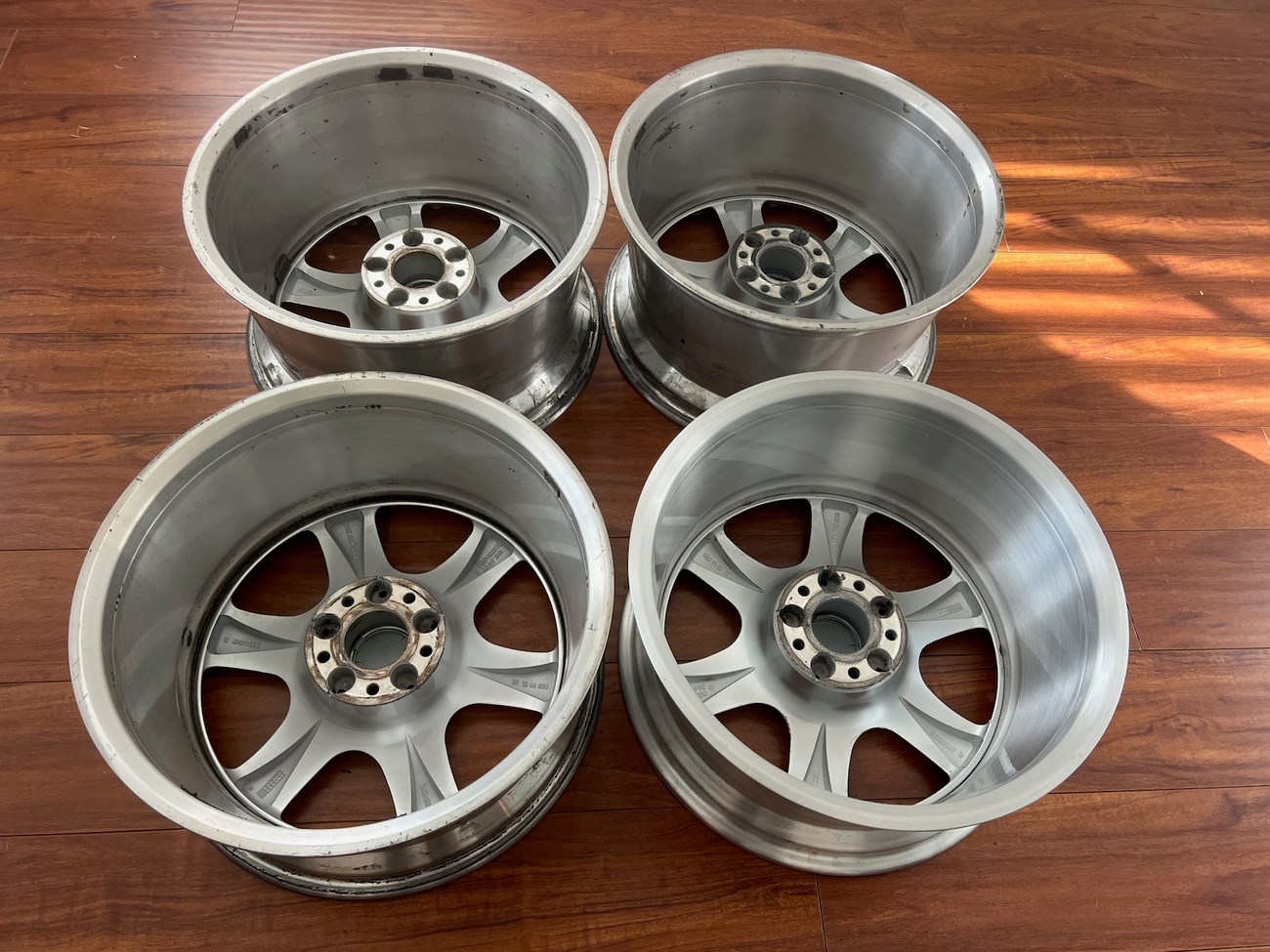 These staggered 18″ Silver Arrow wheels measure 8.5″ wide up front and 9.5" in the rear and were manufactured in Germany by BBS for use on Mercedes-Benz R129 Silver Arrow SL's. The faces are finished in Silver and show BBS as the manufacturer along with stamped part numbers on the back. Dimensions, offsets, and other manufacturer casting marks are present on each wheel and four OEM Mercedes-Benz center caps are included. Each wheel has been professionally refinished in preparation for the sale and show in excellent condition. These Mercedes-Benz wheels are now offered by the seller in Los Angeles, California.