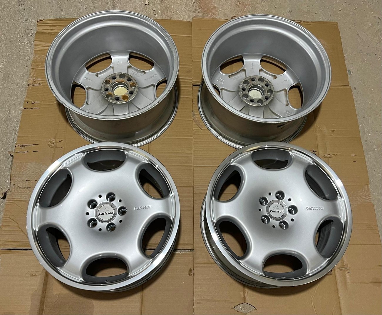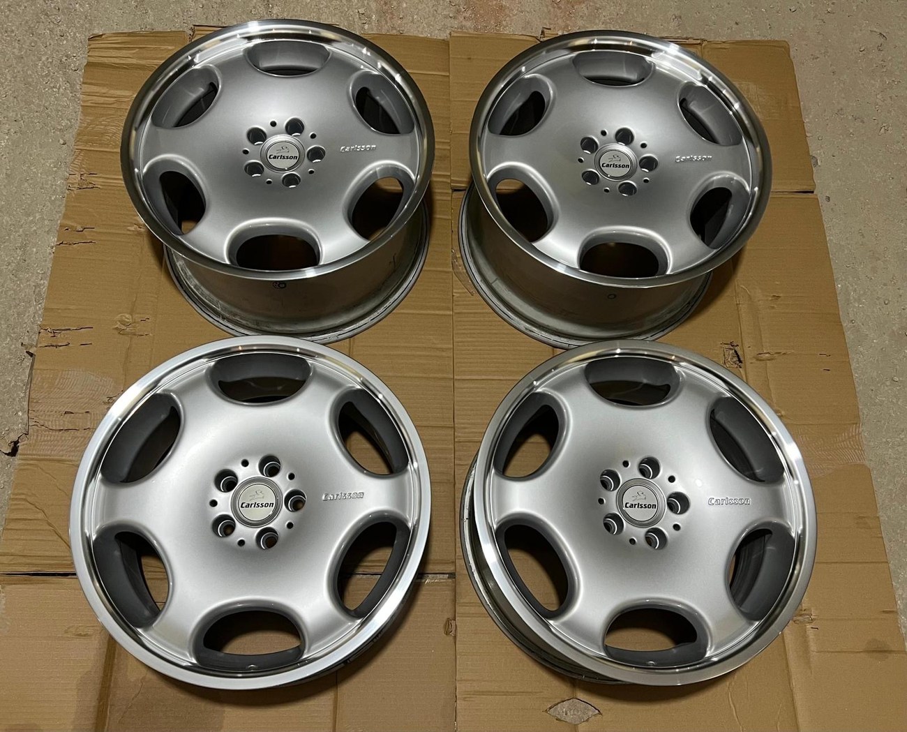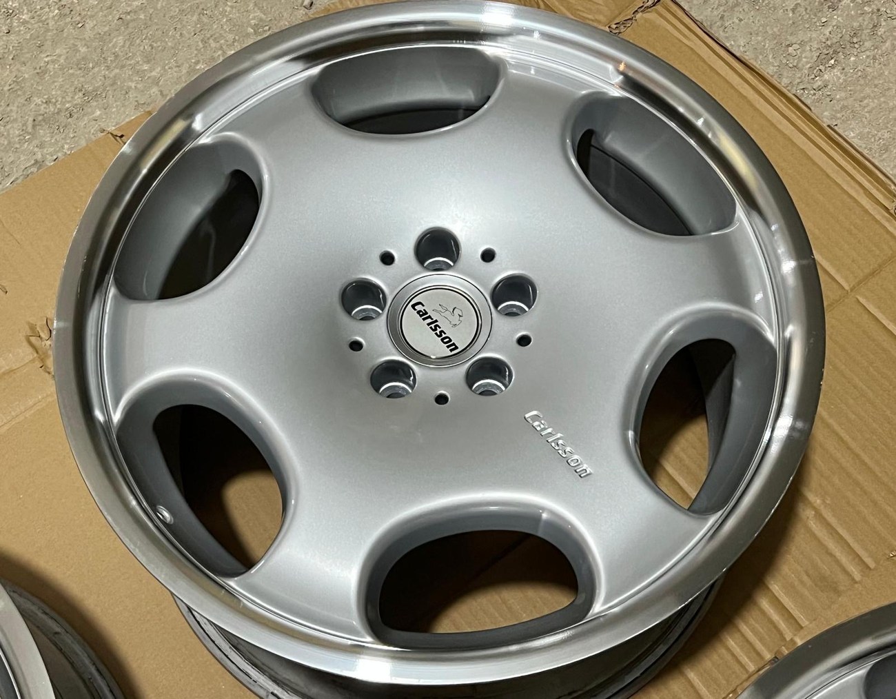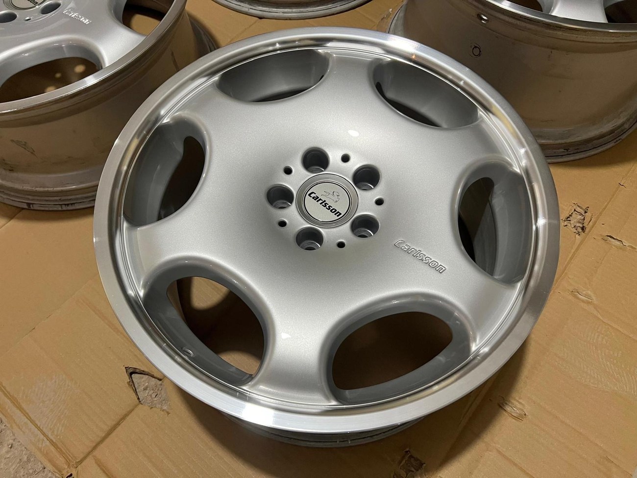 The monicker 1/6 denotes a single or “one-piece” construction with six spokes. The wheels have been professionally refinished in silver with polished lips. The wheels show no scrapes or other imperfections on the faces or lips. Authentic Carlsson center caps are installed and included. Close-up photos showing the condition of the wheels are provided in the gallery.