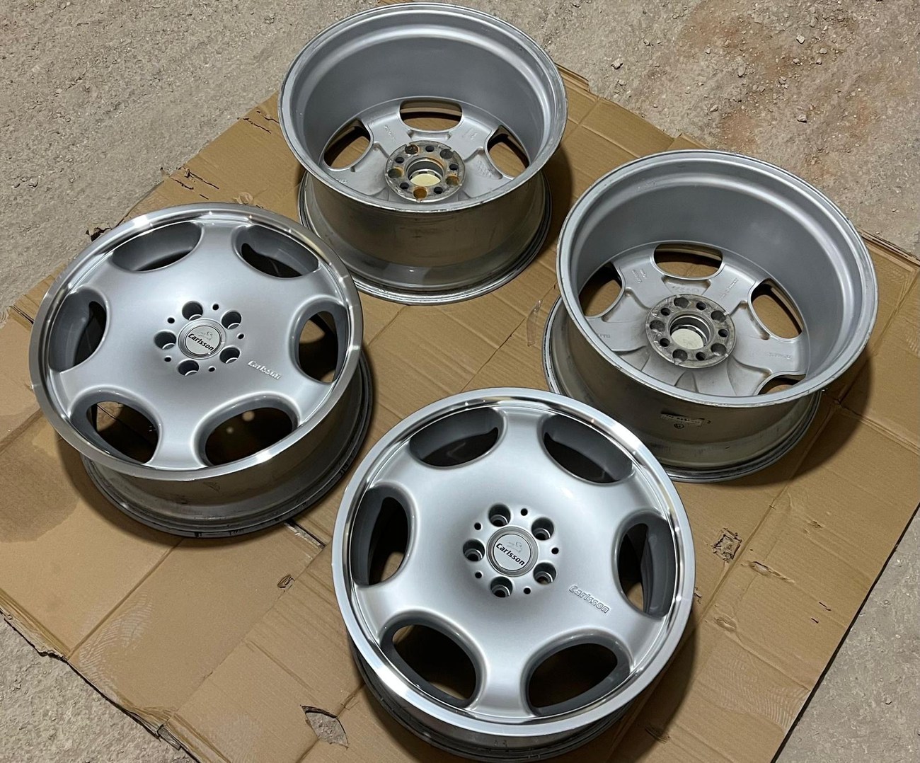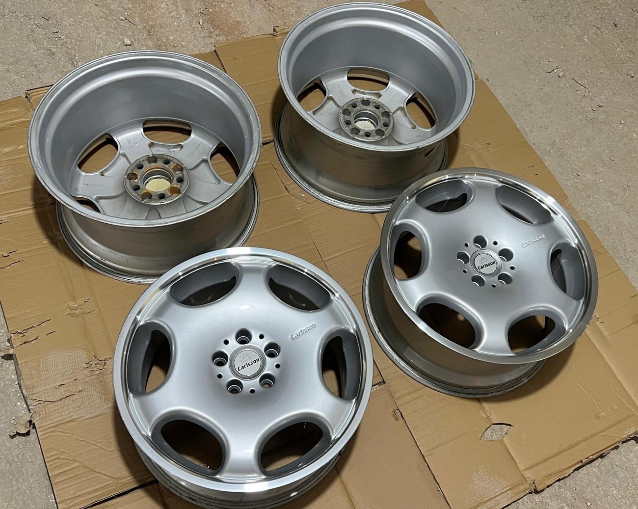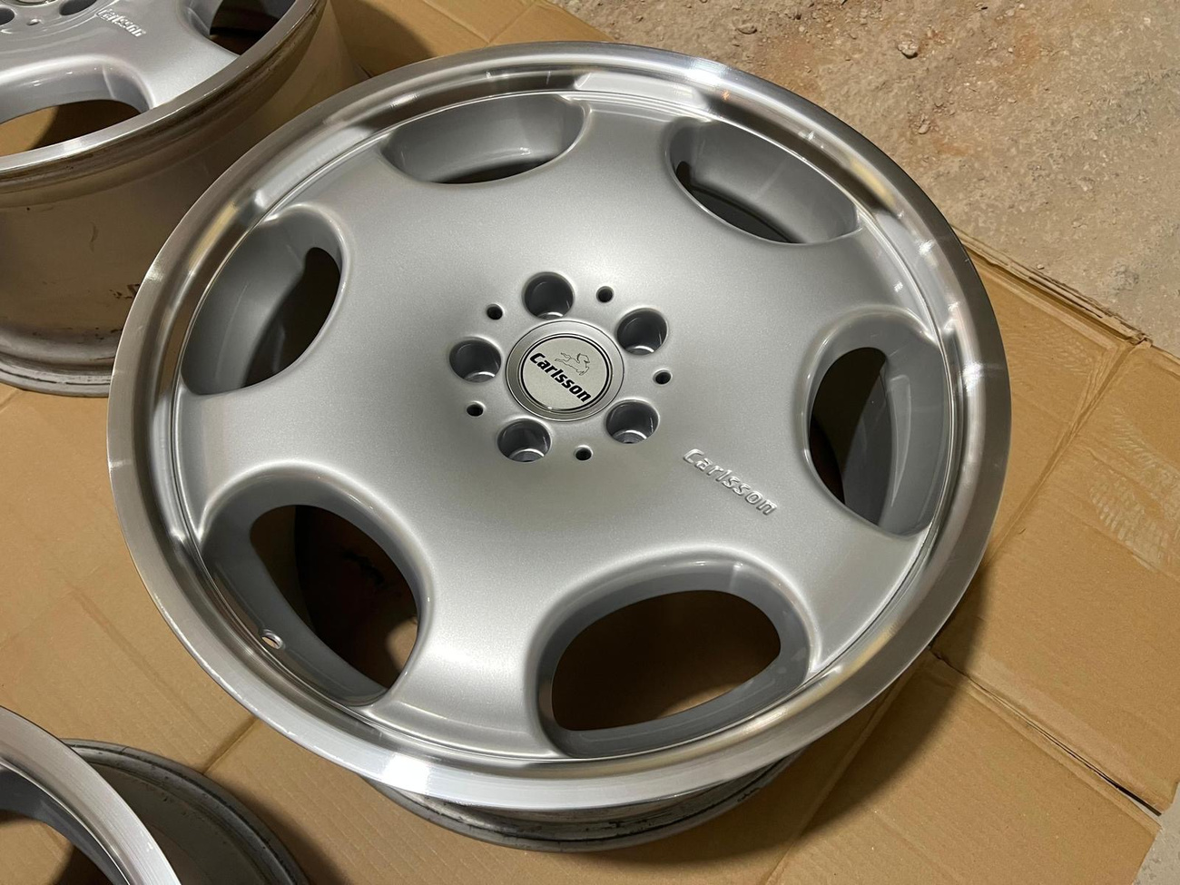 The monicker 1/6 denotes a single or “one-piece” construction with six spokes. The wheels have been professionally refinished in silver with polished lips. The wheels show no scrapes or other imperfections on the faces or lips. Authentic Carlsson center caps are installed and included. Close-up photos showing the condition of the wheels are provided in the gallery.