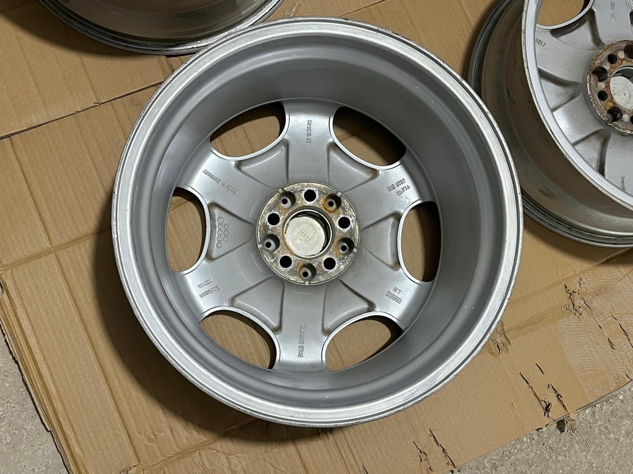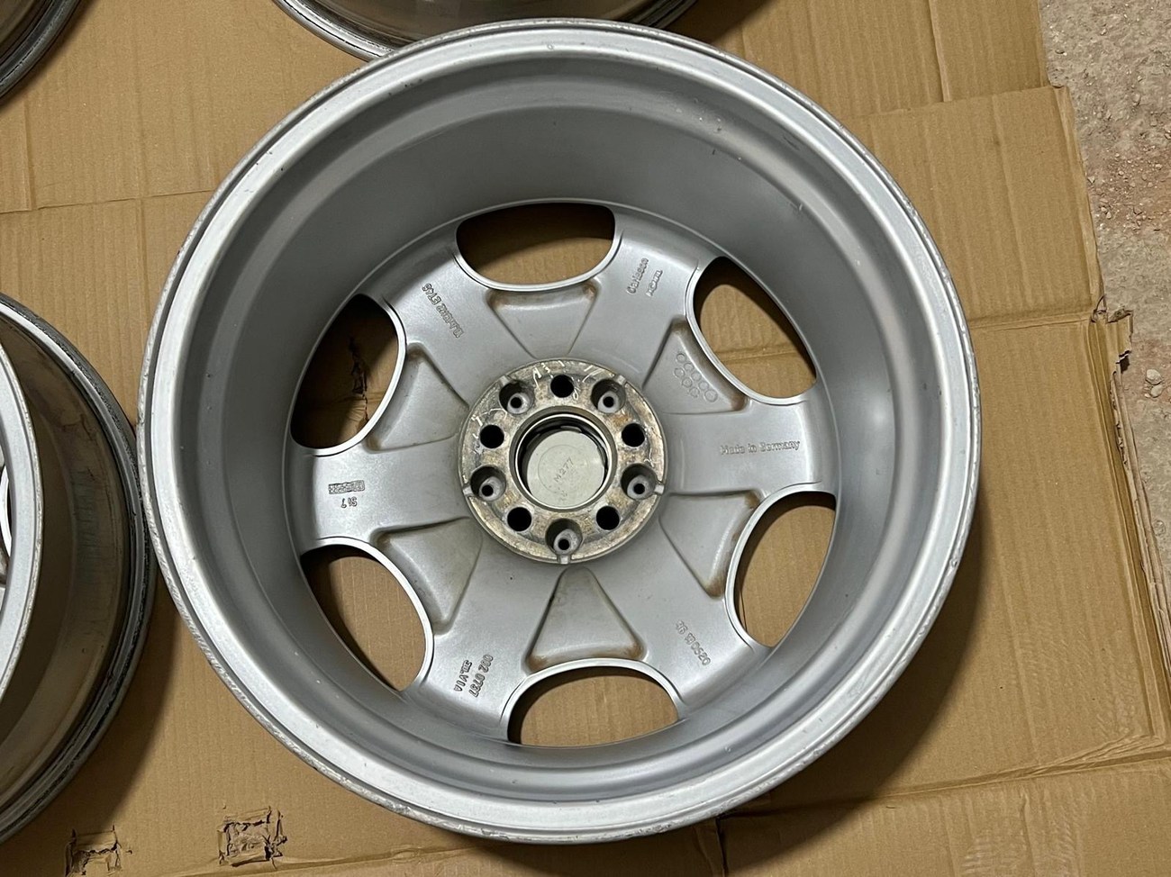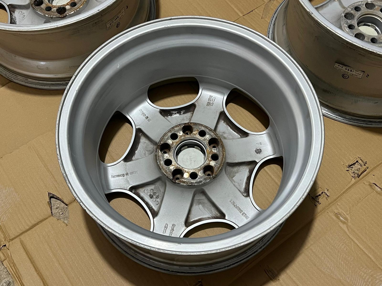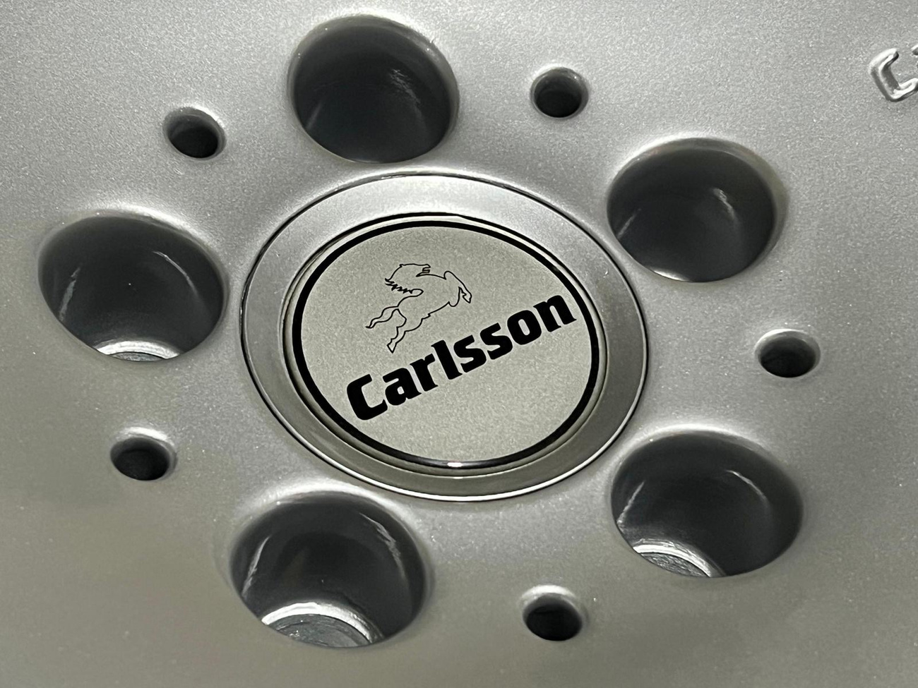 The monicker 1/6 denotes a single or “one-piece” construction with six spokes. The wheels have been professionally refinished in silver with polished lips. The wheels show no scrapes or other imperfections on the faces or lips. Authentic Carlsson center caps are installed and included. Close-up photos showing the condition of the wheels are provided in the gallery.