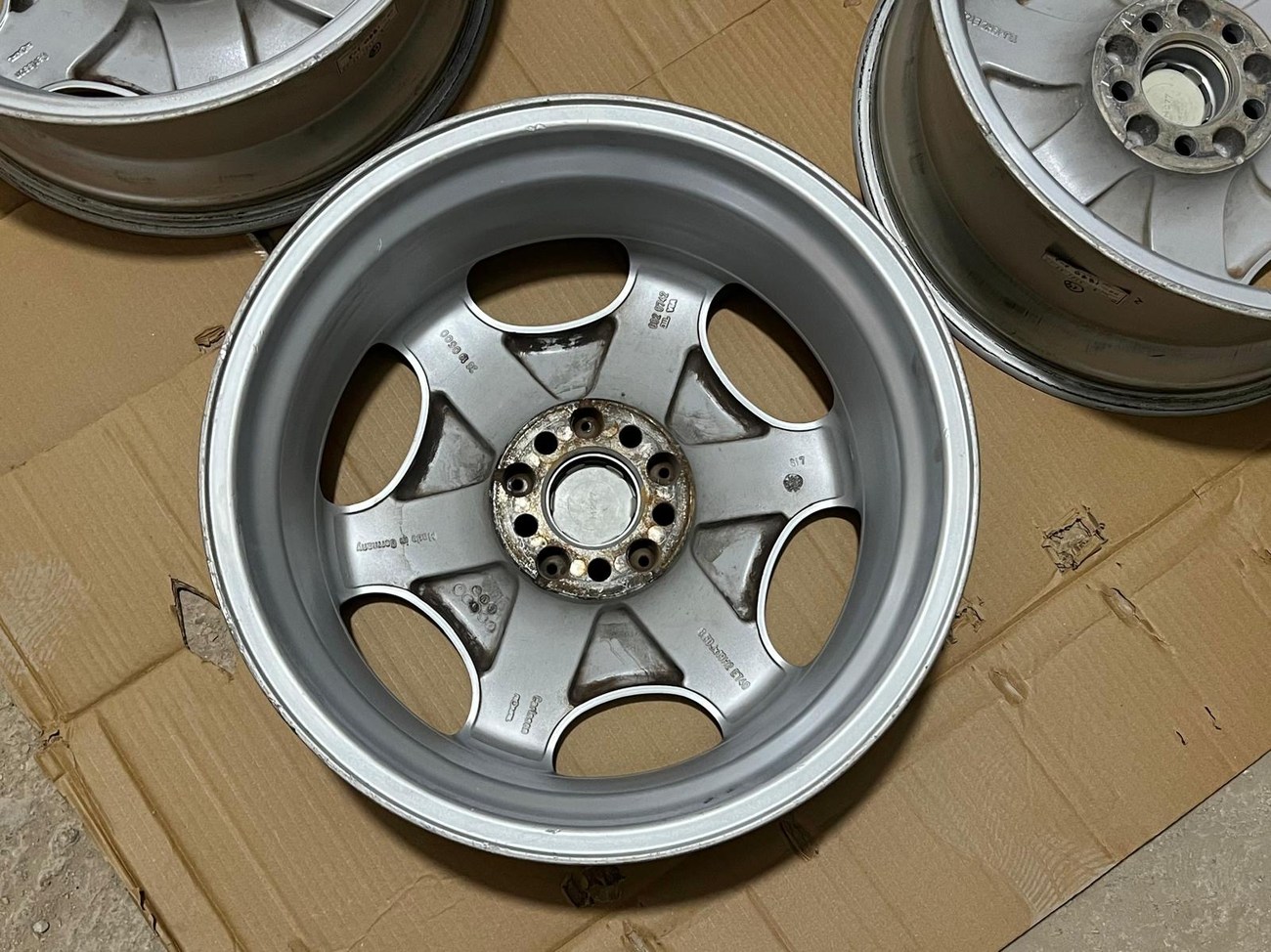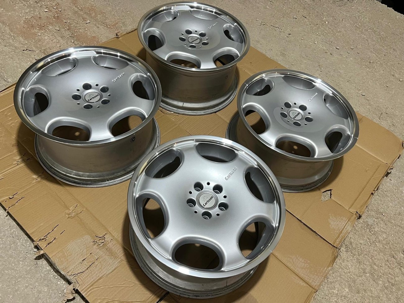These staggered 19" Carlsson 1/6 Wheels measure 8.5” wide in the front and 10" wide in the rear and were manufactured in Germany by RONAL exclusively for Carlsson for use on Mercedes-Benz vehicles and other 5x112 applications. Finished with silver painted faces and polished lips, these wheels have been professionally refinished and show in excellent condition. Dimensions, offsets, and other manufacturer casting marks are present on each wheel and original Carlsson center caps are included. The wheels are designed to fit W140 sedans and coupes. These Carlsson 1/6 wheels are now offered by the seller in Beirut, Lebanon with worldwide shipping options available.
