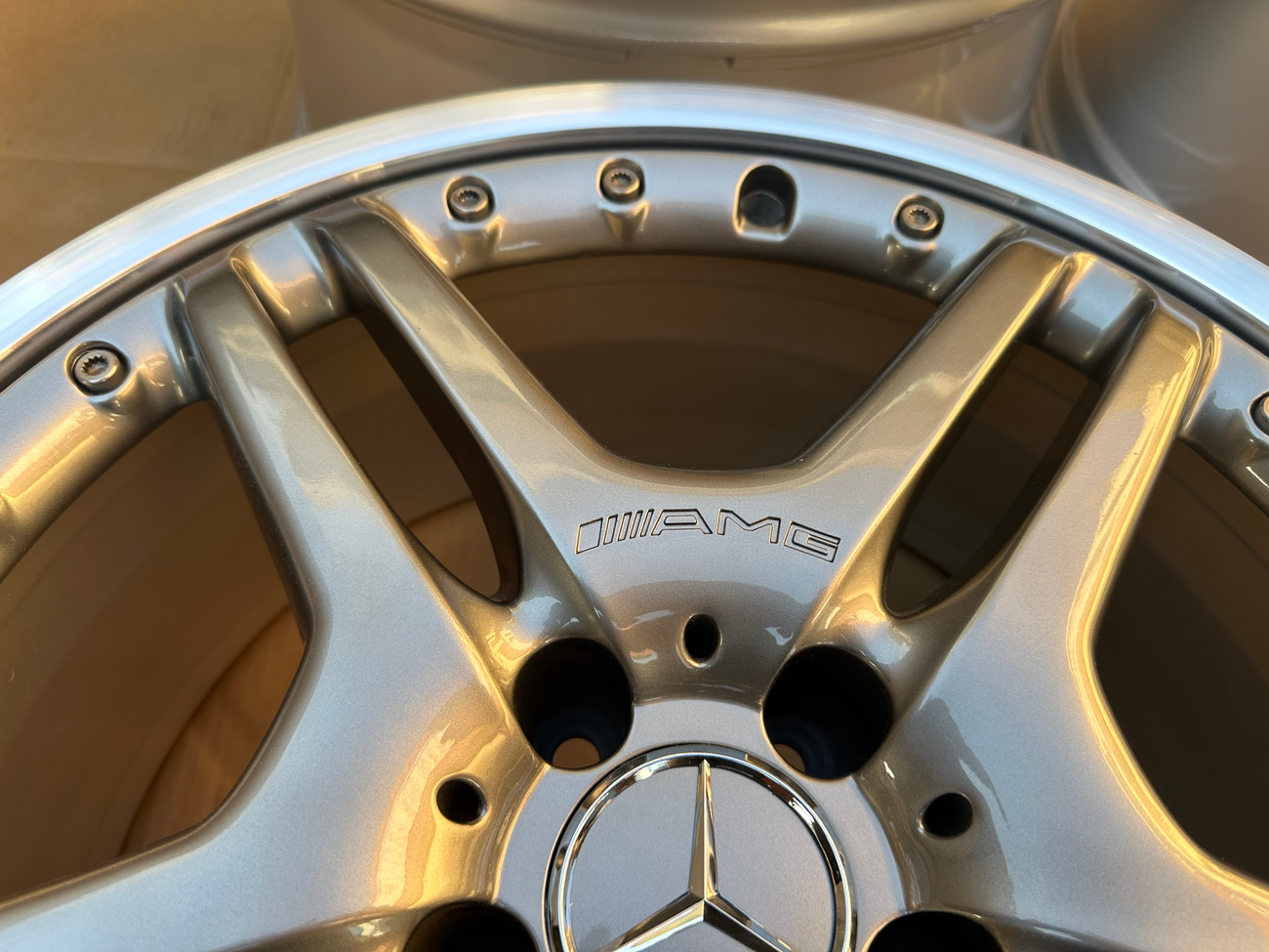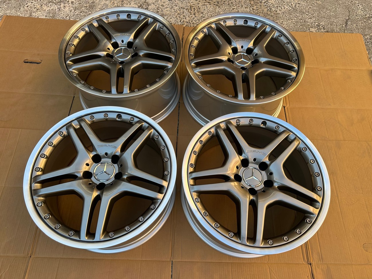These dual 5-spoke alloy wheels were originally mounted on a R230 SL65 AMG by the factory. The wheels are comprised of two-pieces with exposed BBS bolts around the faces. Each wheel features a titanium grey face with machined lips which are exclusive to the V12 AMG models. Each wheels has been professionally refinished and up close photos of each face are provided in the gallery showing no imperfections.