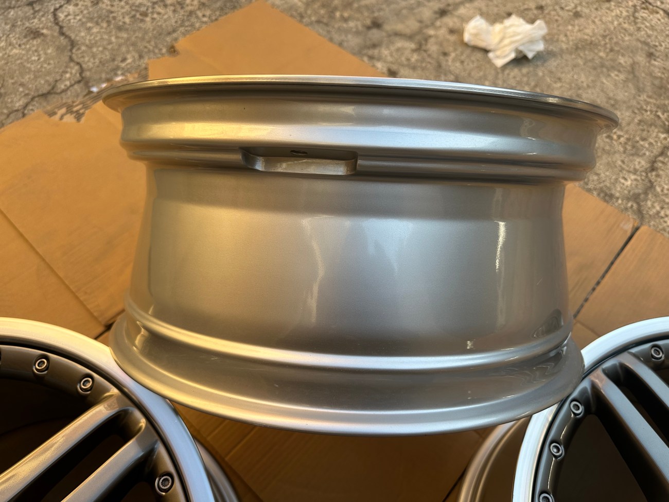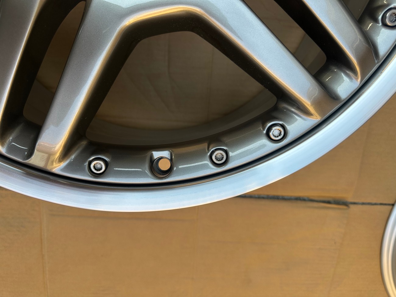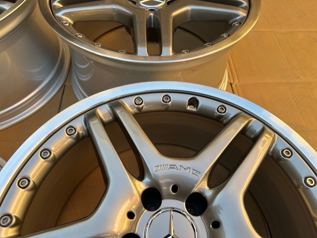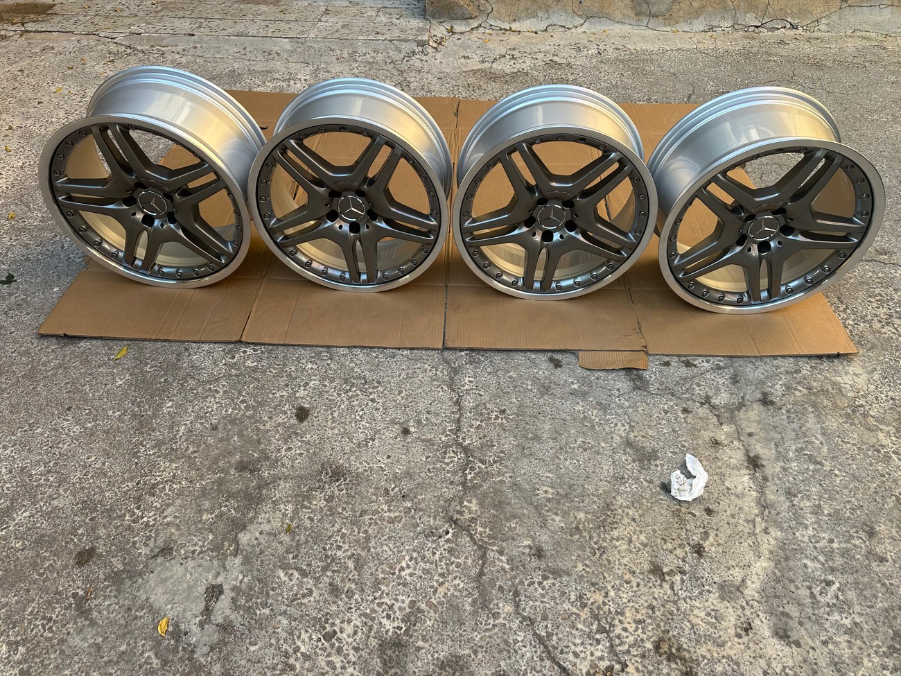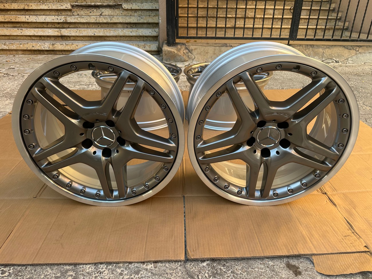 These staggered 19″ AMG wheels measure 8.5″ wide up front and 10" in the rear and were manufactured in Germany for use on Mercedes-Benz W220 and C215 vehicles although they do fit other models as well. The faces are finished in Titanium Grey with machined lips along with stamped part numbers on the back. Dimensions, offsets, and other manufacturer casting marks are present on each wheel. Each wheel has been professionally refinished in preparation for the sale and show in excellent condition. These geniune 2-piece AMG wheels are now offered by the seller in Beirut, Lebanon with worldwide shipping available.