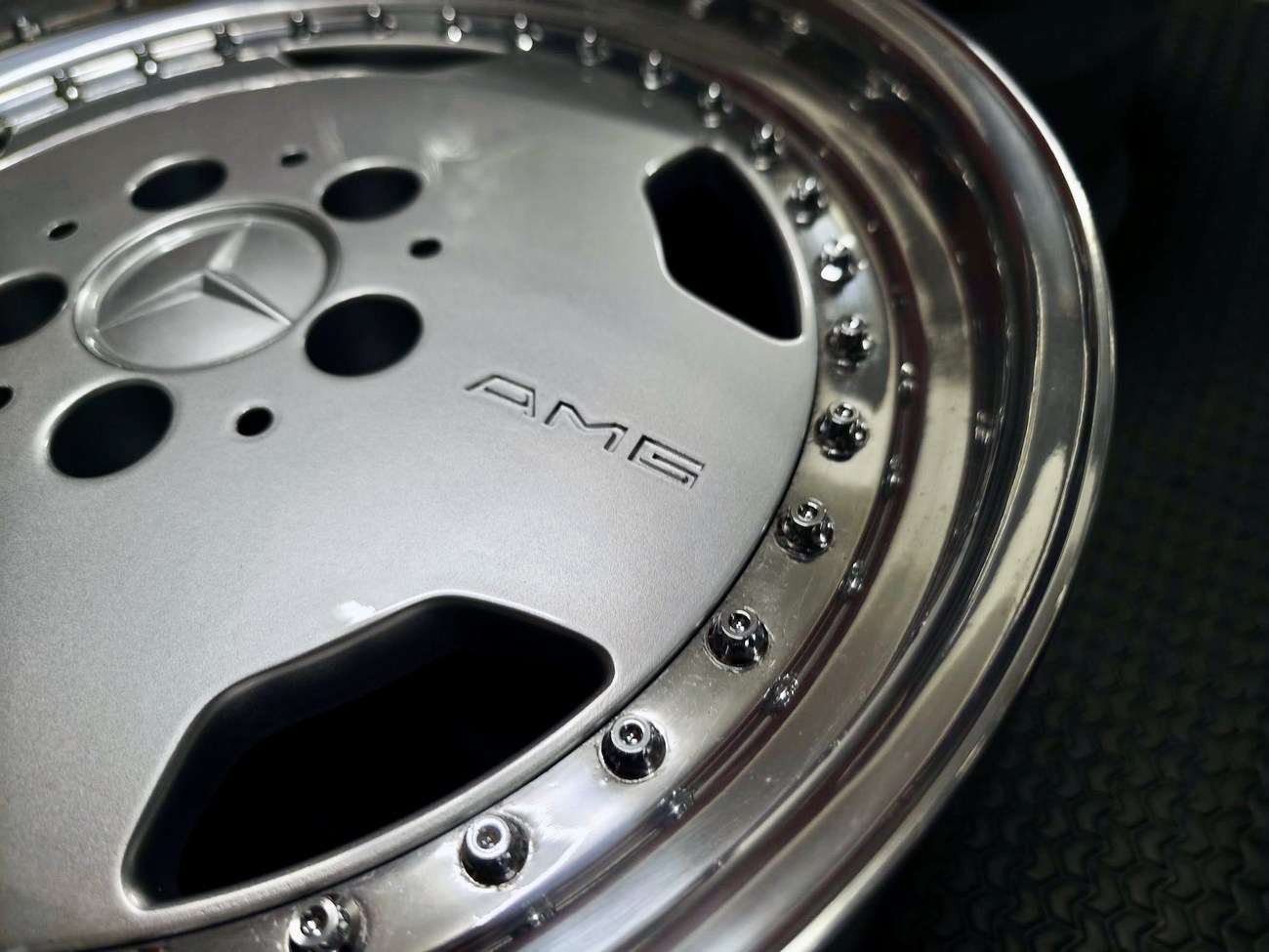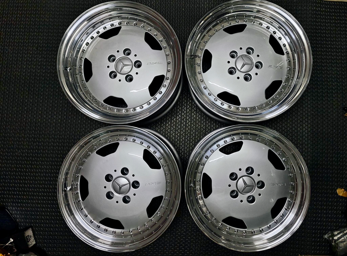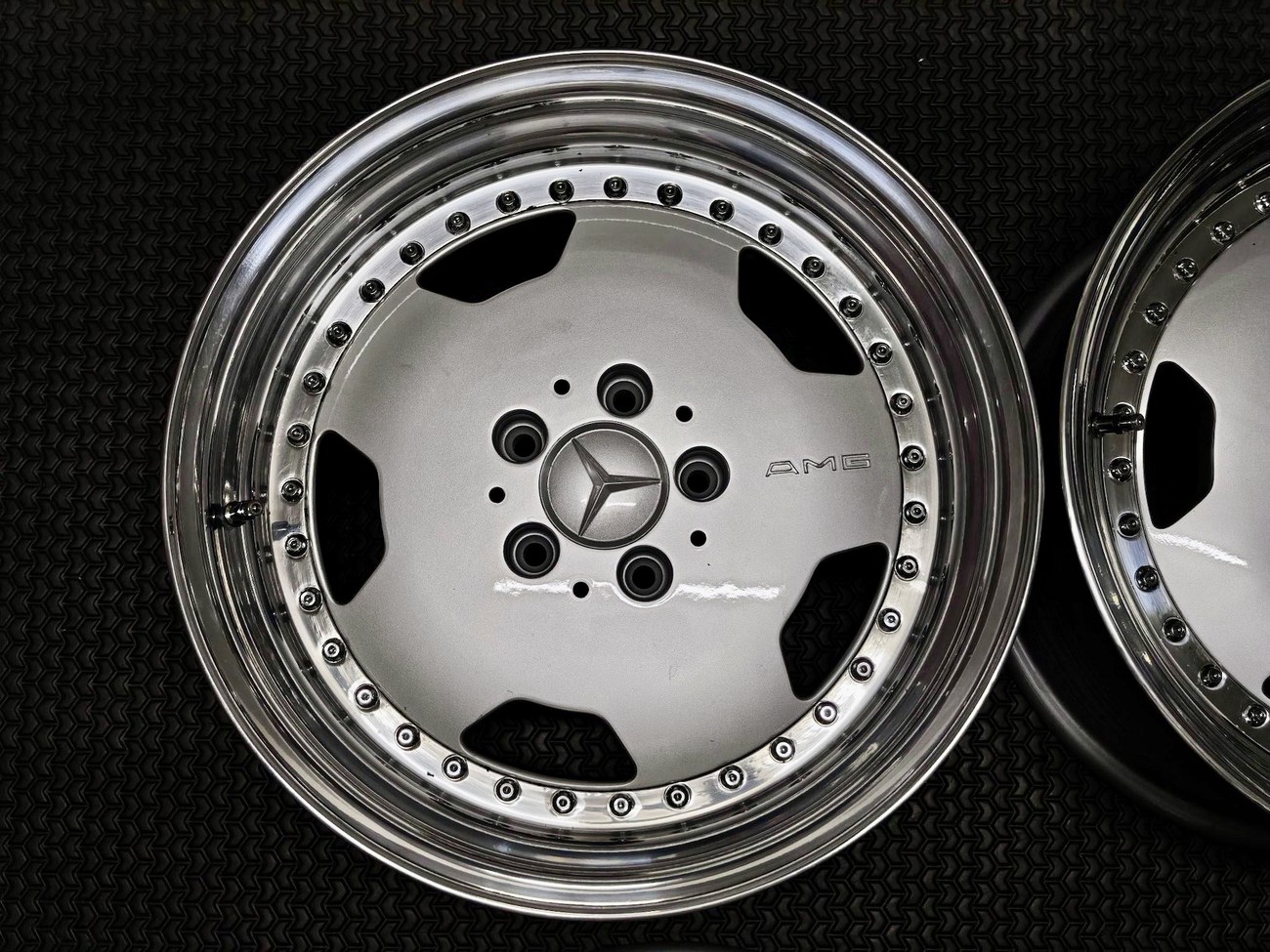 These 5-hole AMG wheels feature a 3-piece design with exposed bolts around the lip. The faces are finished in silver while the lips are polished and benefit from a recent professional refinish. The seller reports there have been no lug hole cracks, repairs, or welds on any wheel.