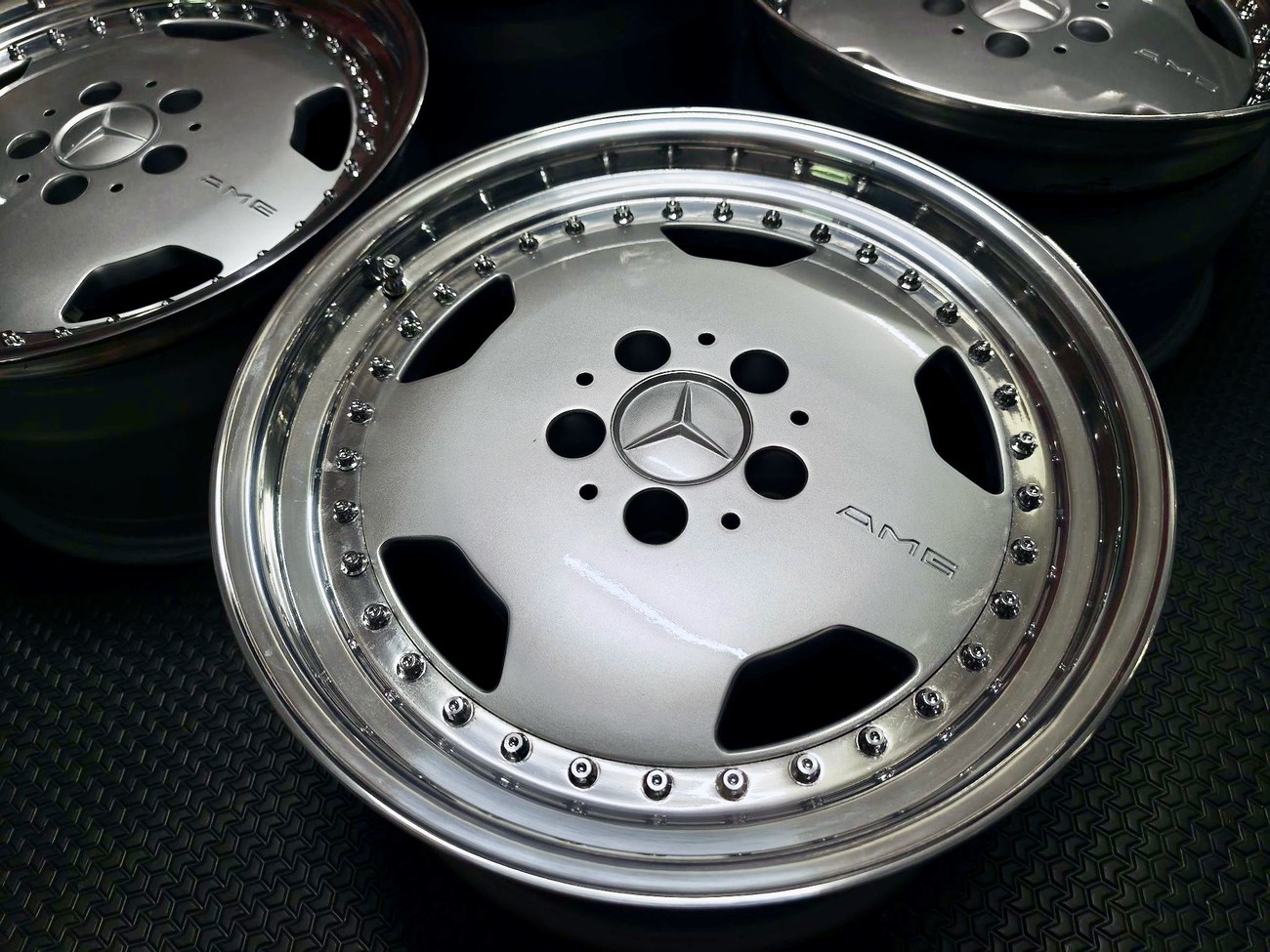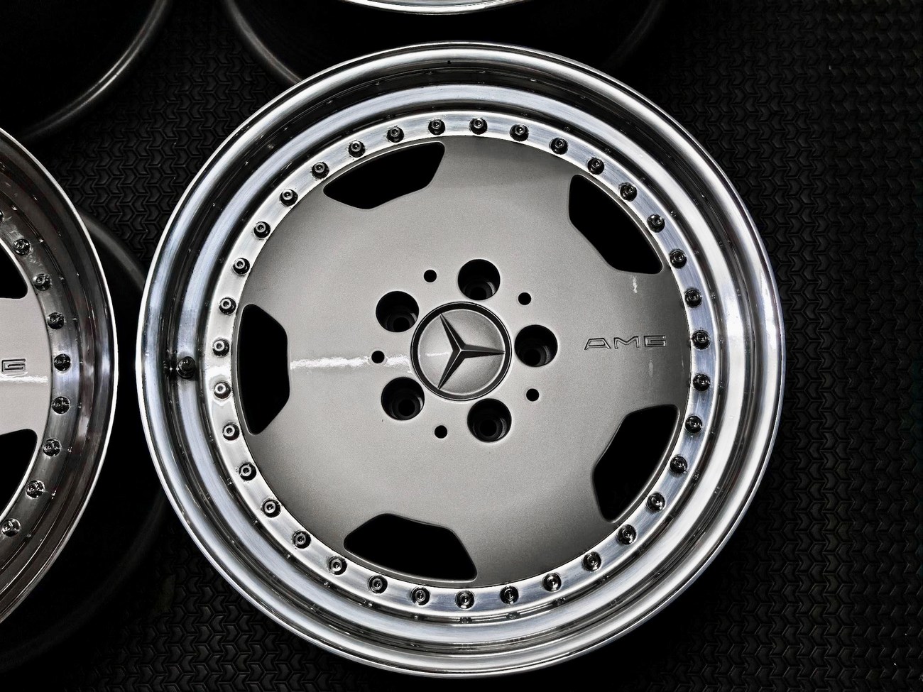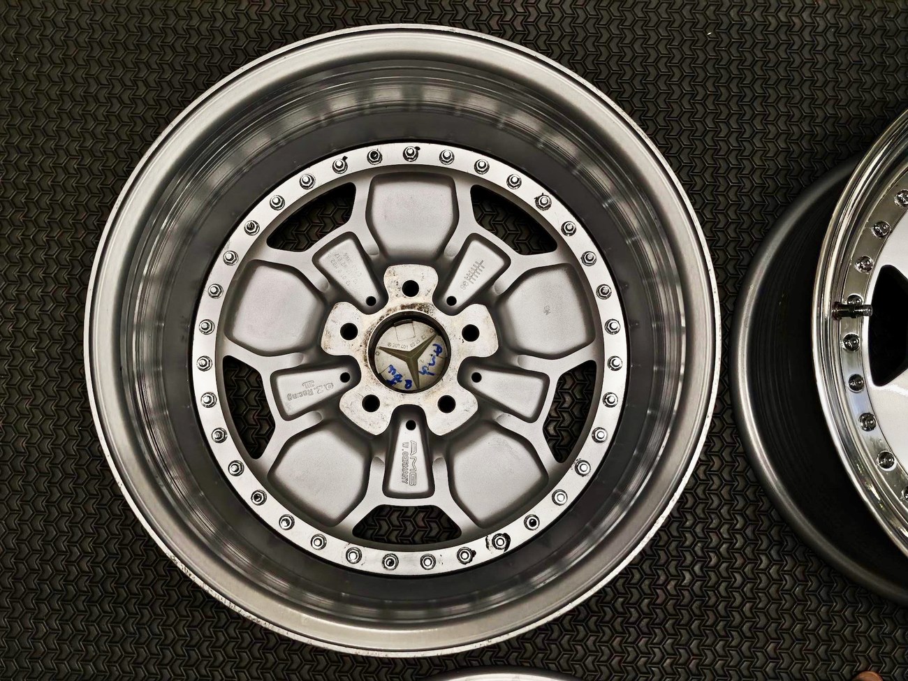 These staggered 3-piece 17" AMG Aero III wheels measure 8.5″ wide in the front and 10" wide in the rear, and were manufactured by O.Z. Racing for use on Mercedes-Benz AMG vehicles. The faces are finished in silver and accented with polished lips and exposed bolts. Manufacturer casting marks are present on each wheel and four Mercedes-Benz center caps are included. Each wheel has been professionally refinished in preparation for the sale and show in excellent condition. These authentic AMG Aero III wheels are now offered by the seller in Thailand and worldwide shipping is available.