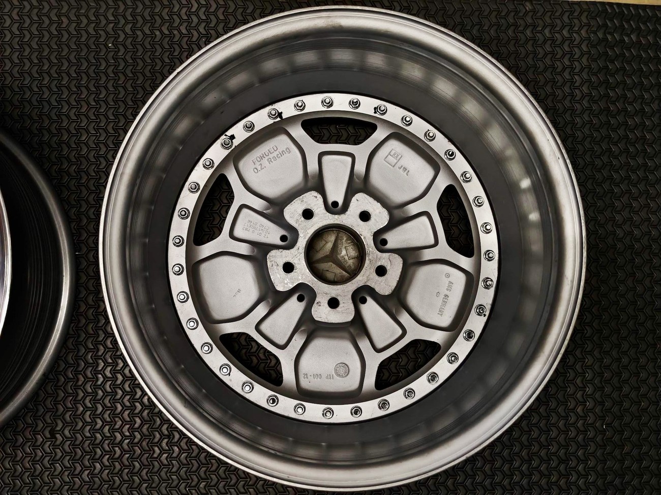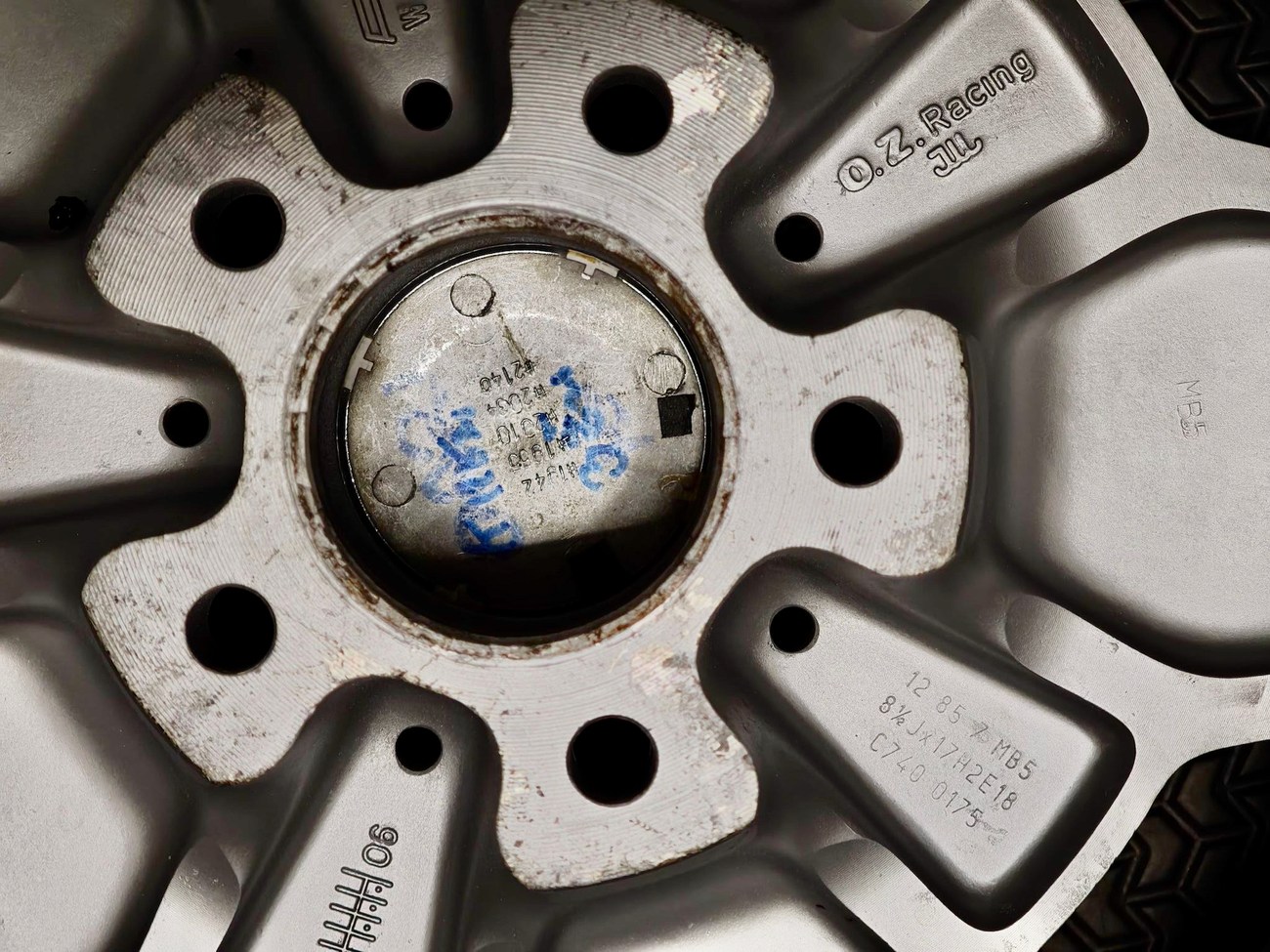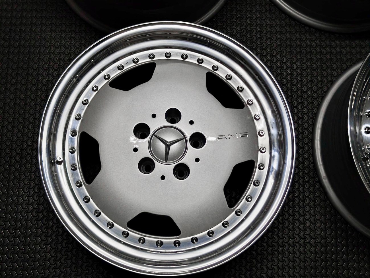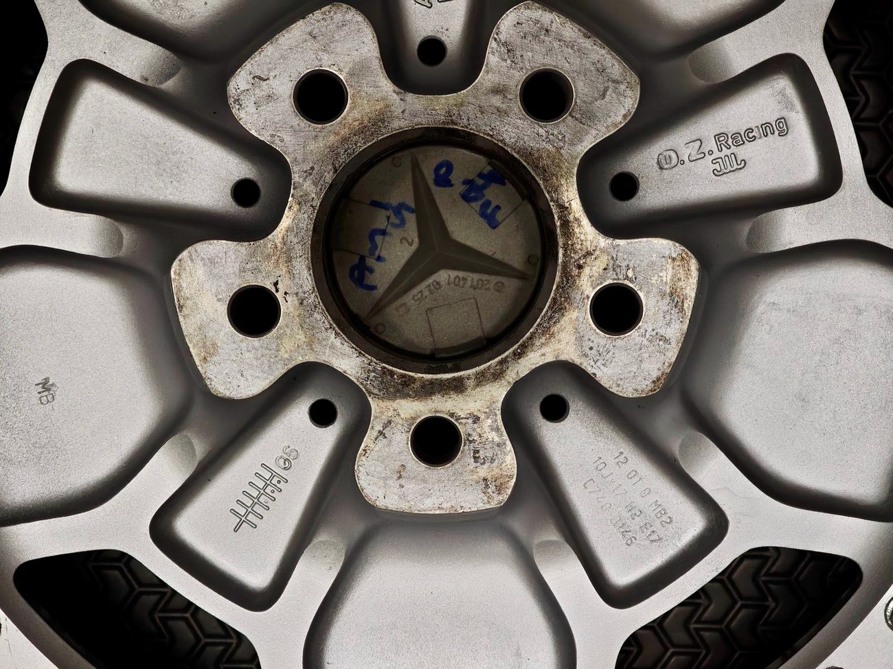 These staggered 3-piece 17" AMG Aero III wheels measure 8.5″ wide in the front and 10" wide in the rear, and were manufactured by O.Z. Racing for use on Mercedes-Benz AMG vehicles. The faces are finished in silver and accented with polished lips and exposed bolts. Manufacturer casting marks are present on each wheel and four Mercedes-Benz center caps are included. Each wheel has been professionally refinished in preparation for the sale and show in excellent condition. These authentic AMG Aero III wheels are now offered by the seller in Thailand and worldwide shipping is available.