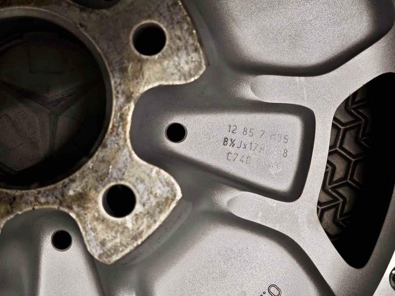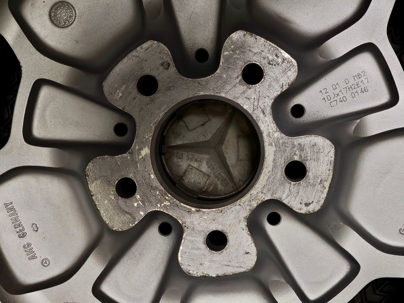 The front wheels measure 8.5" wide with an offset of +18 while the rear measure 10" wide with an offset of +17 and show AMG Germany as the place of manufacture. Close up photos of the back of the wheels are viewable in the gallery. The wheels feature a 5x112 bolt pattern and 66.67 center bore which is specific to Mercedes-Benz vehicles. Up close photos of each face are provided in the gallery showing the premerger AMG logo on each face.