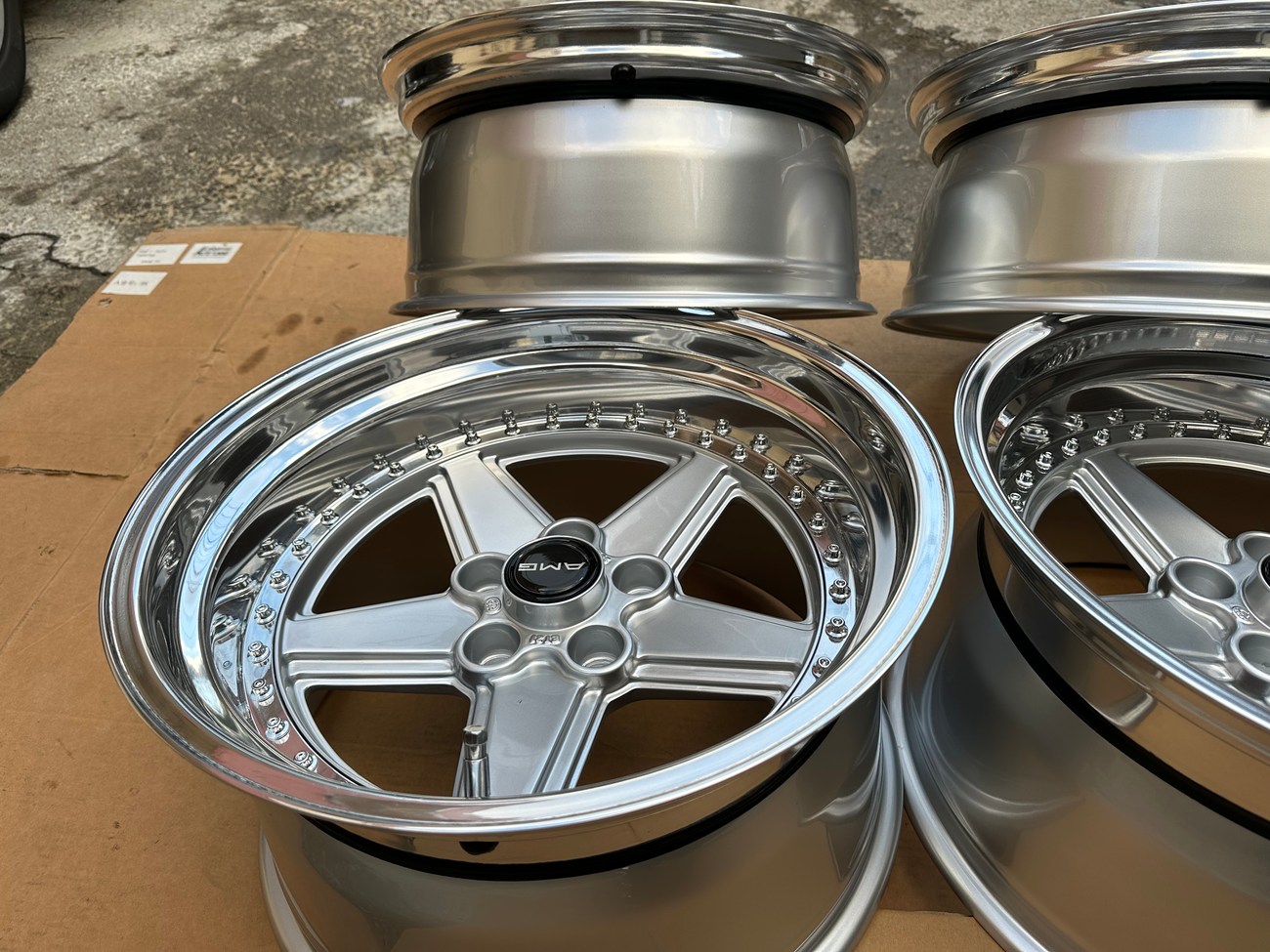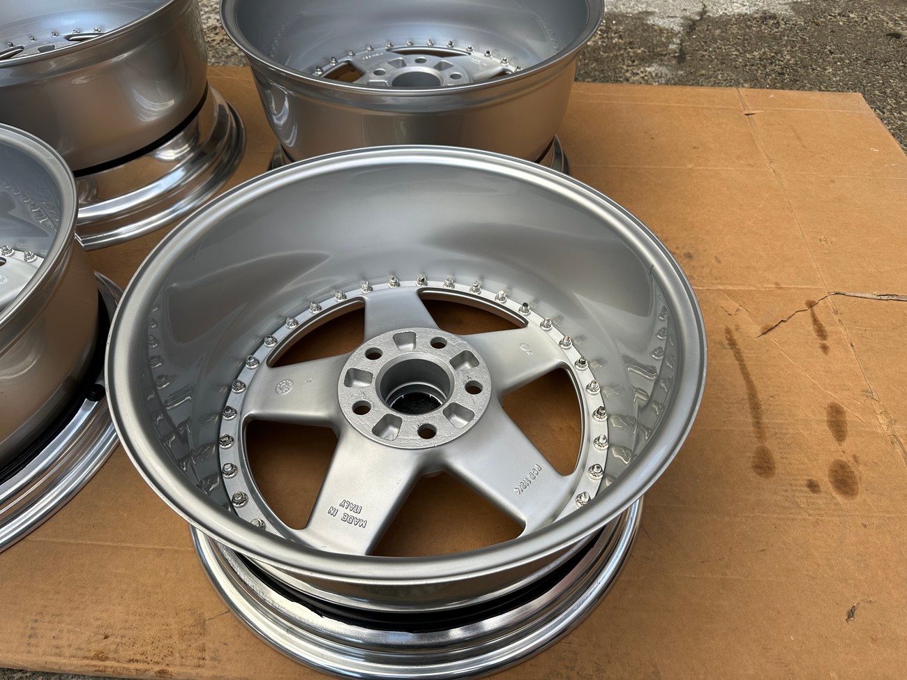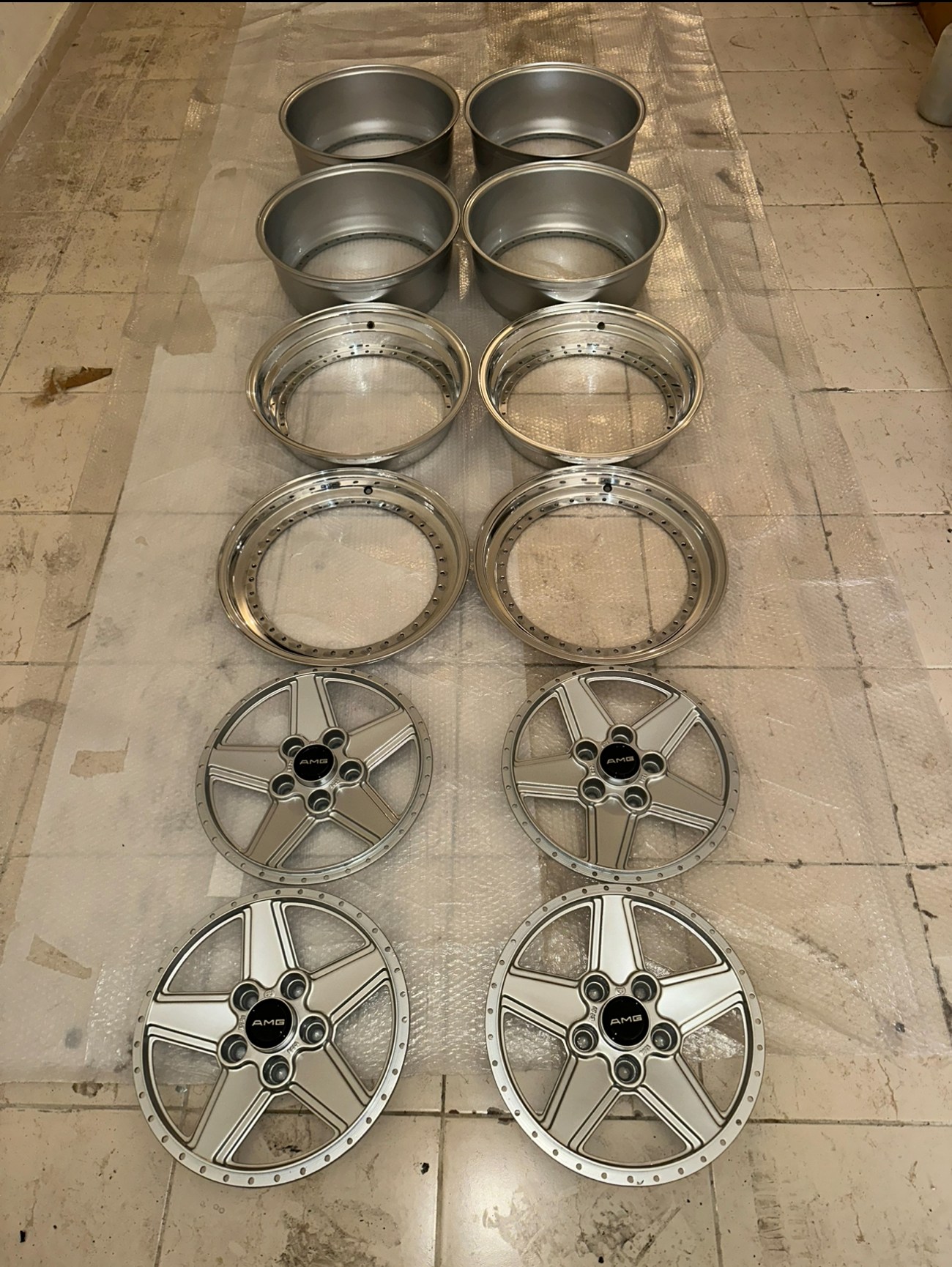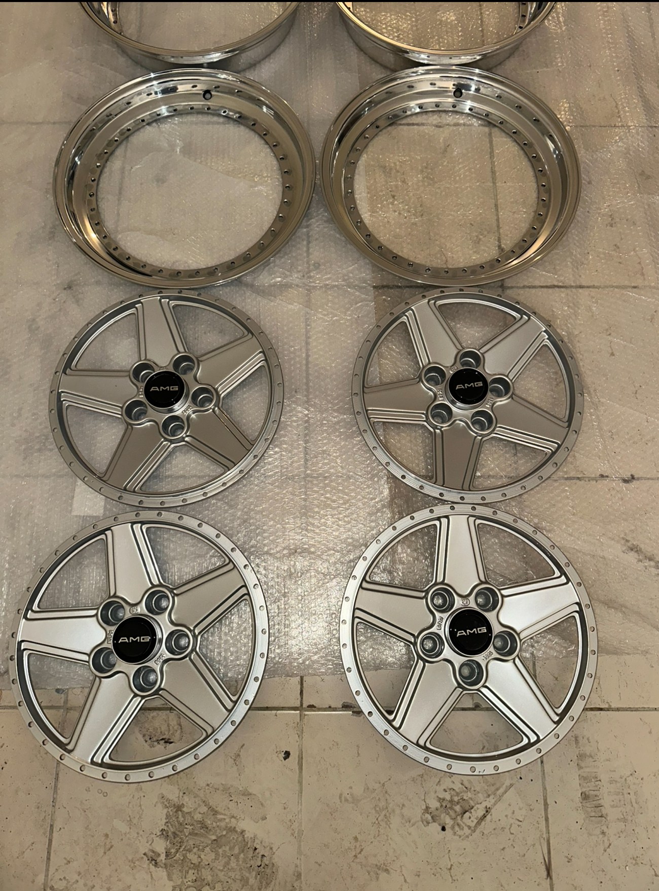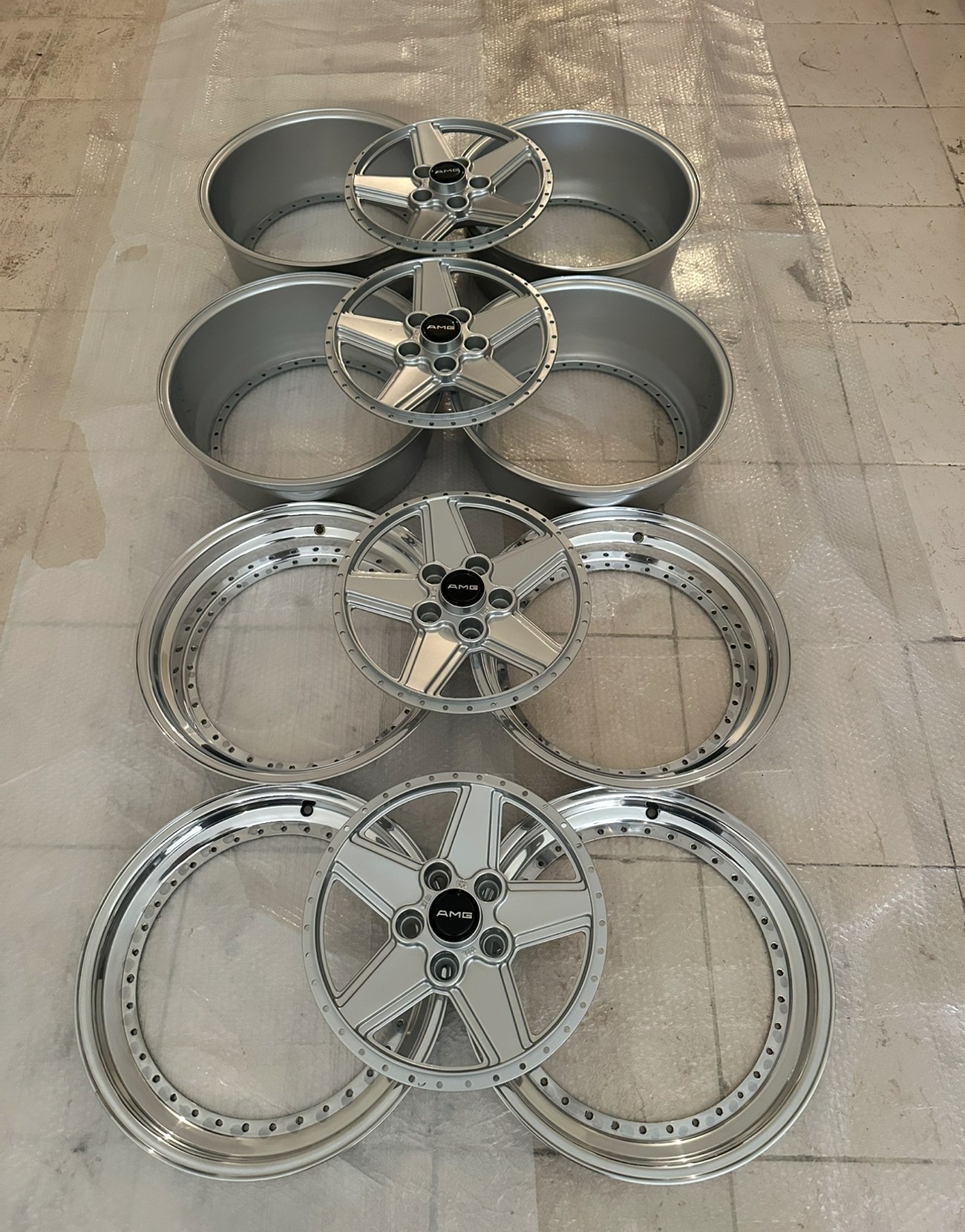 The front wheels measure 8.5″ wide while the rear wheels measure 10″ wide. All four wheels feature a 5x112mm bolt pattern and an offset of +21. Pictures in the gallery show the wheels prior to assembly with the faces, lips, and barrels individually placed.