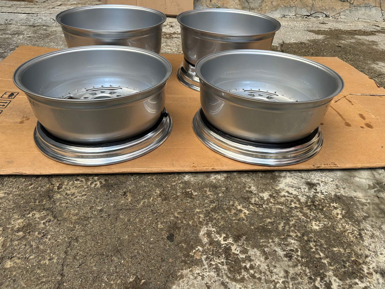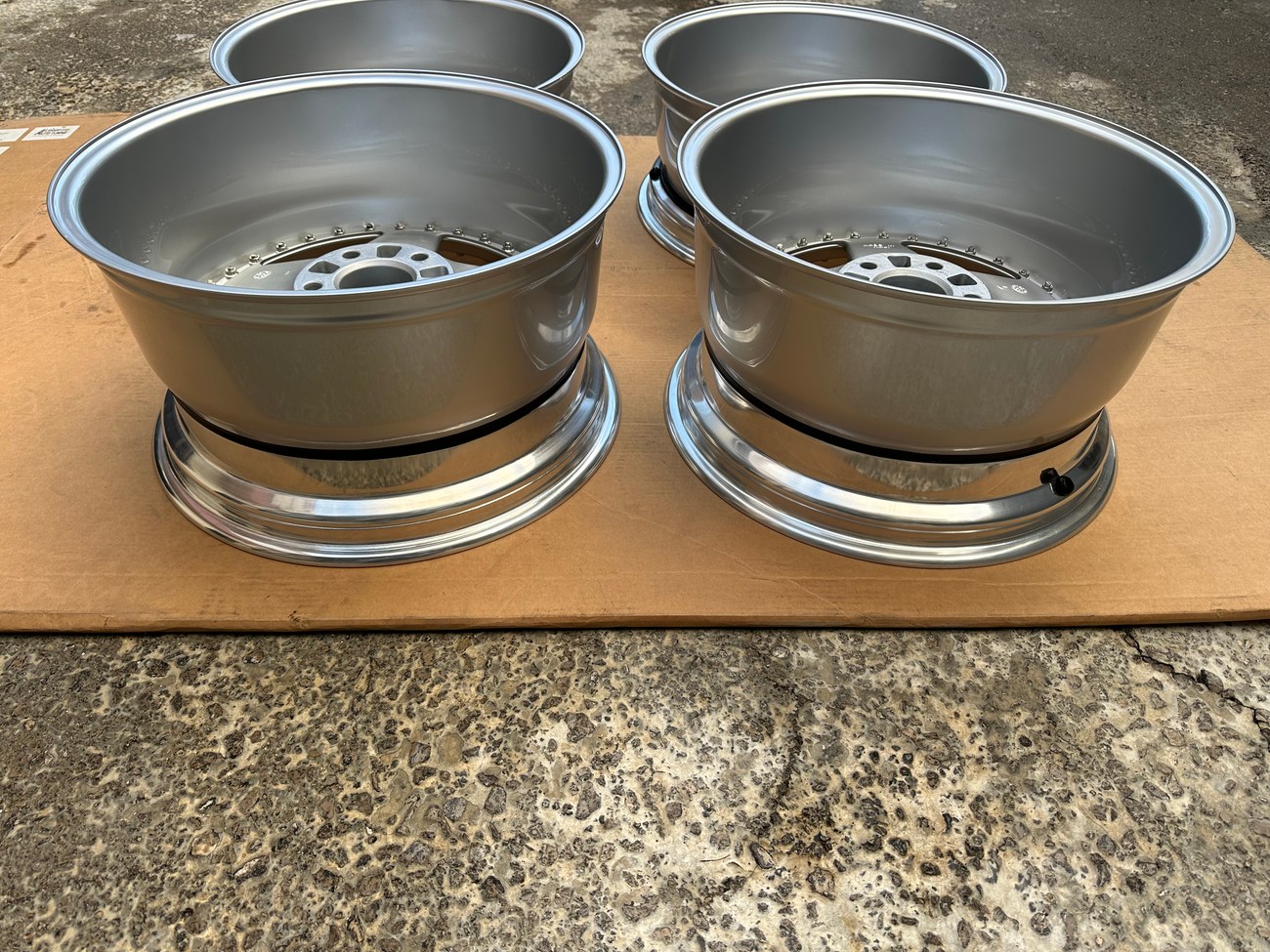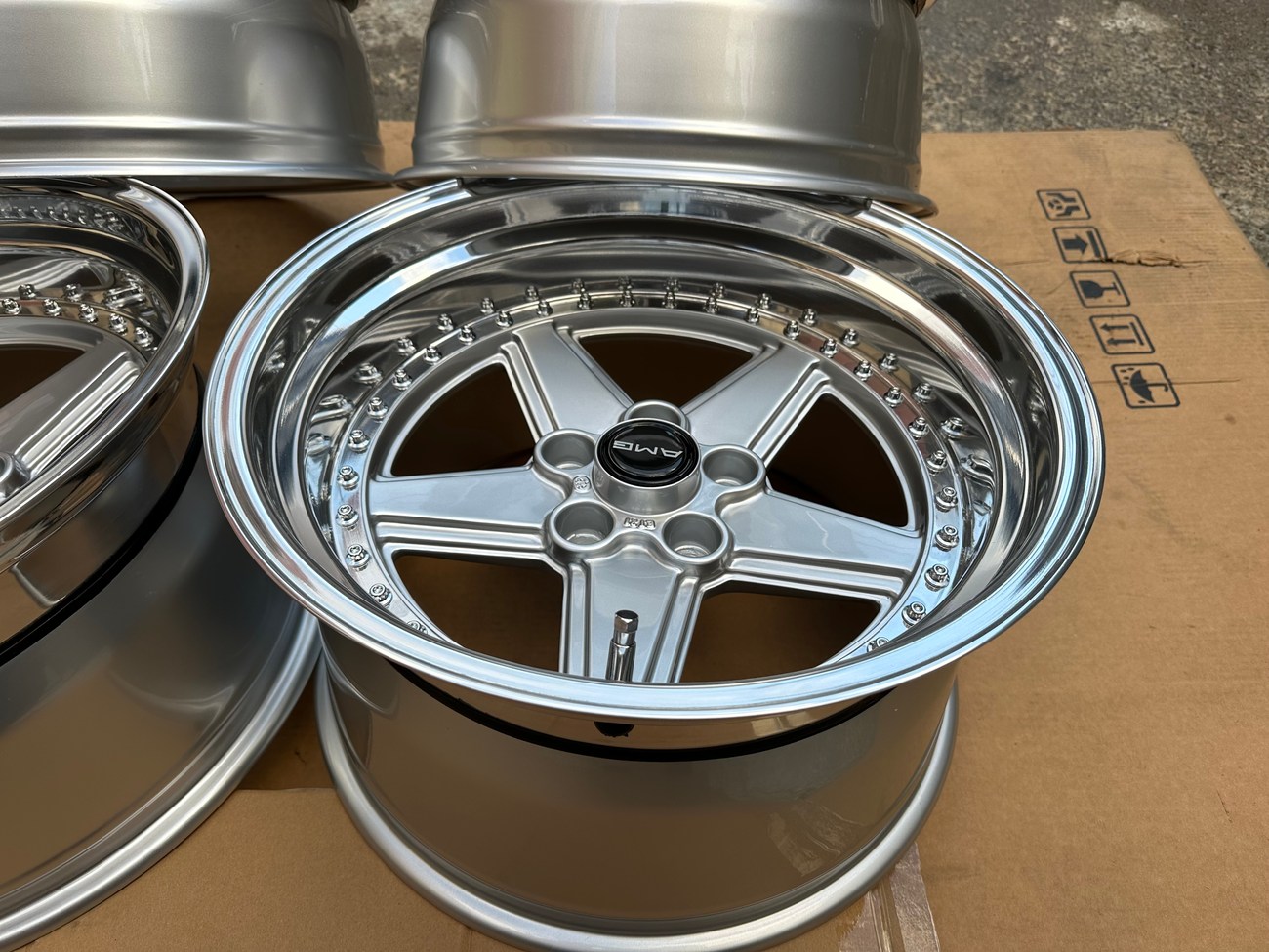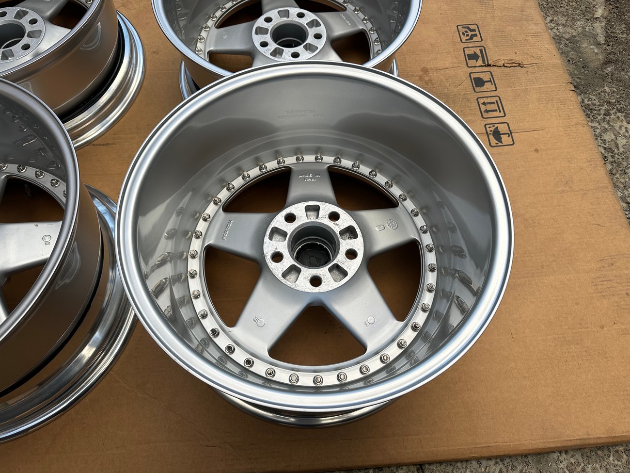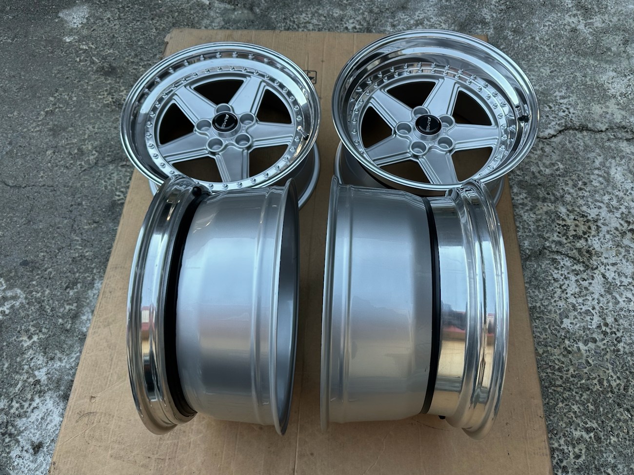 The front wheels measure 8.5″ wide while the rear wheels measure 10″ wide. All four wheels feature a 5x112mm bolt pattern and an offset of +21. Pictures in the gallery show the wheels prior to assembly with the faces, lips, and barrels individually placed.