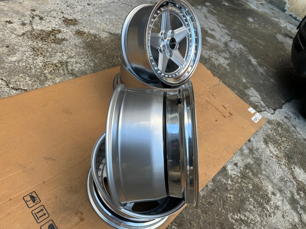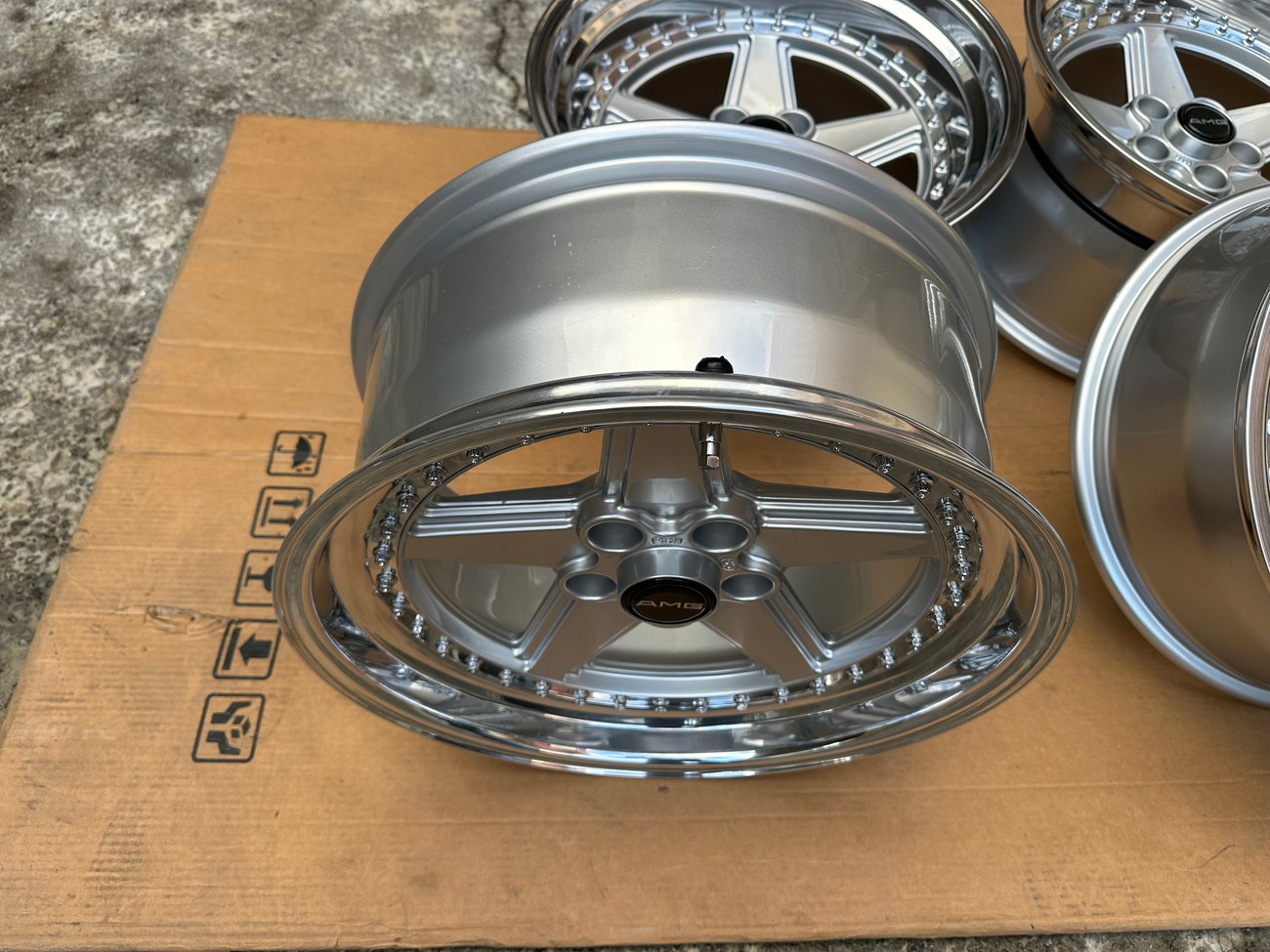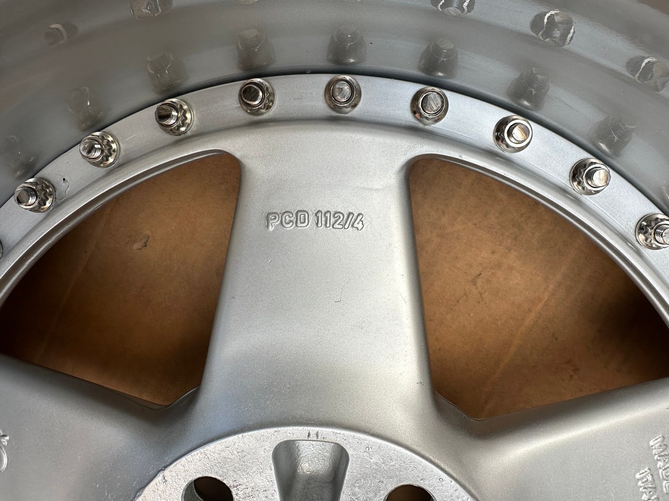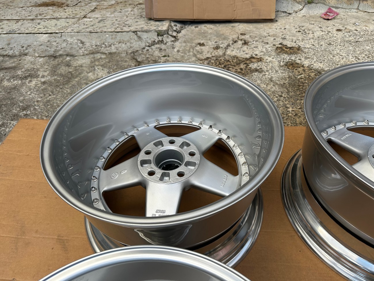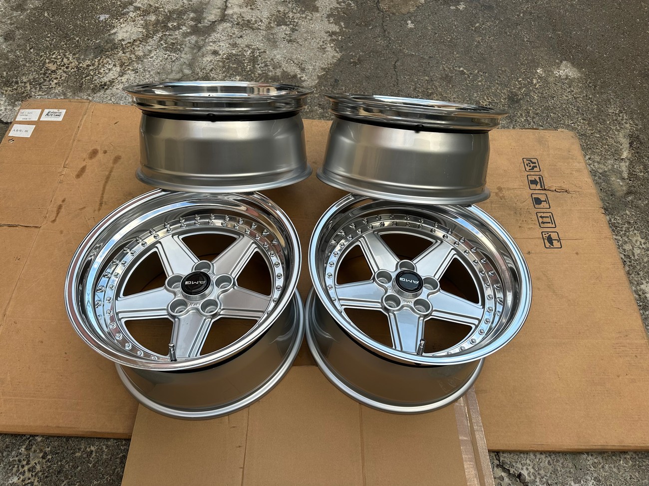 The front wheels measure 8.5″ wide while the rear wheels measure 10″ wide. All four wheels feature a 5x112mm bolt pattern and an offset of +21. Pictures in the gallery show the wheels prior to assembly with the faces, lips, and barrels individually placed.