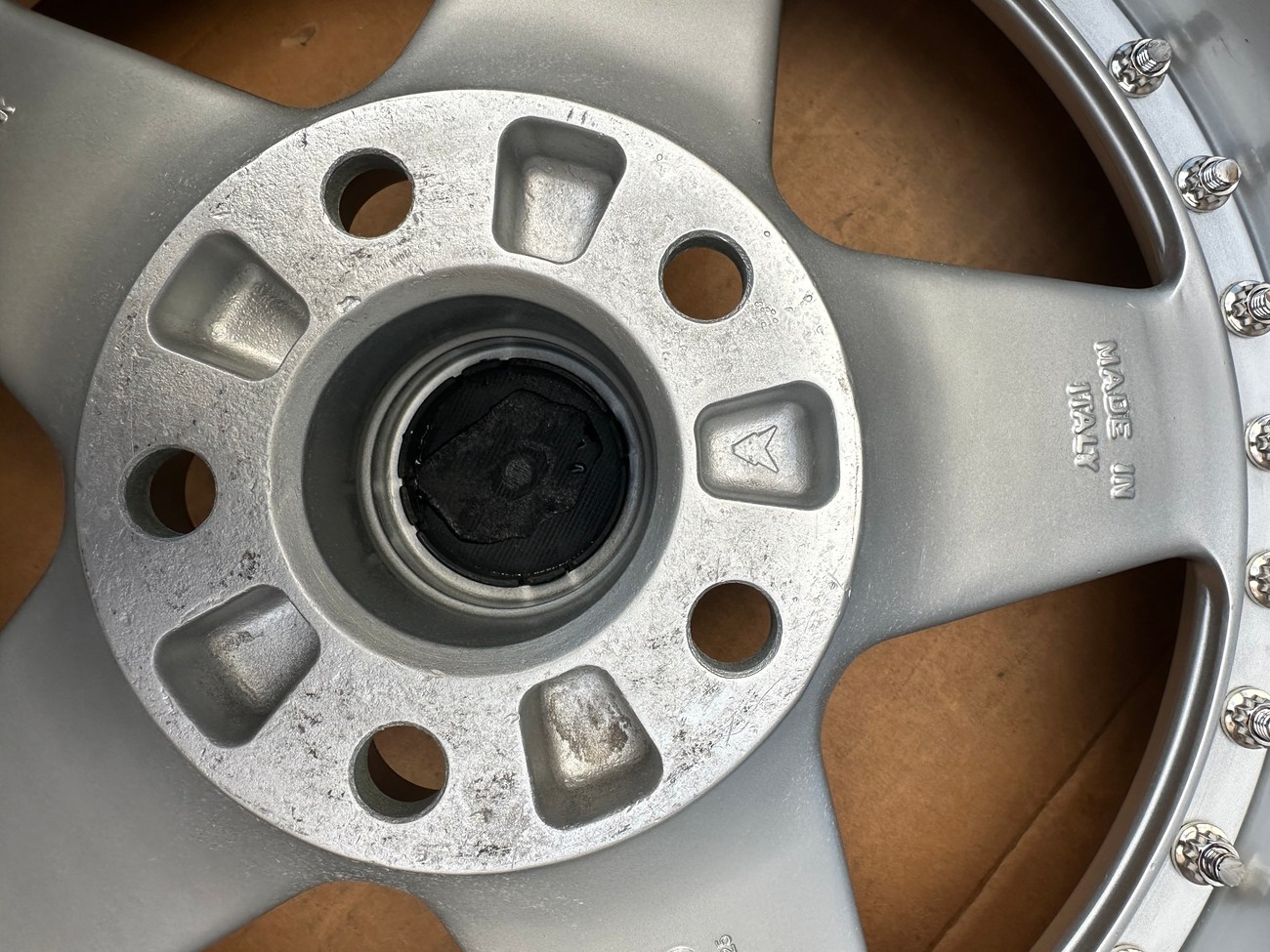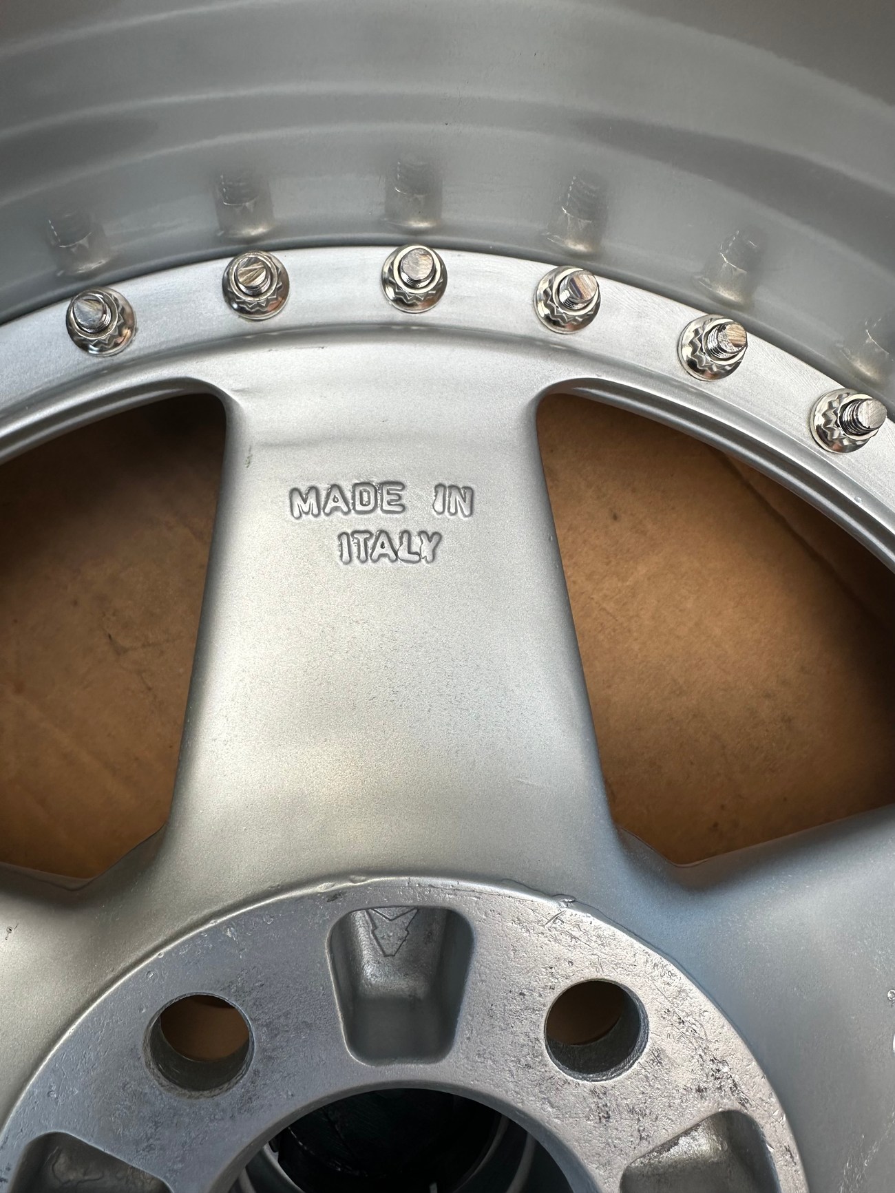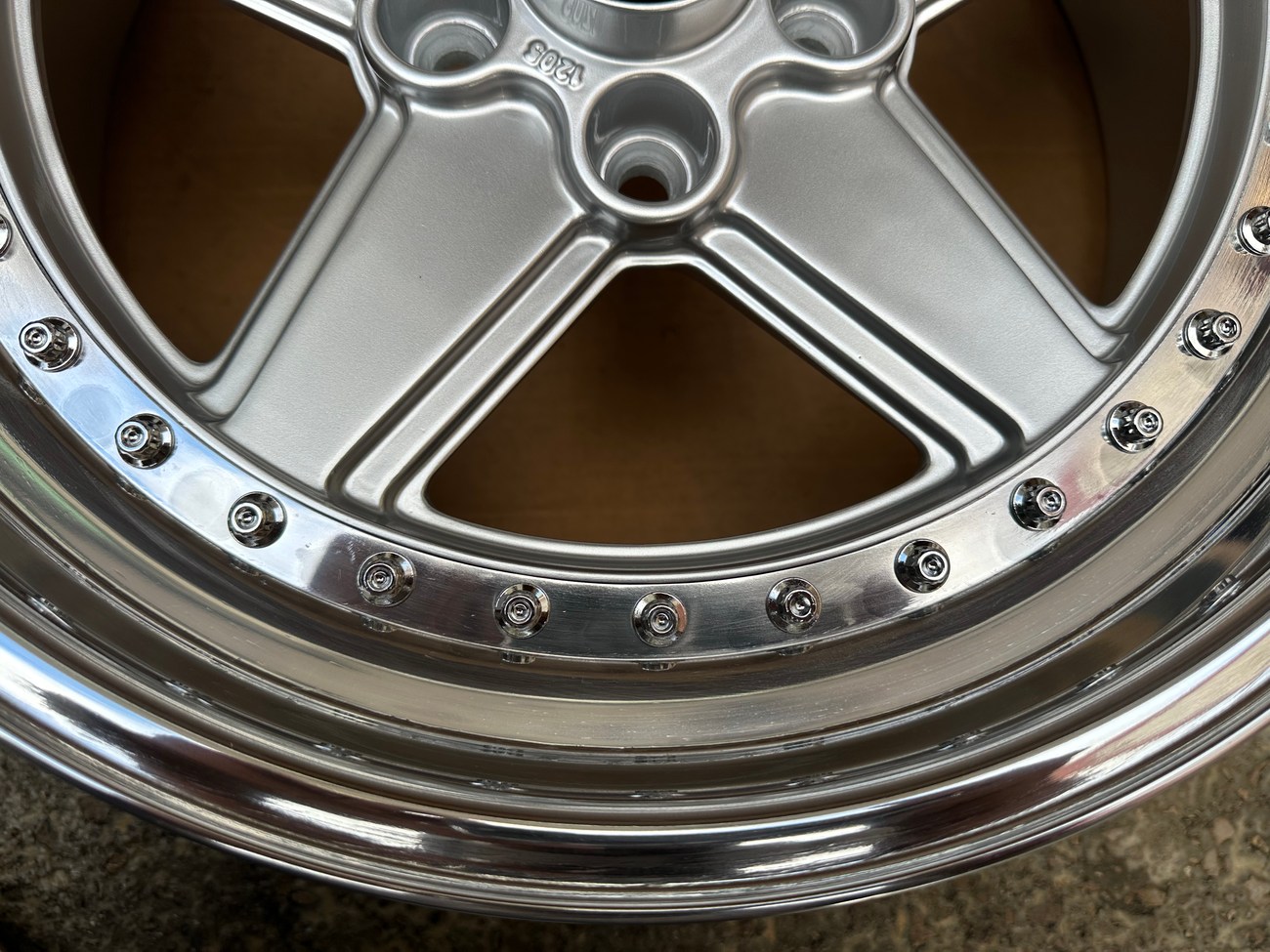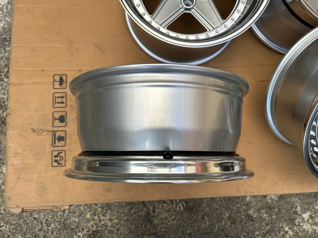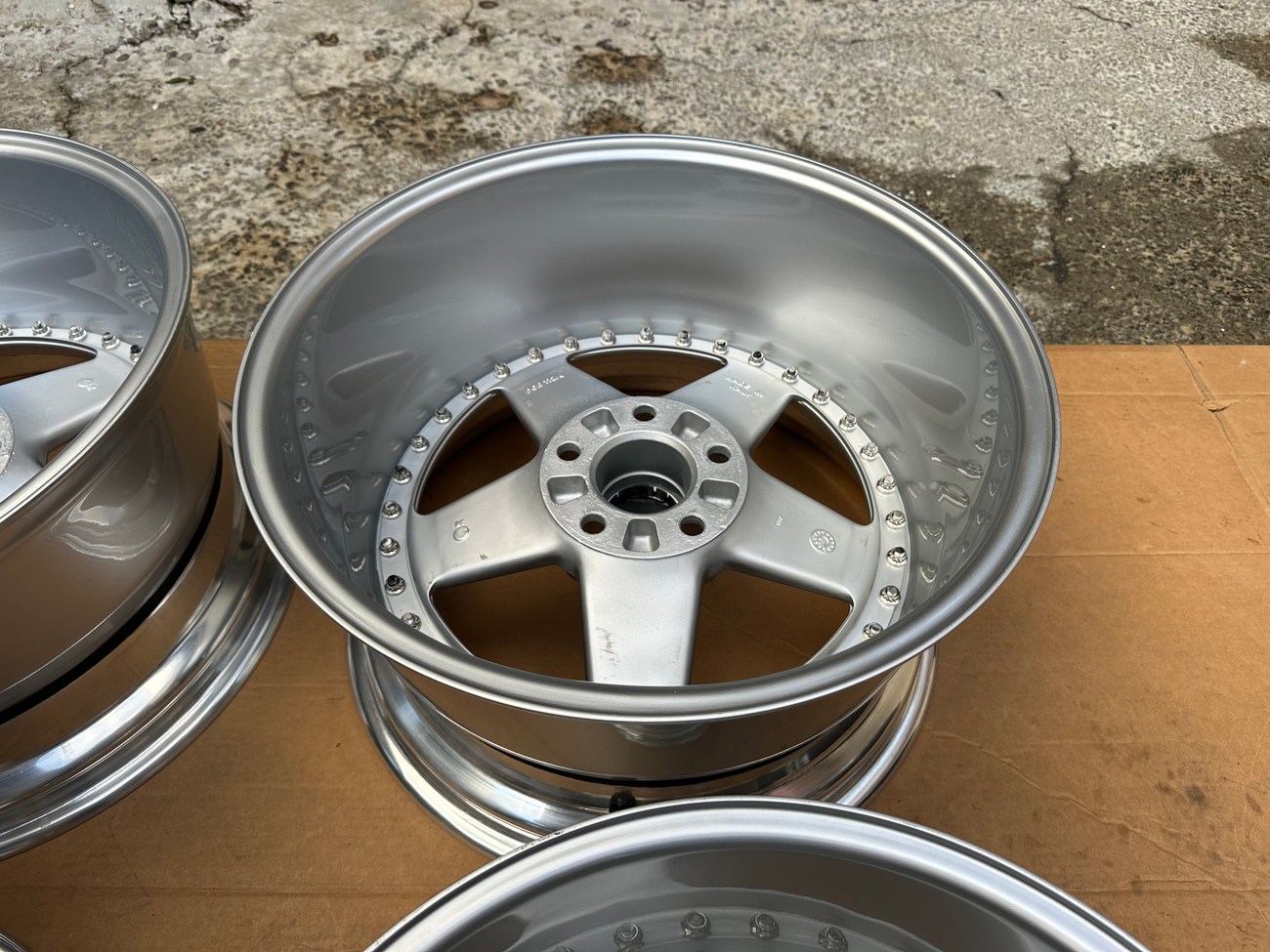 The front wheels measure 8.5″ wide while the rear wheels measure 10″ wide. All four wheels feature a 5x112mm bolt pattern and an offset of +21. Pictures in the gallery show the wheels prior to assembly with the faces, lips, and barrels individually placed.