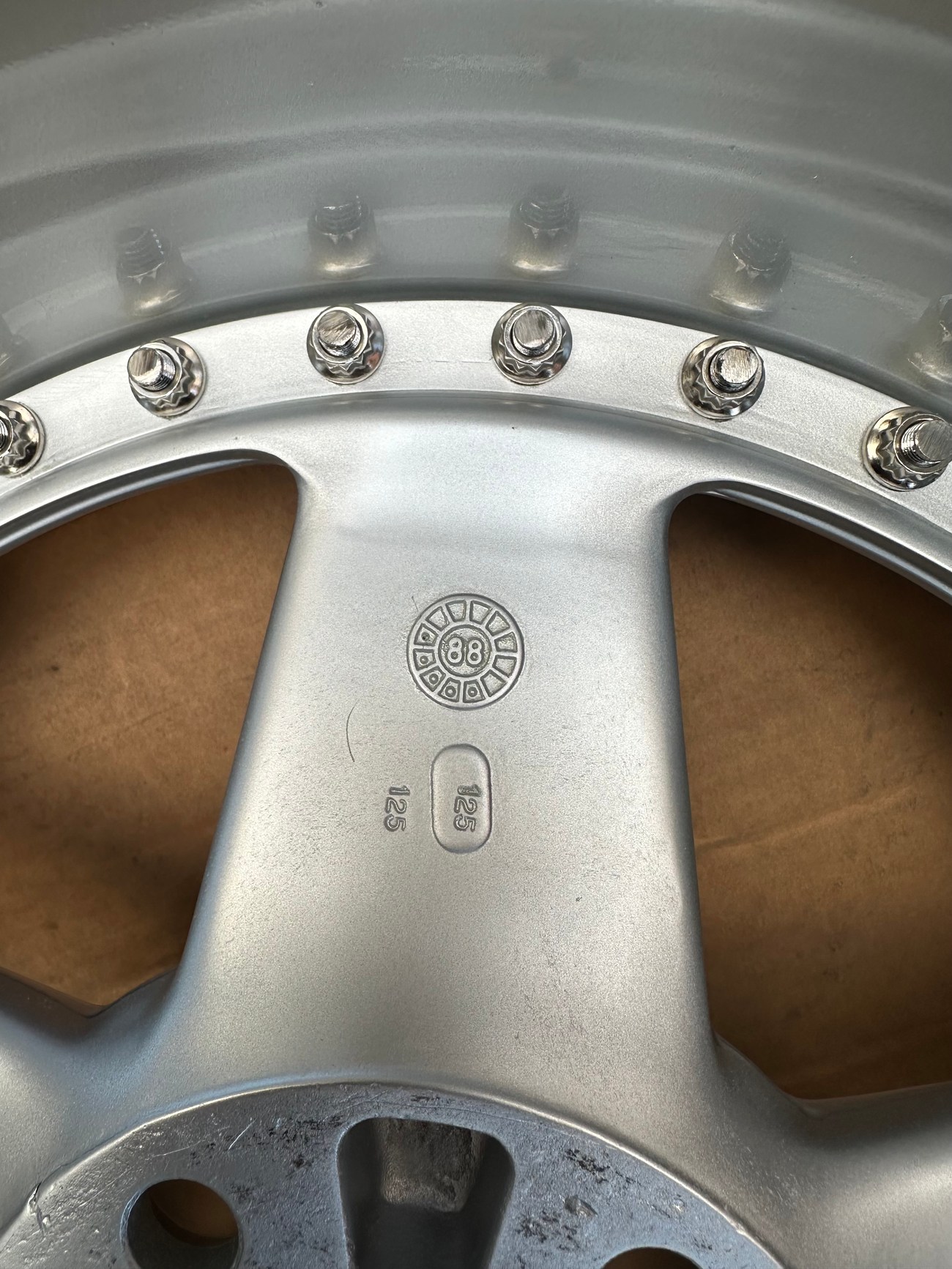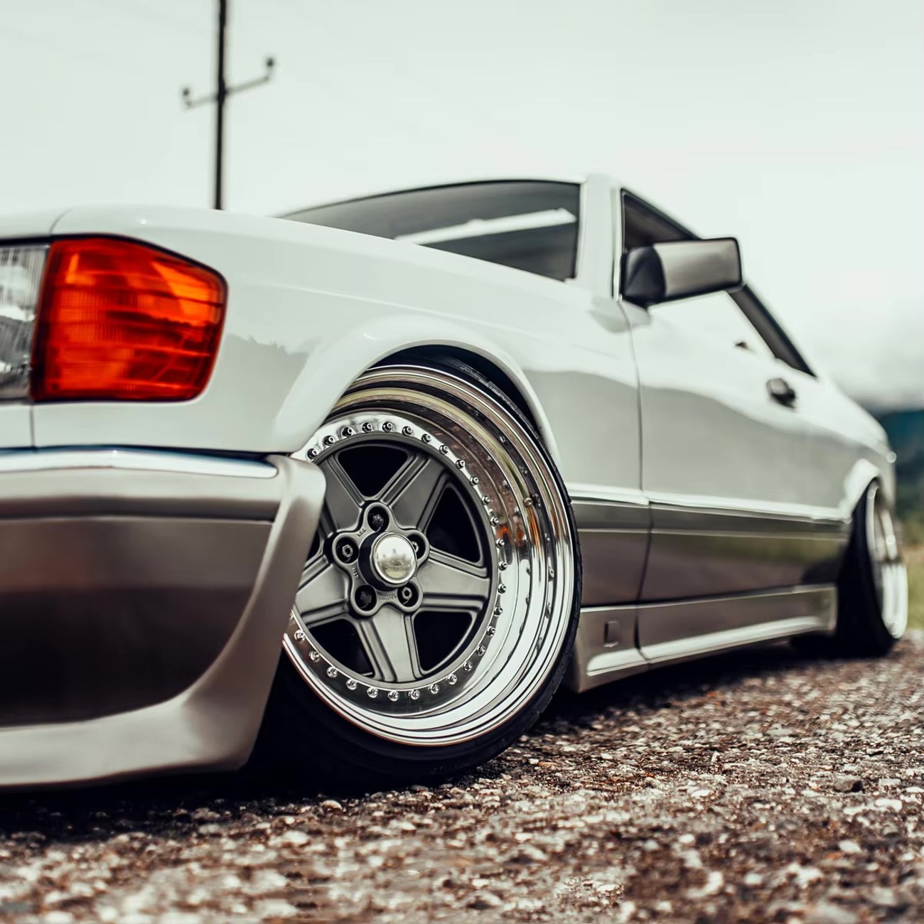 These multi-piece wheels are finished in silver with polished lips and are in excellent condition. The wheels began as original Penta wheels by Ronal and were converted to 3-piece with custom barrels and lips. The wheels will fit various Mercedes-Benz models both classic and modern including the W126, C126, R129, R107, and W124 500E/E500. The wheels remain free from any curb rash or bends.