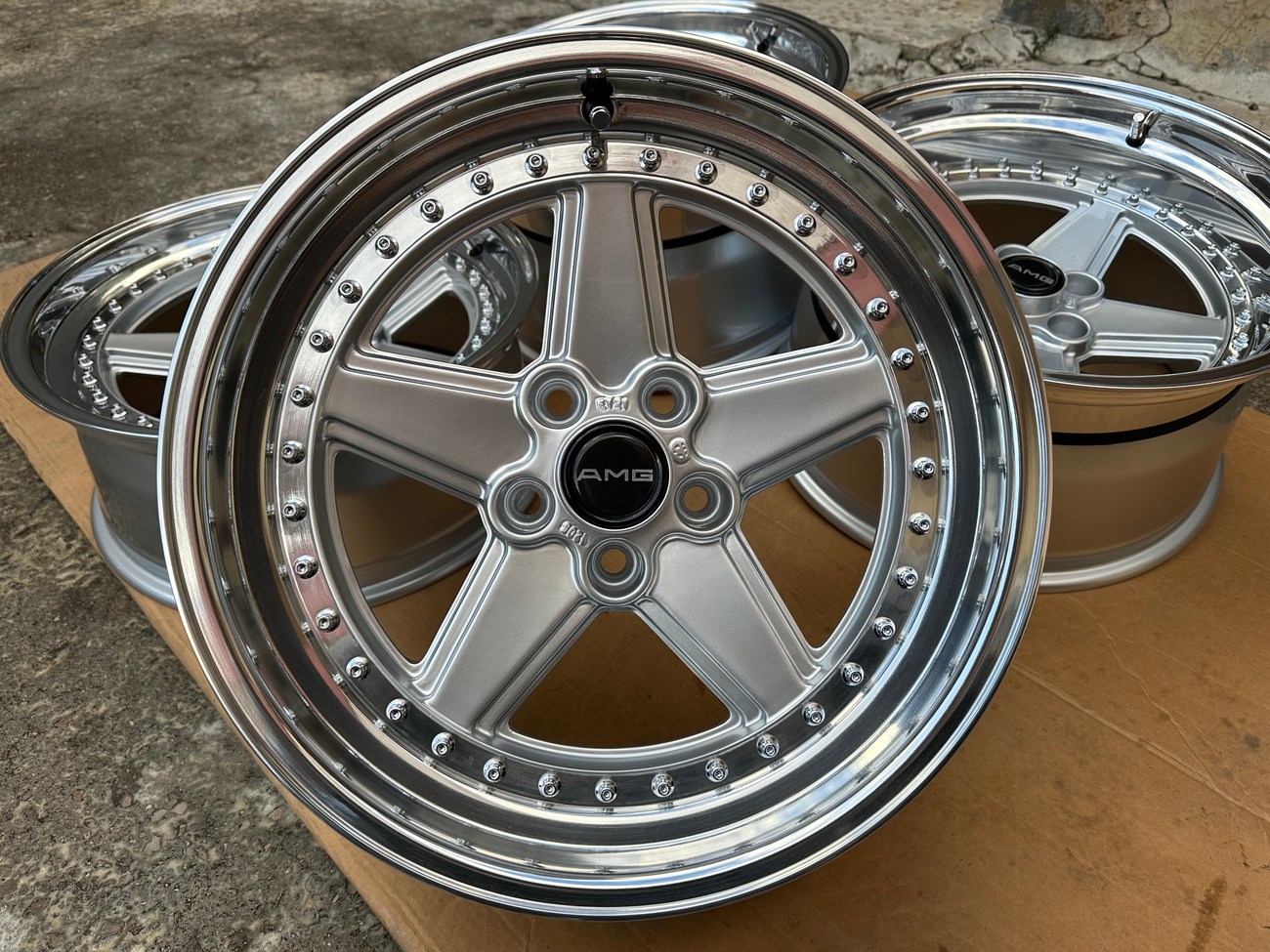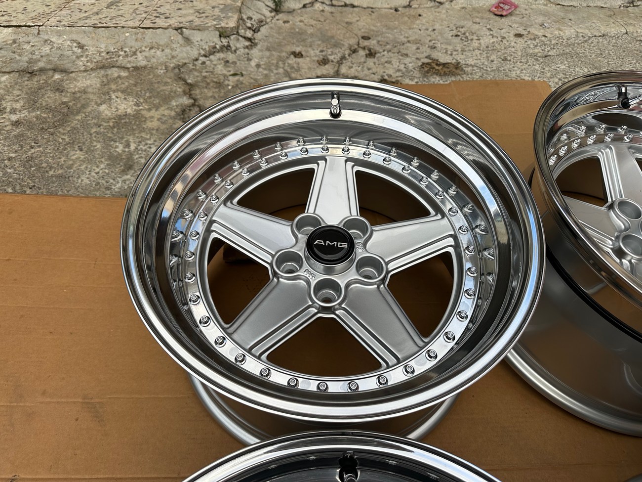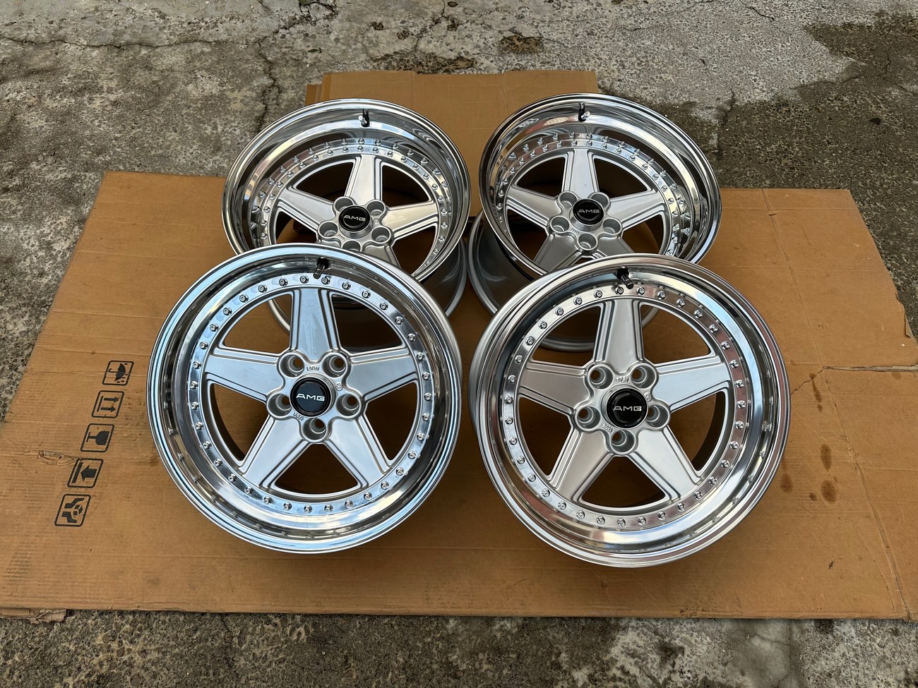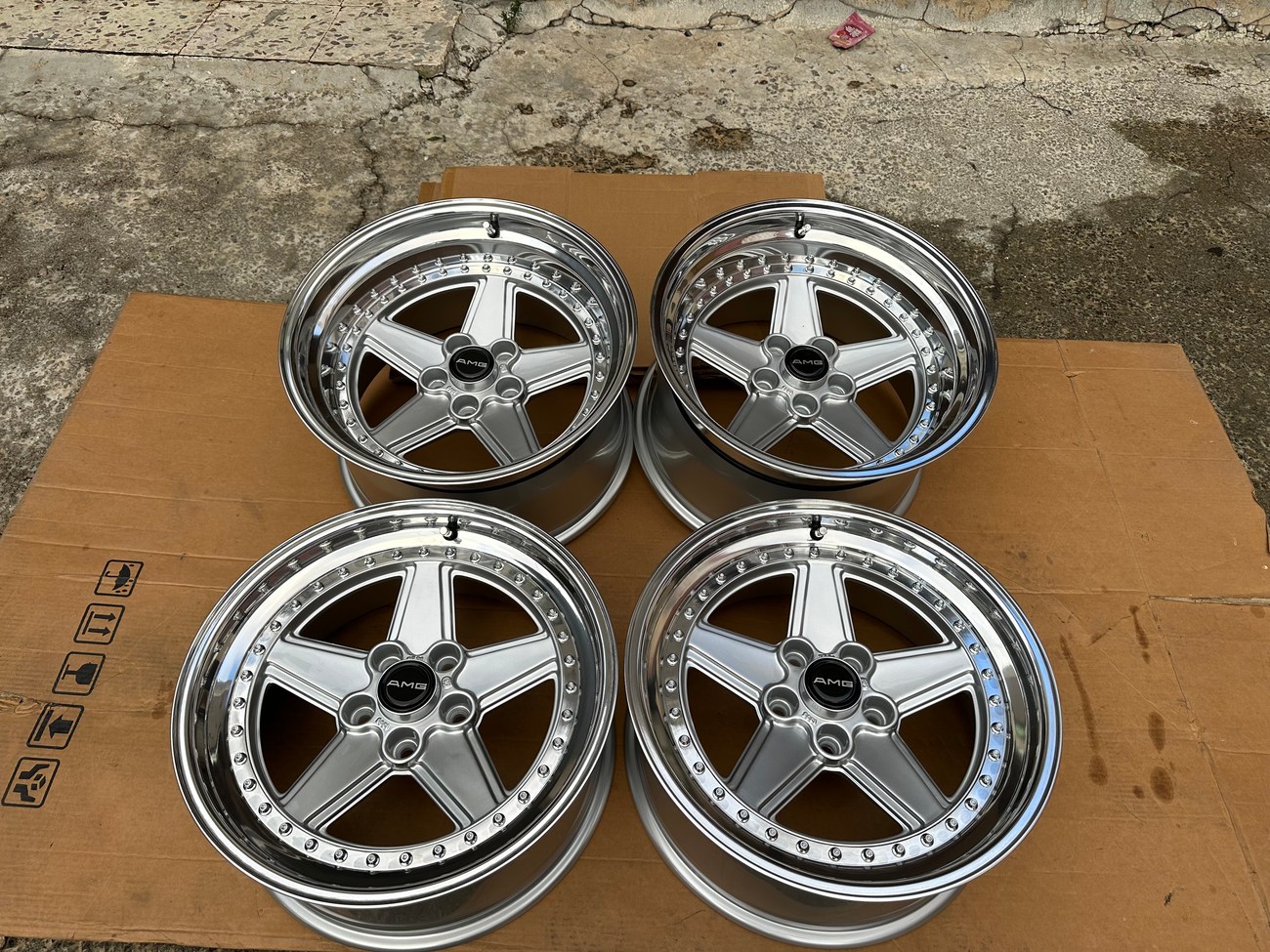 These staggered 17″ Penta wheels measure 8.5″ and 10″ in width and were custom-built for use on various Mercedes-Benz models. The wheels began as original Penta wheels by Ronal and were converted to a 3-piece design allowing for custom sizing. Finished in silver with a polished lip, these wheels feature a 5x112 bolt pattern and an offset of +21. The centers still show a 1988 manufacture date in Italy. The barrels and lips are custom fitted and four premerger AMG center caps are included. These custom 17" wheels are now offered by the seller in Beirut, Lebanon and worldwide shipping quotes are available upon request.