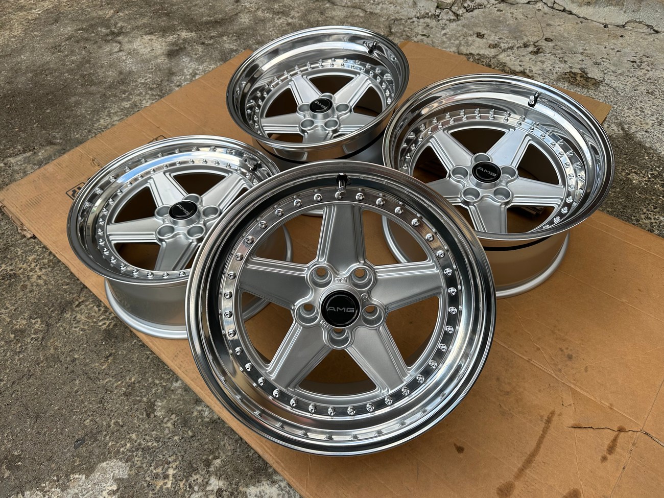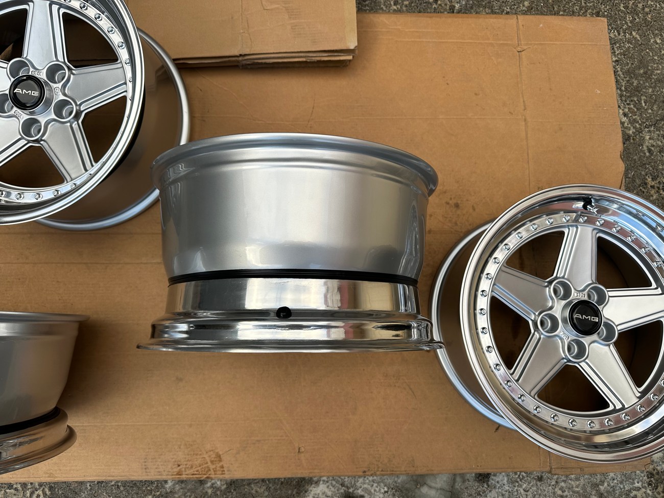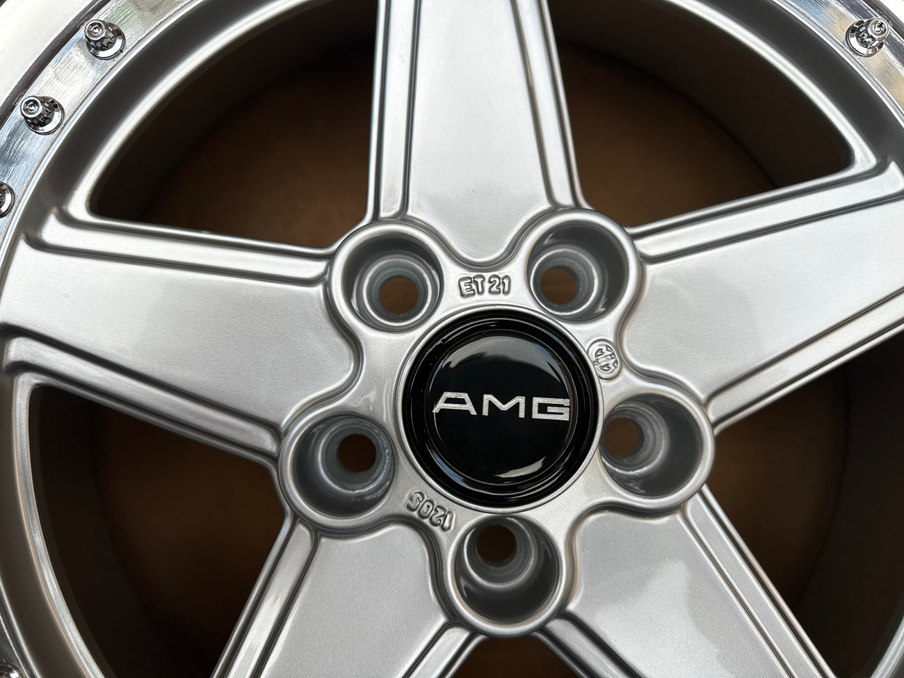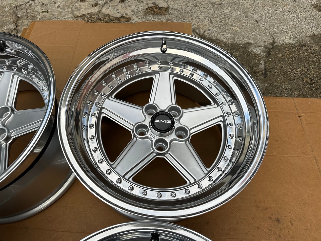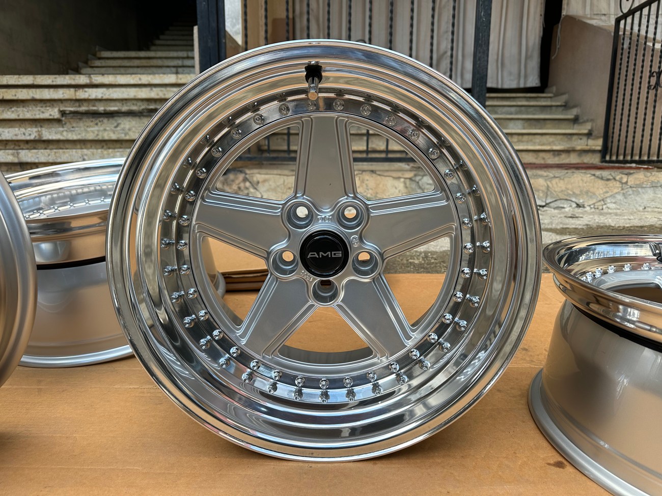 These staggered 17″ Penta wheels measure 8.5″ and 10″ in width and were custom-built for use on various Mercedes-Benz models. The wheels began as original Penta wheels by Ronal and were converted to a 3-piece design allowing for custom sizing. Finished in silver with a polished lip, these wheels feature a 5x112 bolt pattern and an offset of +21. The centers still show a 1988 manufacture date in Italy. The barrels and lips are custom fitted and four premerger AMG center caps are included. These custom 17" wheels are now offered by the seller in Beirut, Lebanon and worldwide shipping quotes are available upon request.