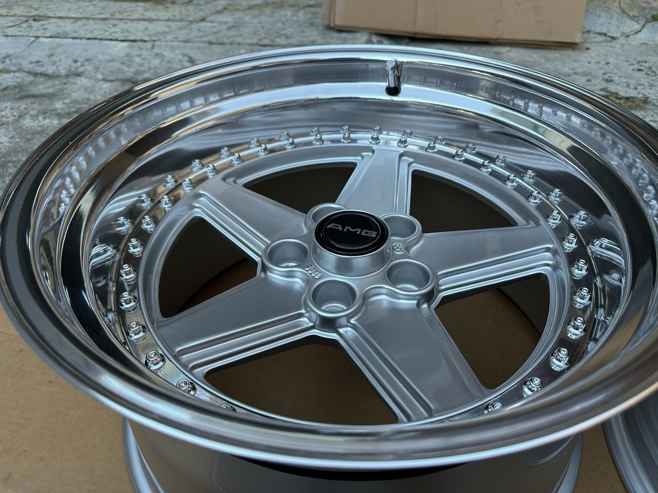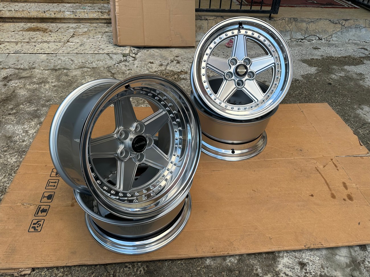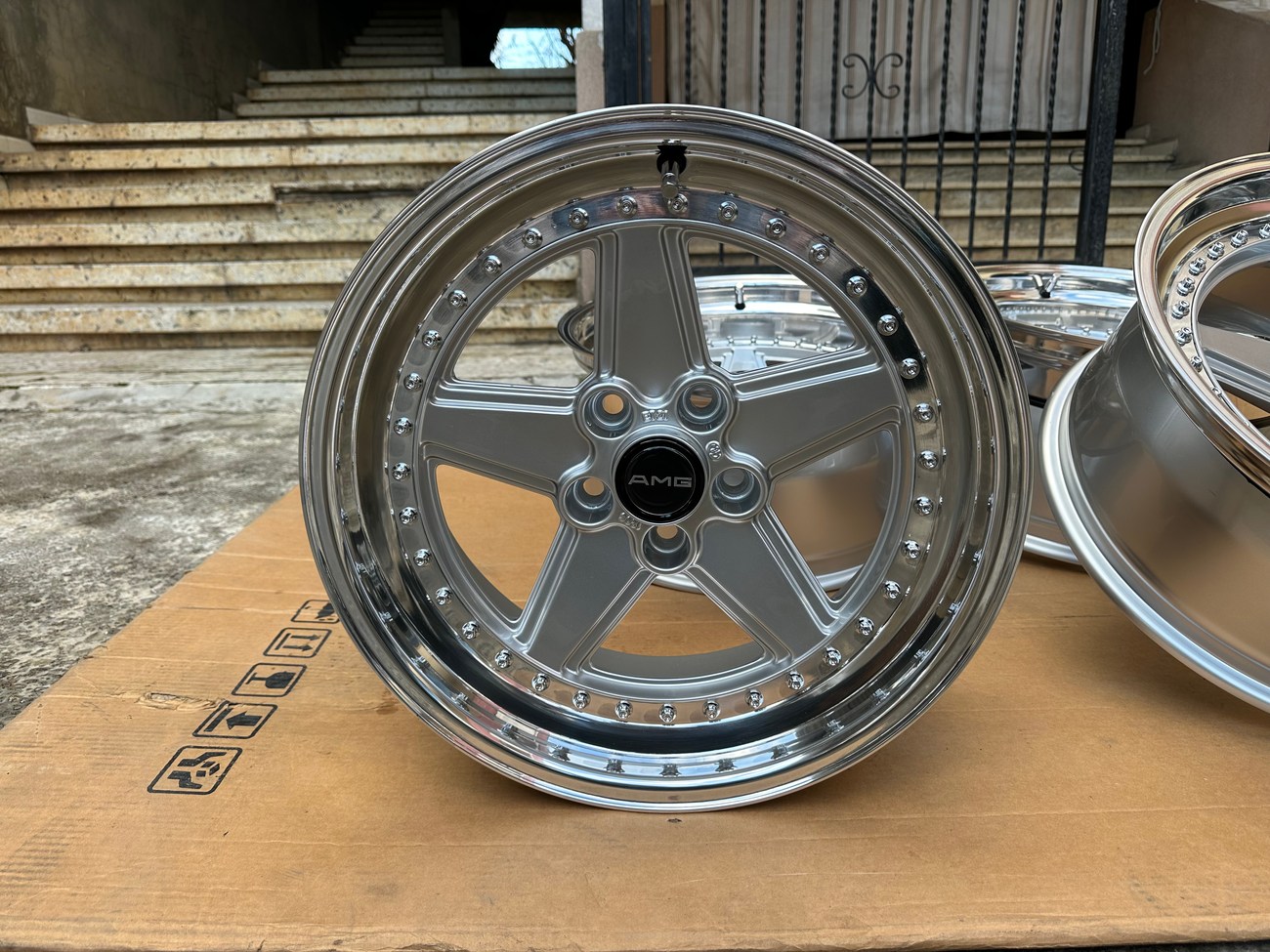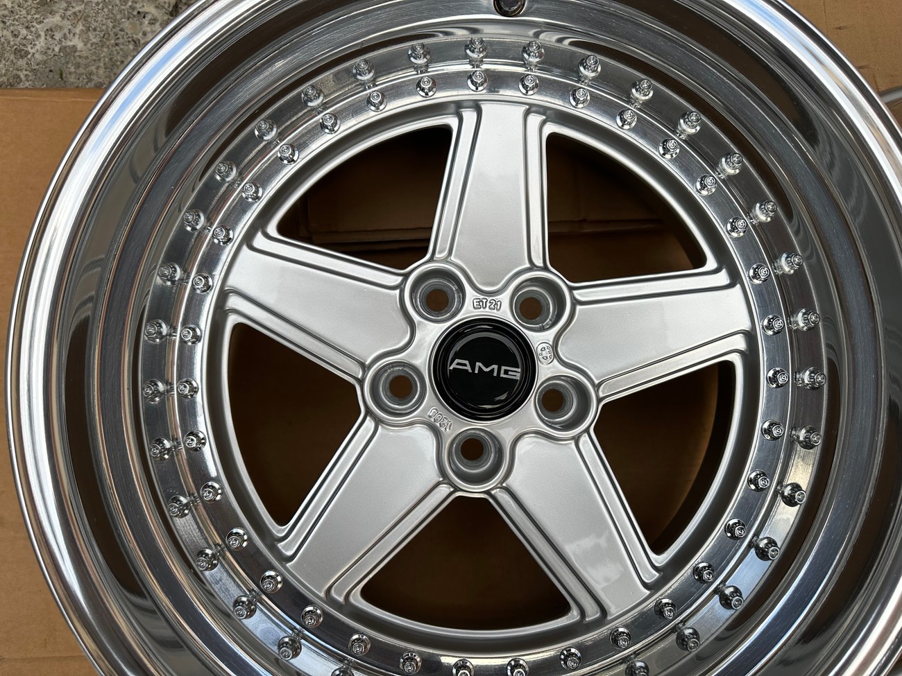 These staggered 17″ Penta wheels measure 8.5″ and 10″ in width and were custom-built for use on various Mercedes-Benz models. The wheels began as original Penta wheels by Ronal and were converted to a 3-piece design allowing for custom sizing. Finished in silver with a polished lip, these wheels feature a 5x112 bolt pattern and an offset of +21. The centers still show a 1988 manufacture date in Italy. The barrels and lips are custom fitted and four premerger AMG center caps are included. These custom 17" wheels are now offered by the seller in Beirut, Lebanon and worldwide shipping quotes are available upon request.