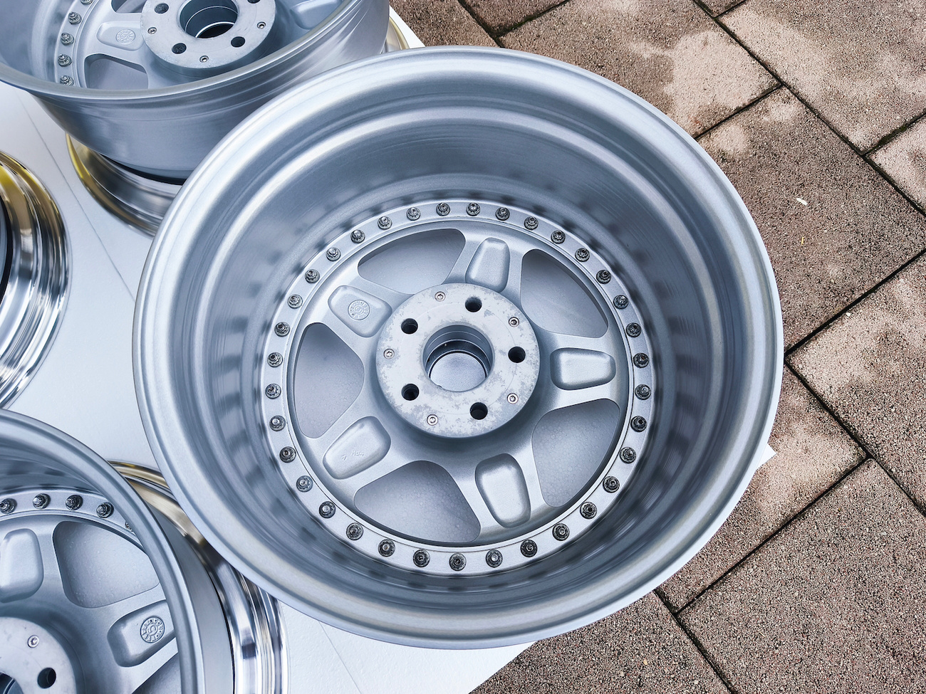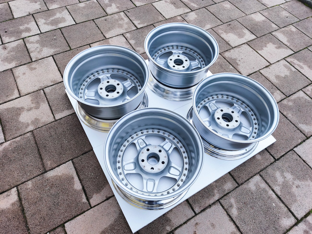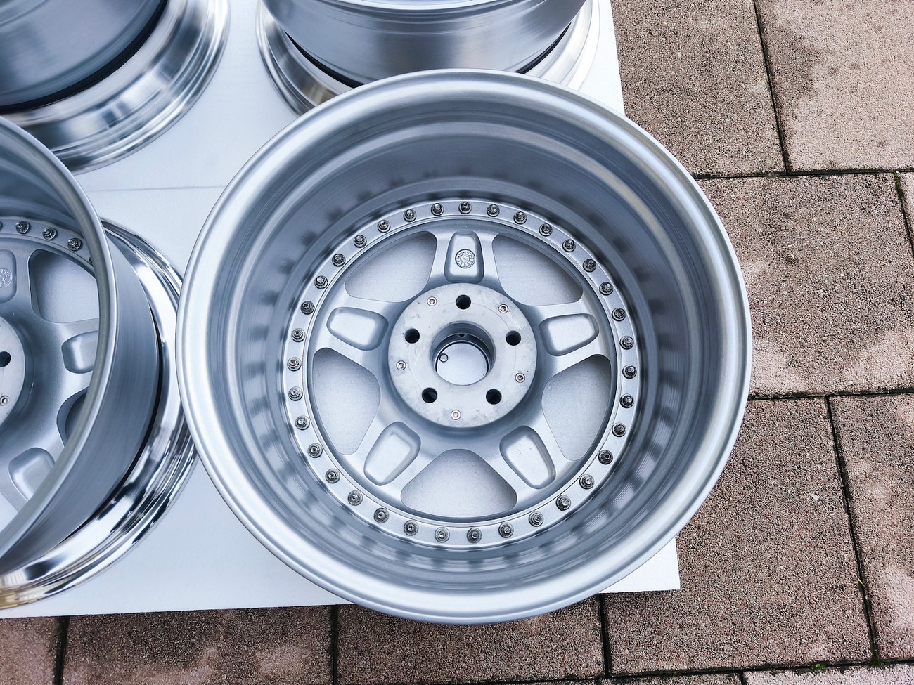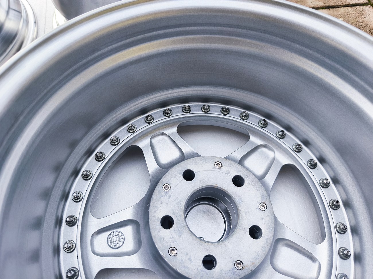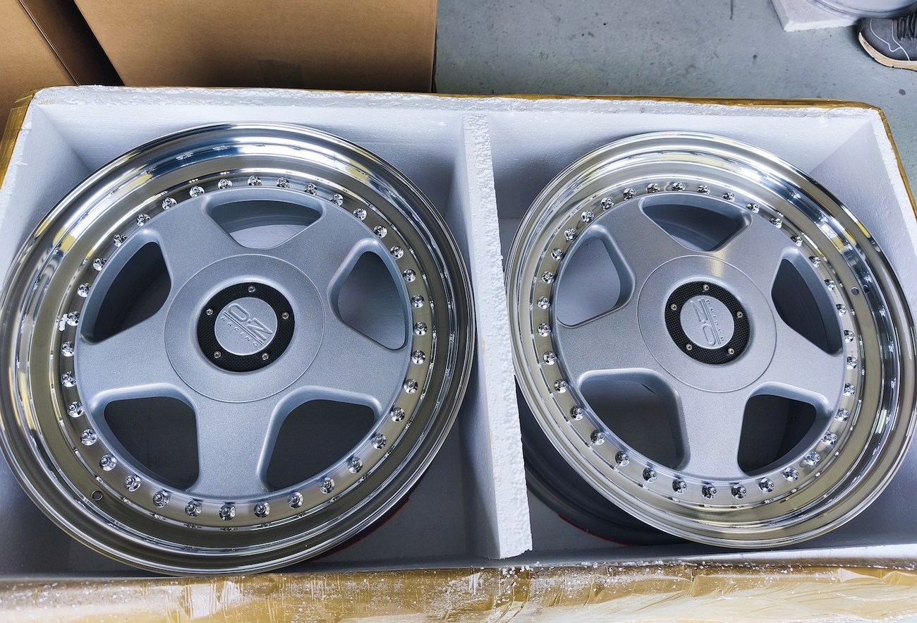 These staggered 3-piece 17" Futura wheels measure 8.5″ wide in the front and 10" wide in the rear, and were manufactured by OZ Racing in Italy. The faces are finished in silver and accented with polished lips and exposed OZ Racing bolts. Dimensions, offsets, and other manufacturer casting marks are present on each wheel and four OZ Racing center caps are included. Each wheel has been professionally refinished in preparation and show in excellent condition. These authentic Futura wheels are now offered by the seller in Samobor, Croatia and shipping is available at the buyer's expense.