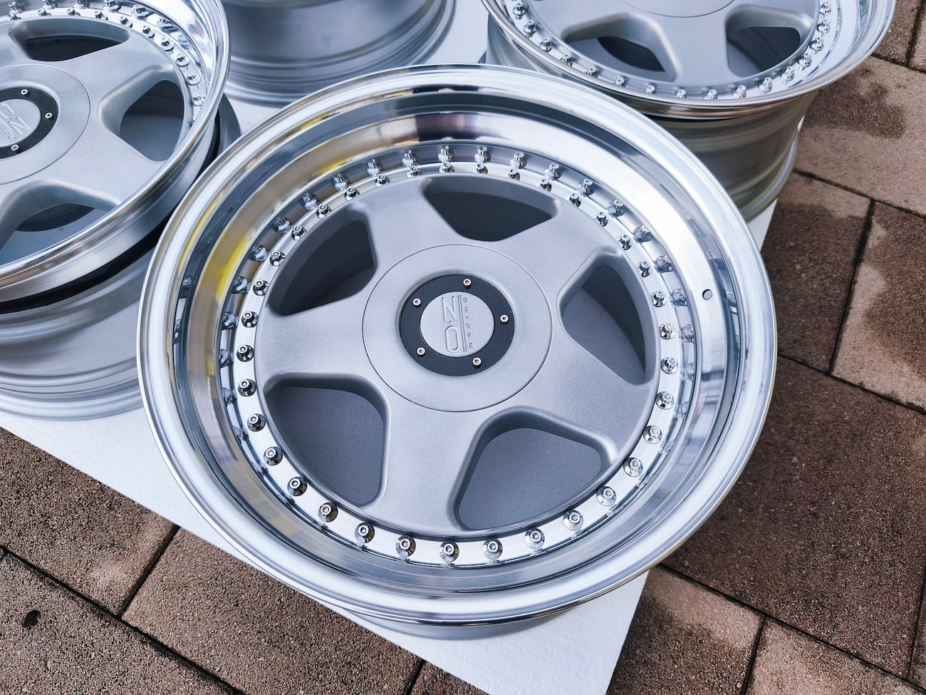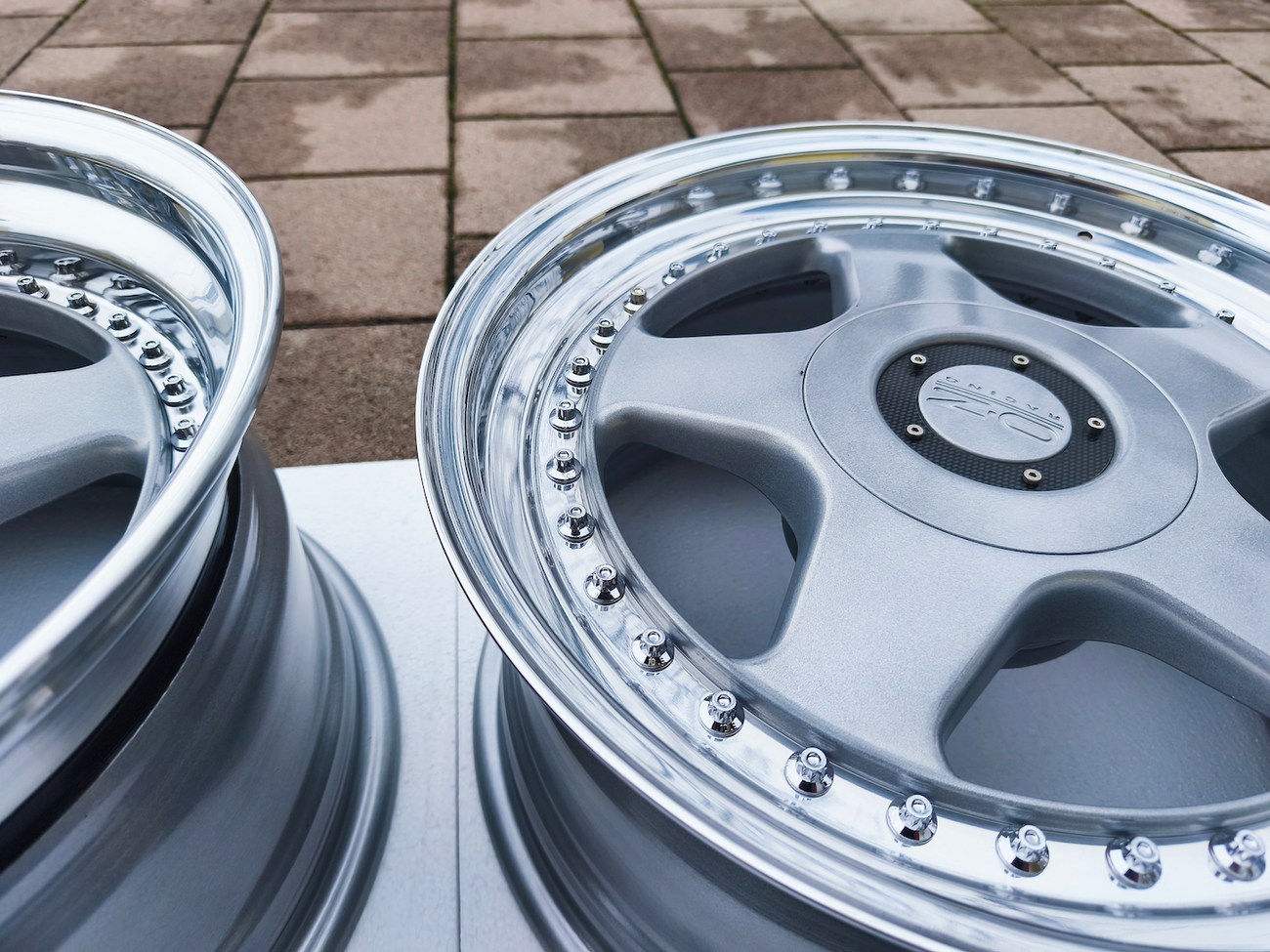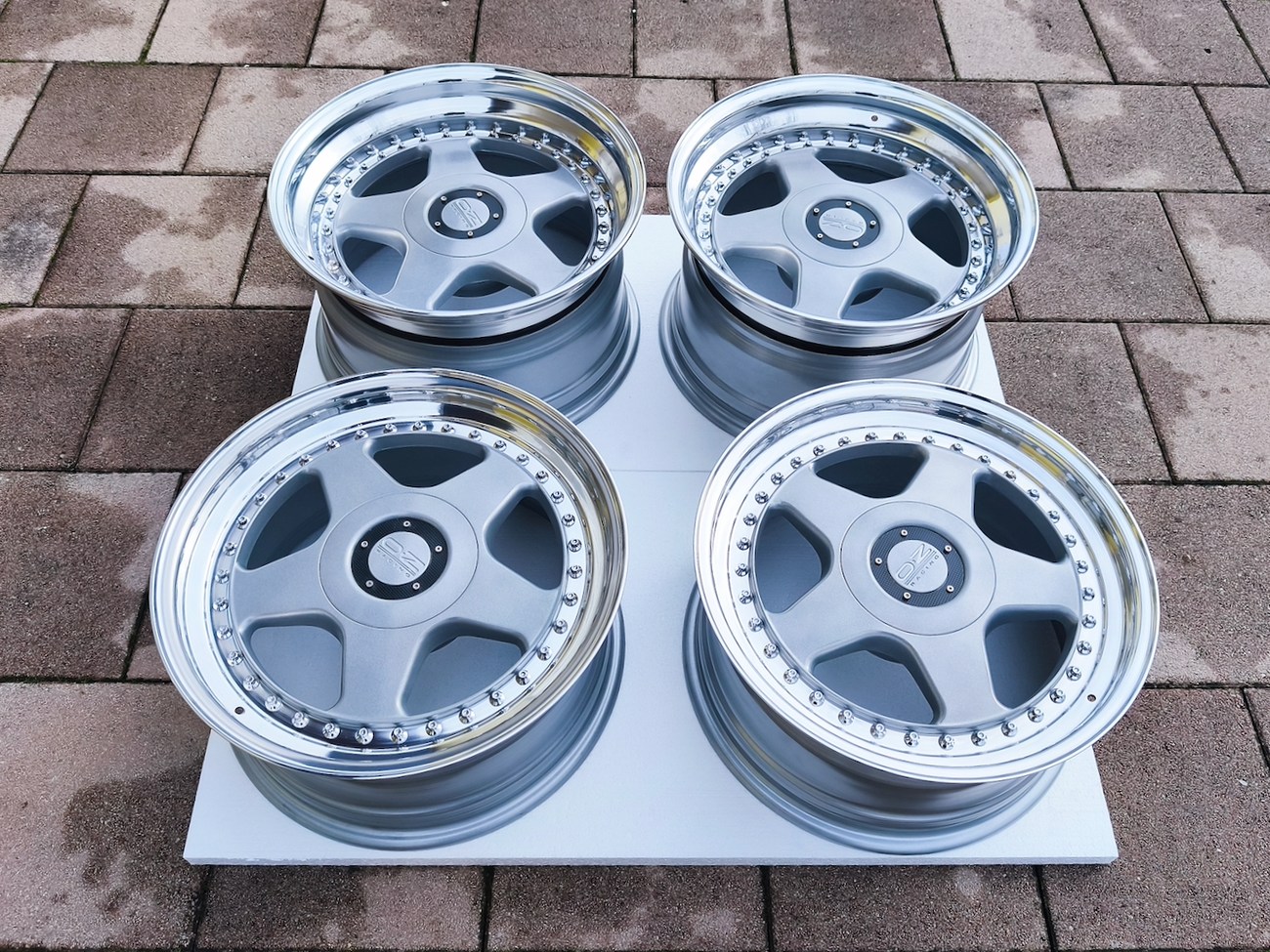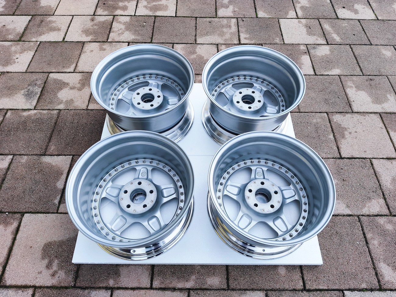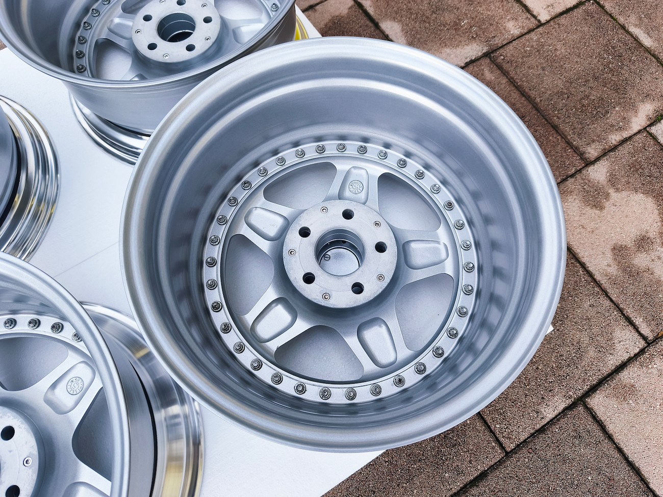 These staggered 3-piece 17" Futura wheels measure 8.5″ wide in the front and 10" wide in the rear, and were manufactured by OZ Racing in Italy. The faces are finished in silver and accented with polished lips and exposed OZ Racing bolts. Dimensions, offsets, and other manufacturer casting marks are present on each wheel and four OZ Racing center caps are included. Each wheel has been professionally refinished in preparation and show in excellent condition. These authentic Futura wheels are now offered by the seller in Samobor, Croatia and shipping is available at the buyer's expense.