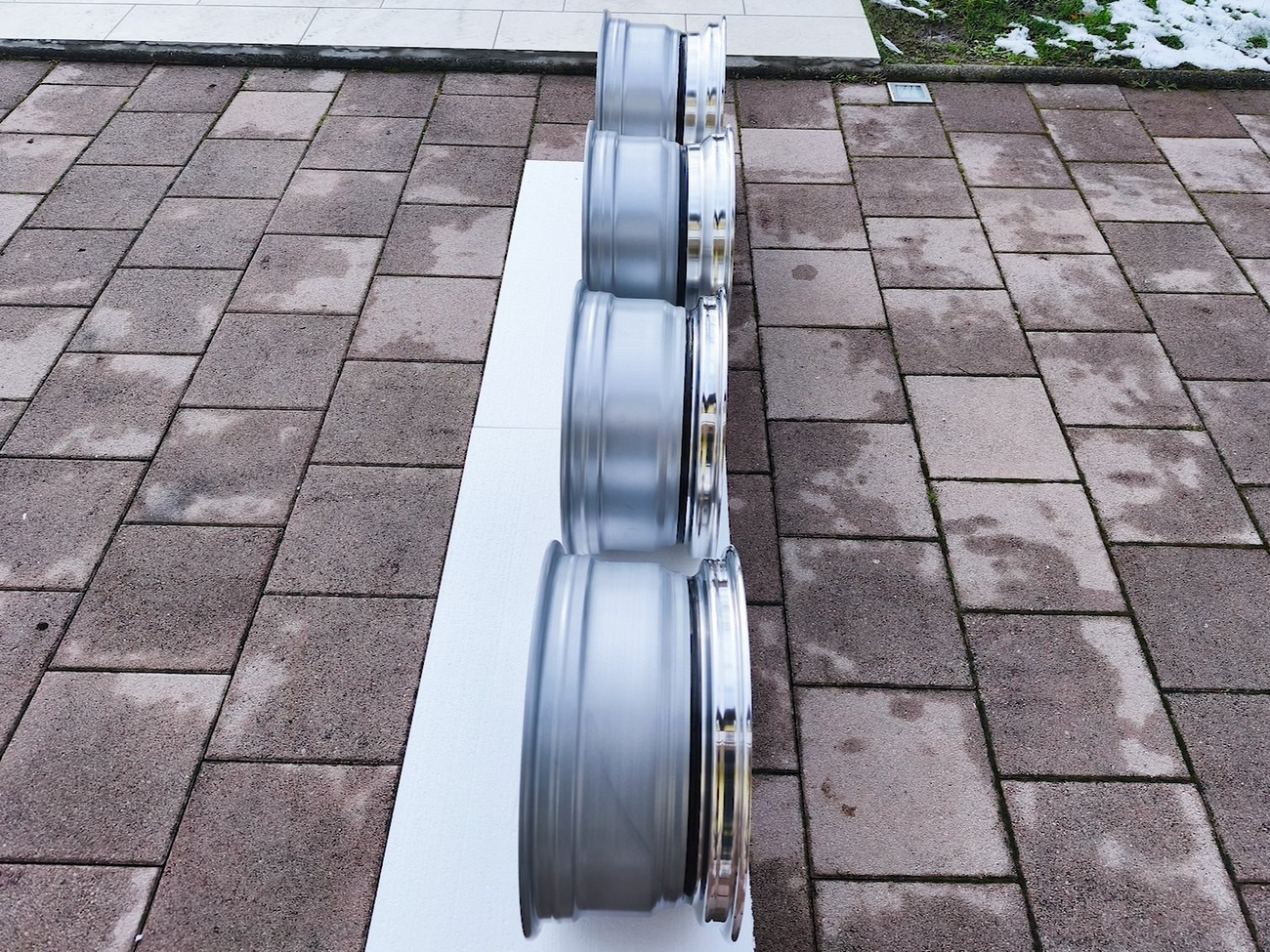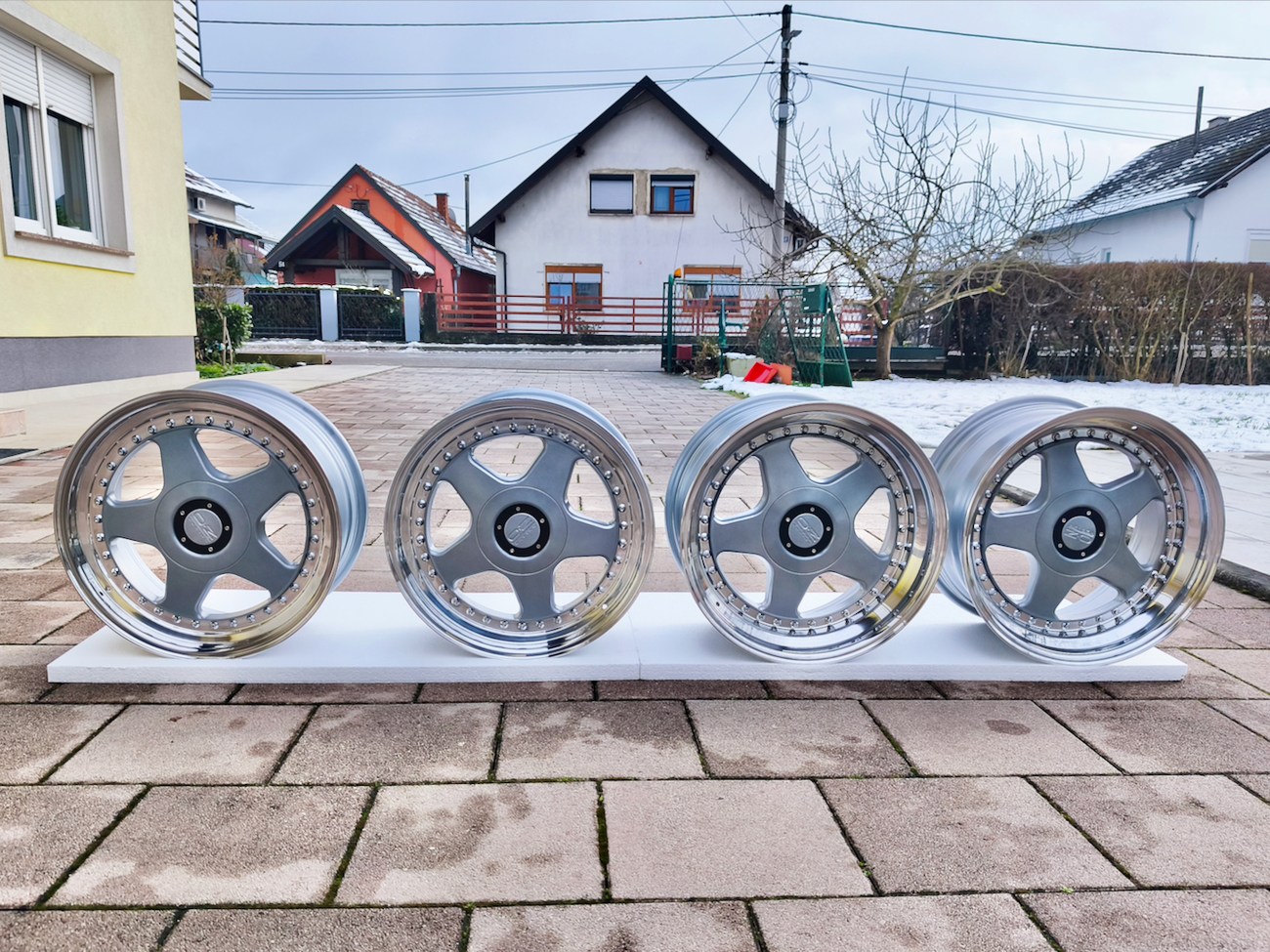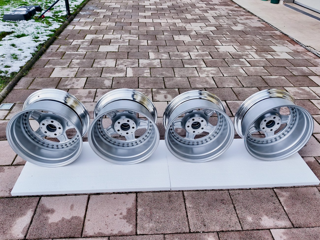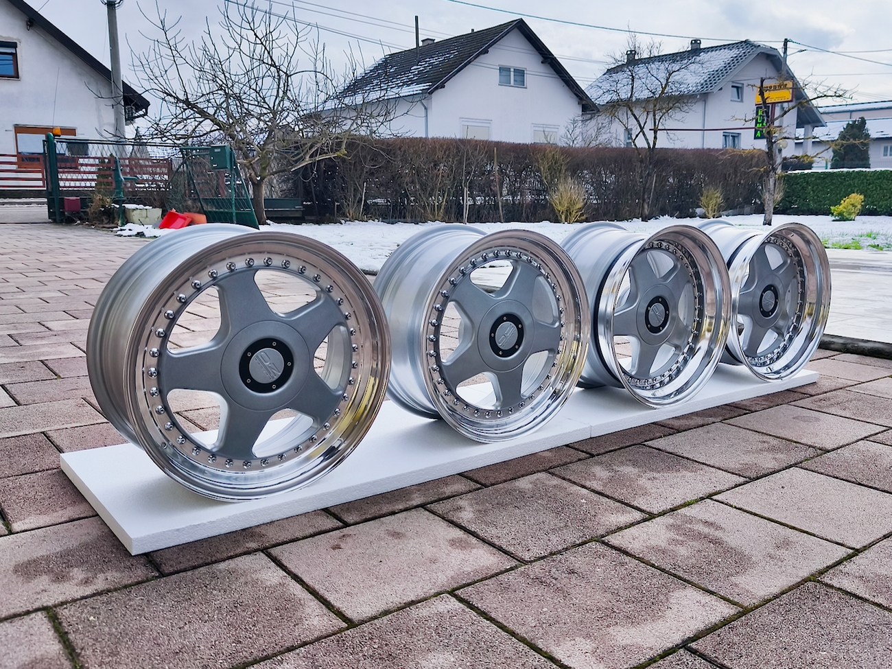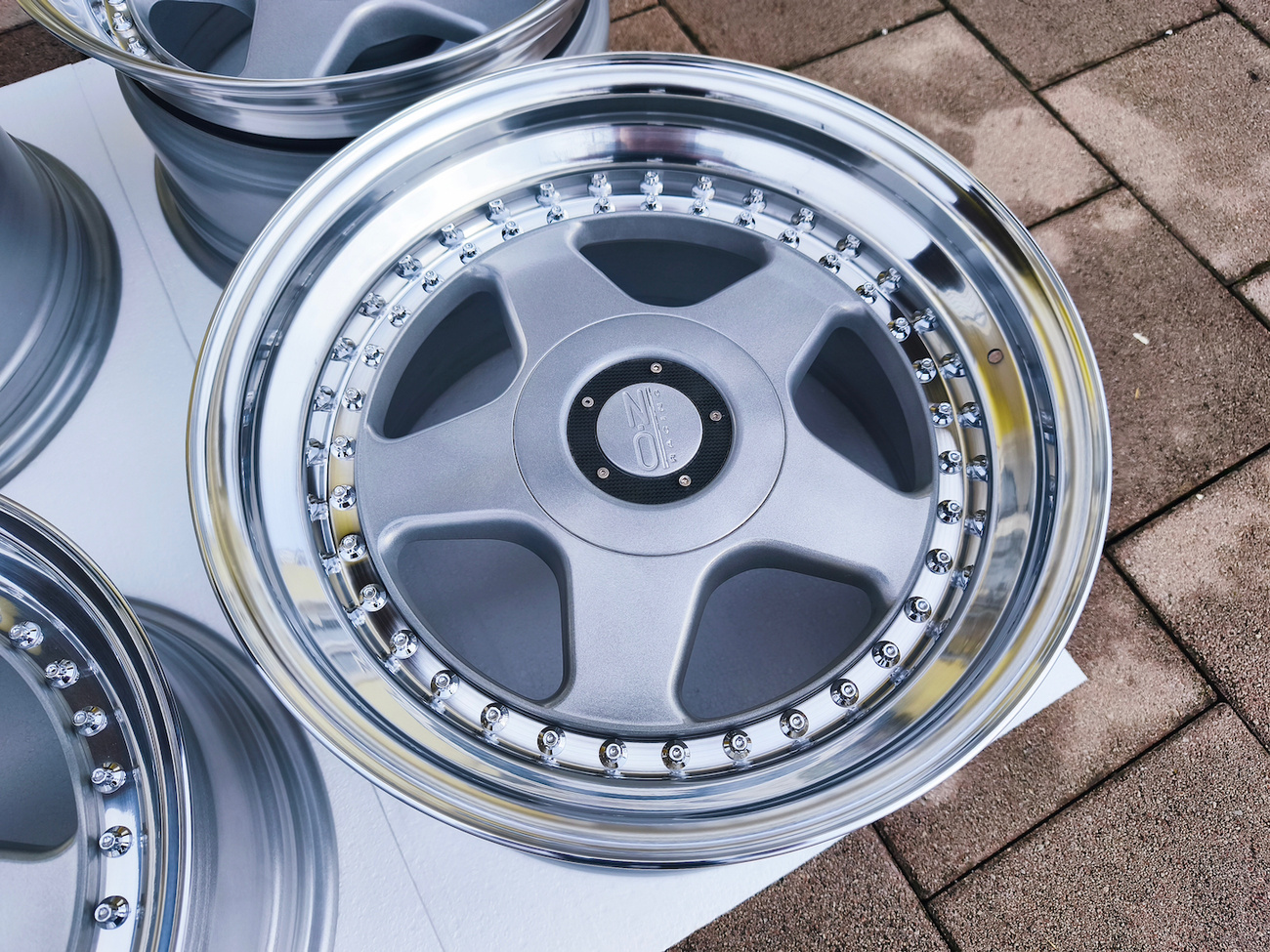 These staggered 3-piece 17" Futura wheels measure 8.5″ wide in the front and 10" wide in the rear, and were manufactured by OZ Racing in Italy. The faces are finished in silver and accented with polished lips and exposed OZ Racing bolts. Dimensions, offsets, and other manufacturer casting marks are present on each wheel and four OZ Racing center caps are included. Each wheel has been professionally refinished in preparation and show in excellent condition. These authentic Futura wheels are now offered by the seller in Samobor, Croatia and shipping is available at the buyer's expense.