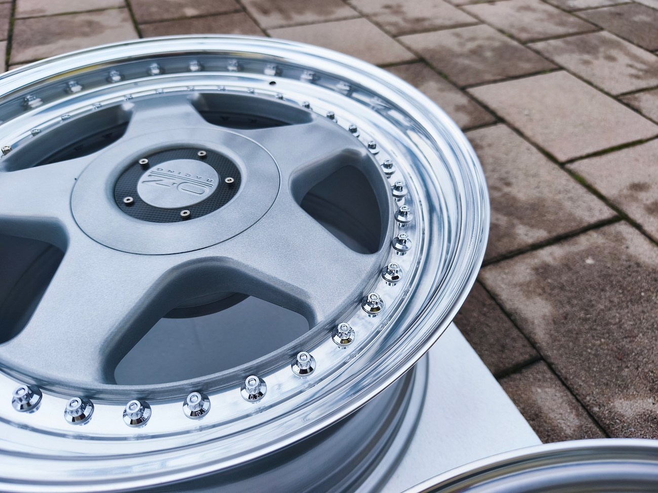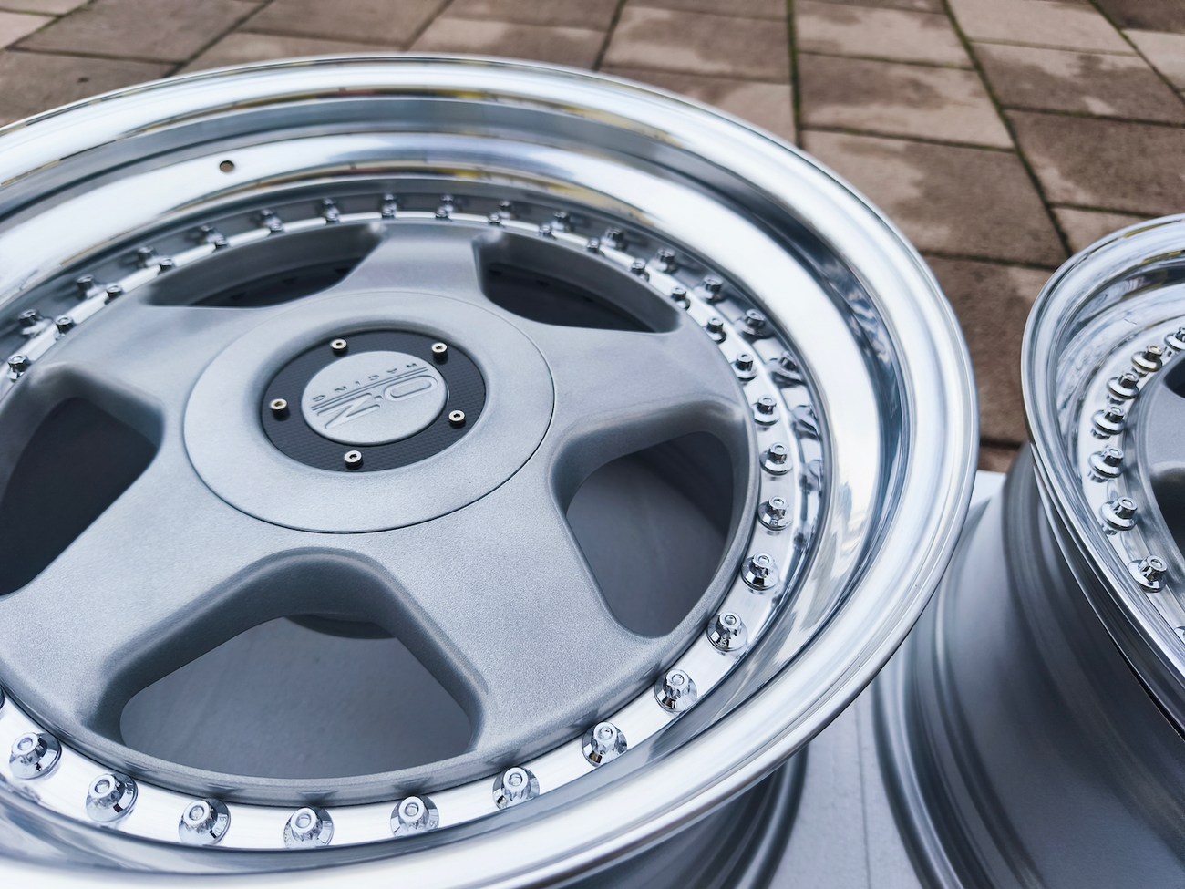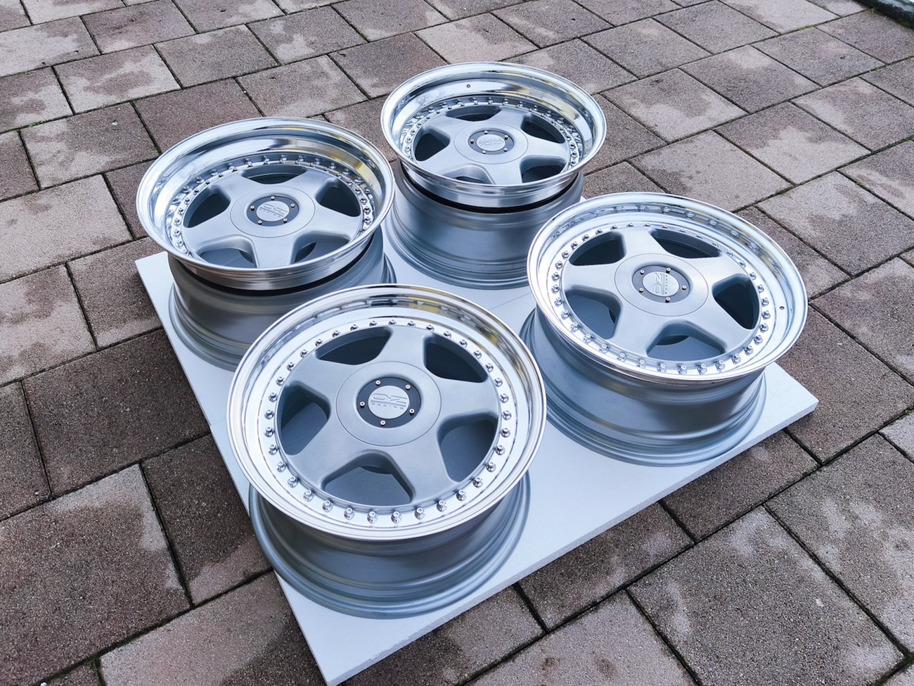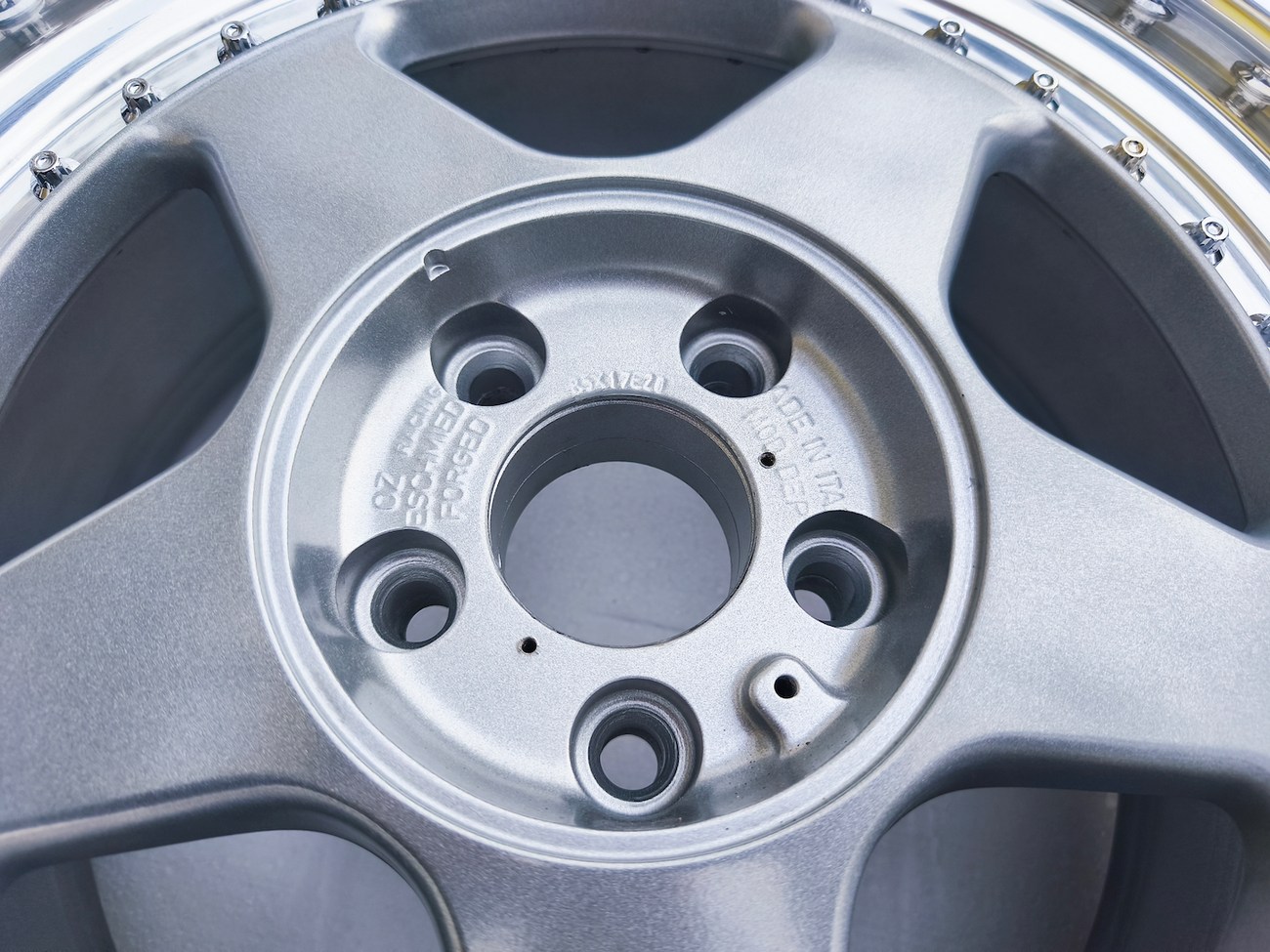 These 5-spoke OZ wheels feature a 3-piece design with exposed OZ Racing bolts around the lip. The faces are powder-coated in silver while the lips are polished and benefit from a recent professional refinish. Up close photos of each face are provided in the gallery showing stamped OZ Racing bolts and no imperfections are noted.