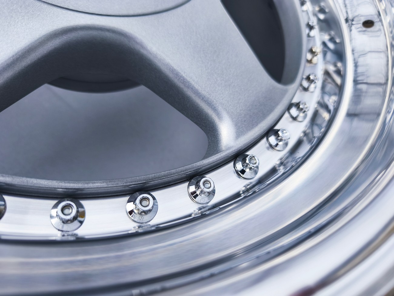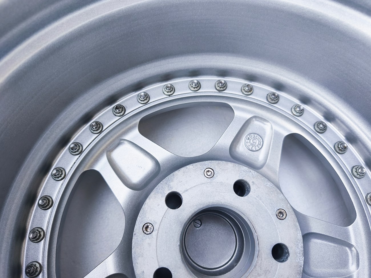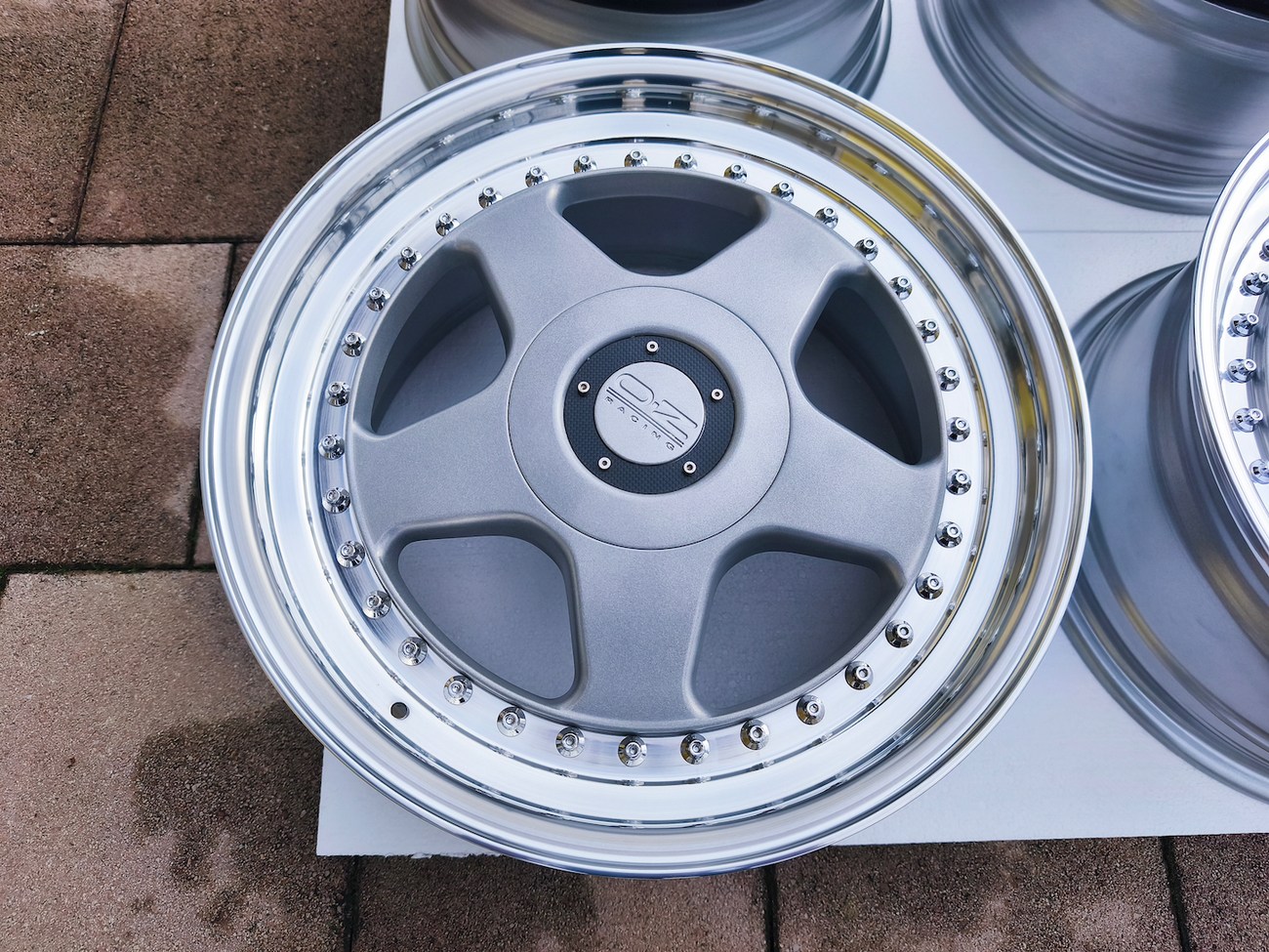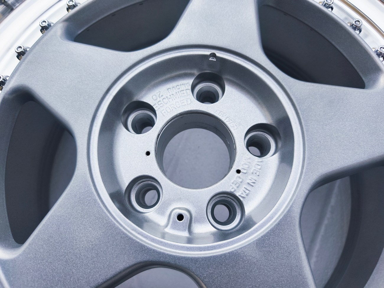 These 5-spoke OZ wheels feature a 3-piece design with exposed OZ Racing bolts around the lip. The faces are powder-coated in silver while the lips are polished and benefit from a recent professional refinish. Up close photos of each face are provided in the gallery showing stamped OZ Racing bolts and no imperfections are noted.