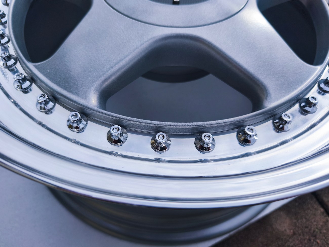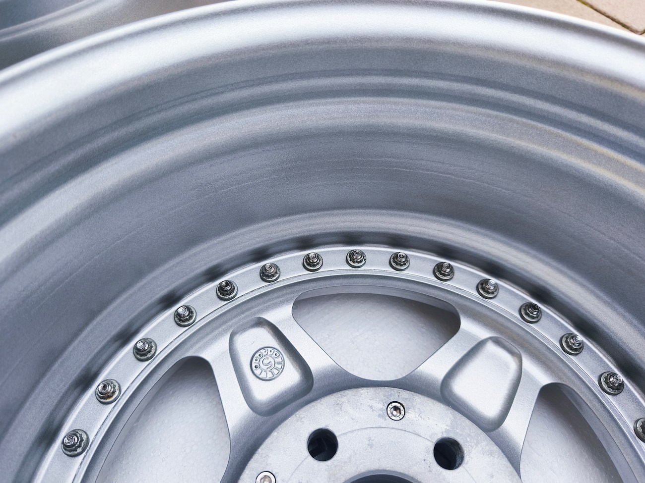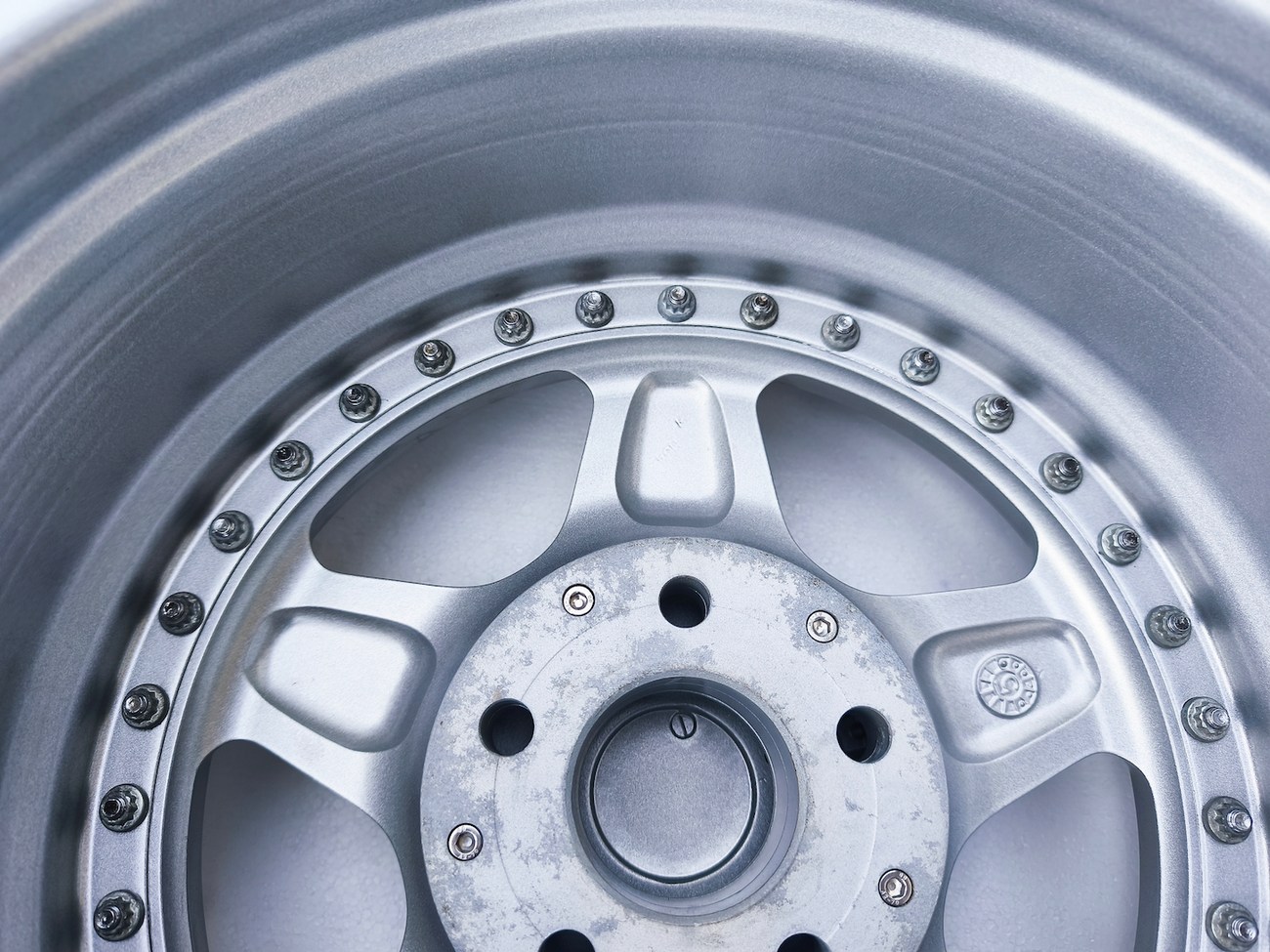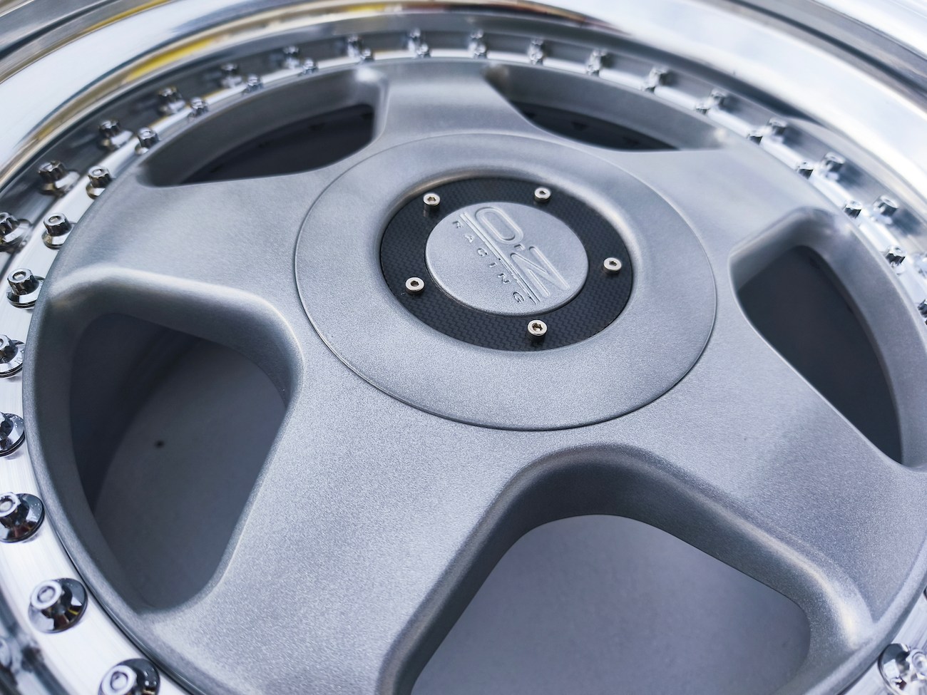These 5-spoke OZ wheels feature a 3-piece design with exposed OZ Racing bolts around the lip. The faces are powder-coated in silver while the lips are polished and benefit from a recent professional refinish. Up close photos of each face are provided in the gallery showing stamped OZ Racing bolts and no imperfections are noted.