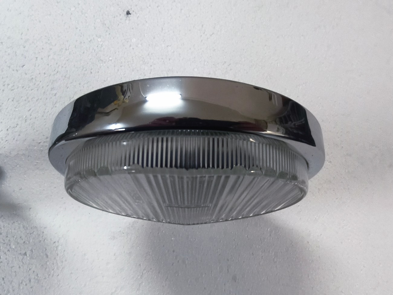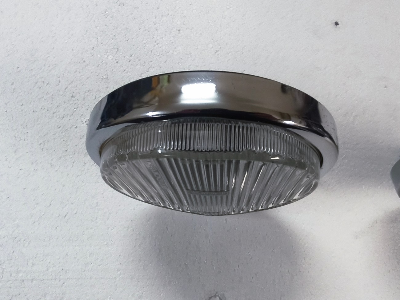 Each light features a chrome bezel surround measuring approximately 163mm in diameter, with the glass portion making up 142mm of that total. There are very minor signs of dots/specks from long-term storage. The back of each light has a matte black finish and mounting points are located at the bottom.